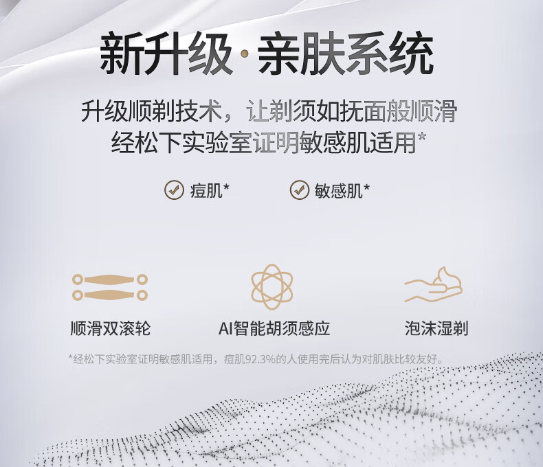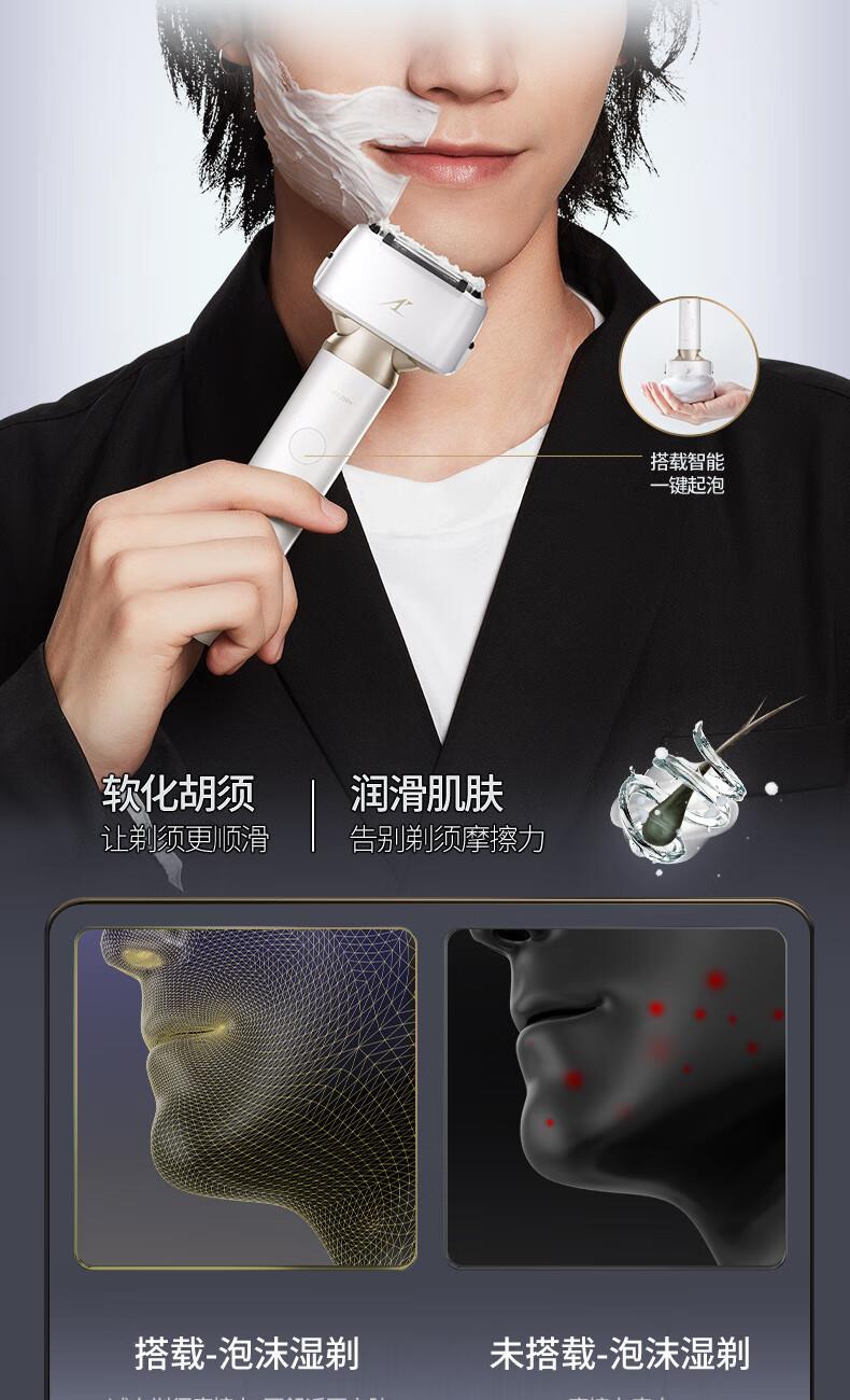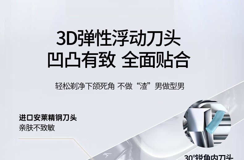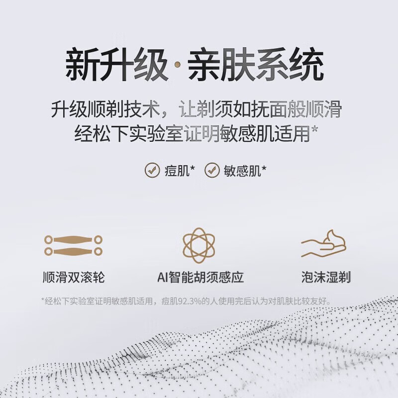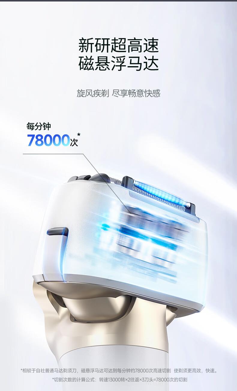 颜色:白色 尺寸: 长110mm;宽77mm;高210mm 续航时间:50分钟 净重:440g 三刀头搭载SkinCare顺滑双滚轮, 不易拉扯,更顺滑 AI智能胡须感应,智控调速,有效降低肌肤负担 新研超高速磁悬浮马达,每分钟转速高达78000次 3D弹性浮动刀头,凹凸有致,全面贴合