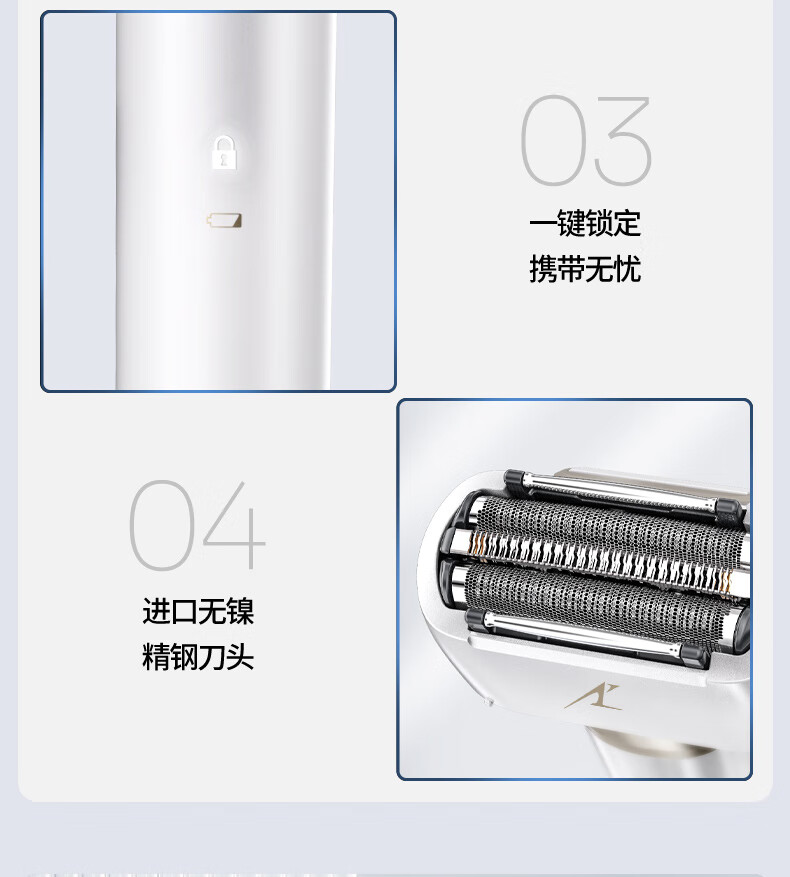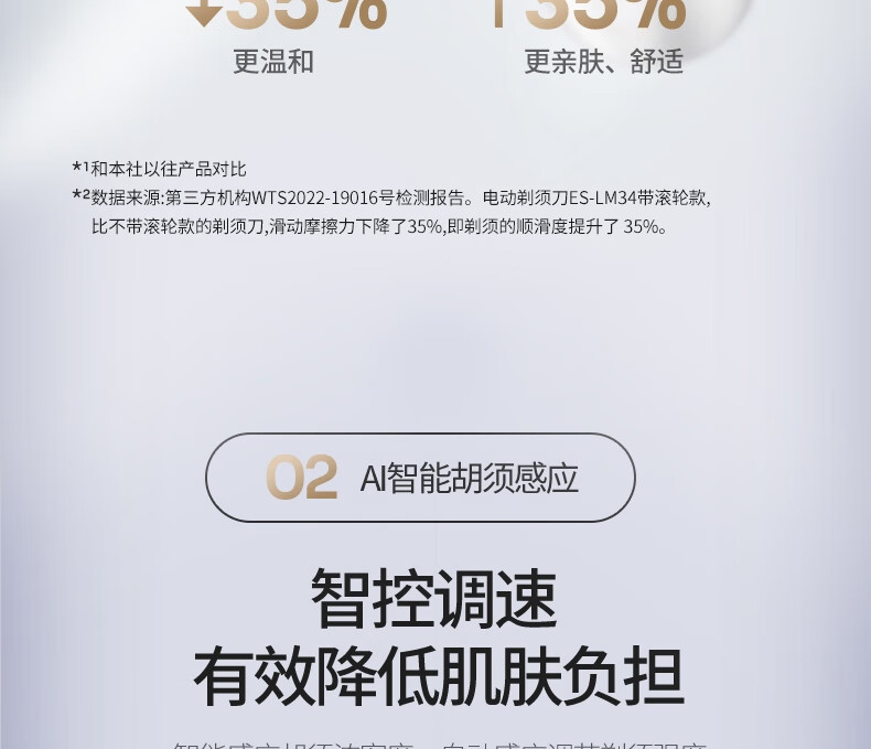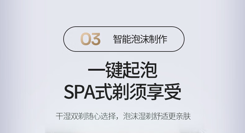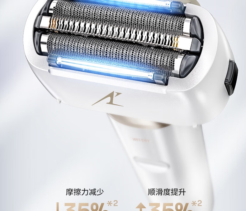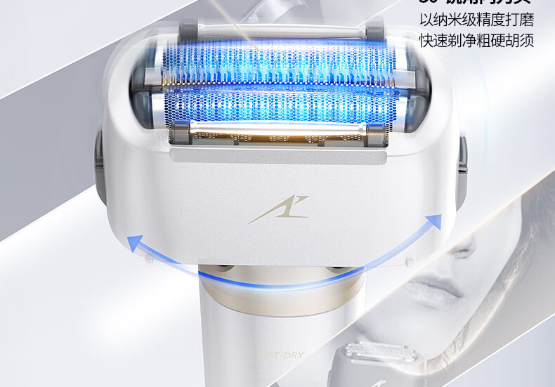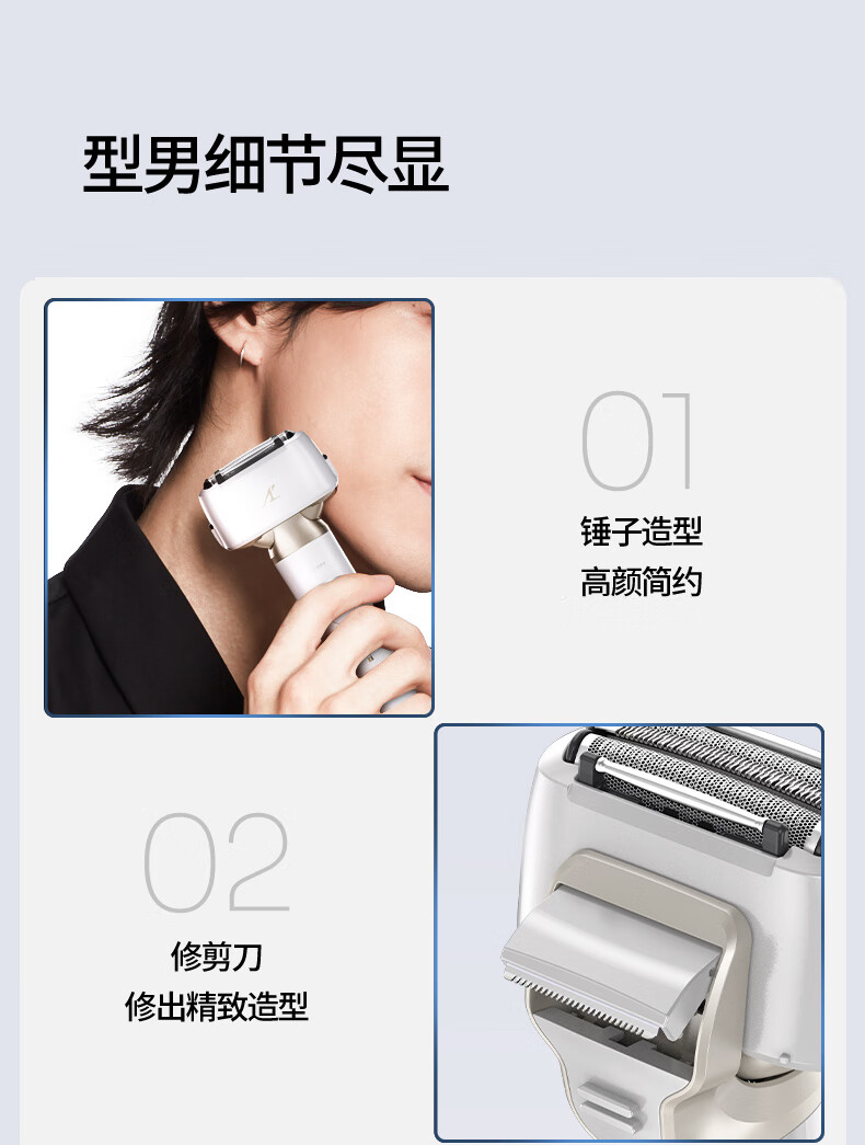 颜色:白色 尺寸: 长110mm;宽77mm;高210mm 续航时间:50分钟 净重:440g 三刀头搭载SkinCare顺滑双滚轮, 不易拉扯,更顺滑 AI智能胡须感应,智控调速,有效降低肌肤负担 新研超高速磁悬浮马达,每分钟转速高达78000次 3D弹性浮动刀头,凹凸有致,全面贴合