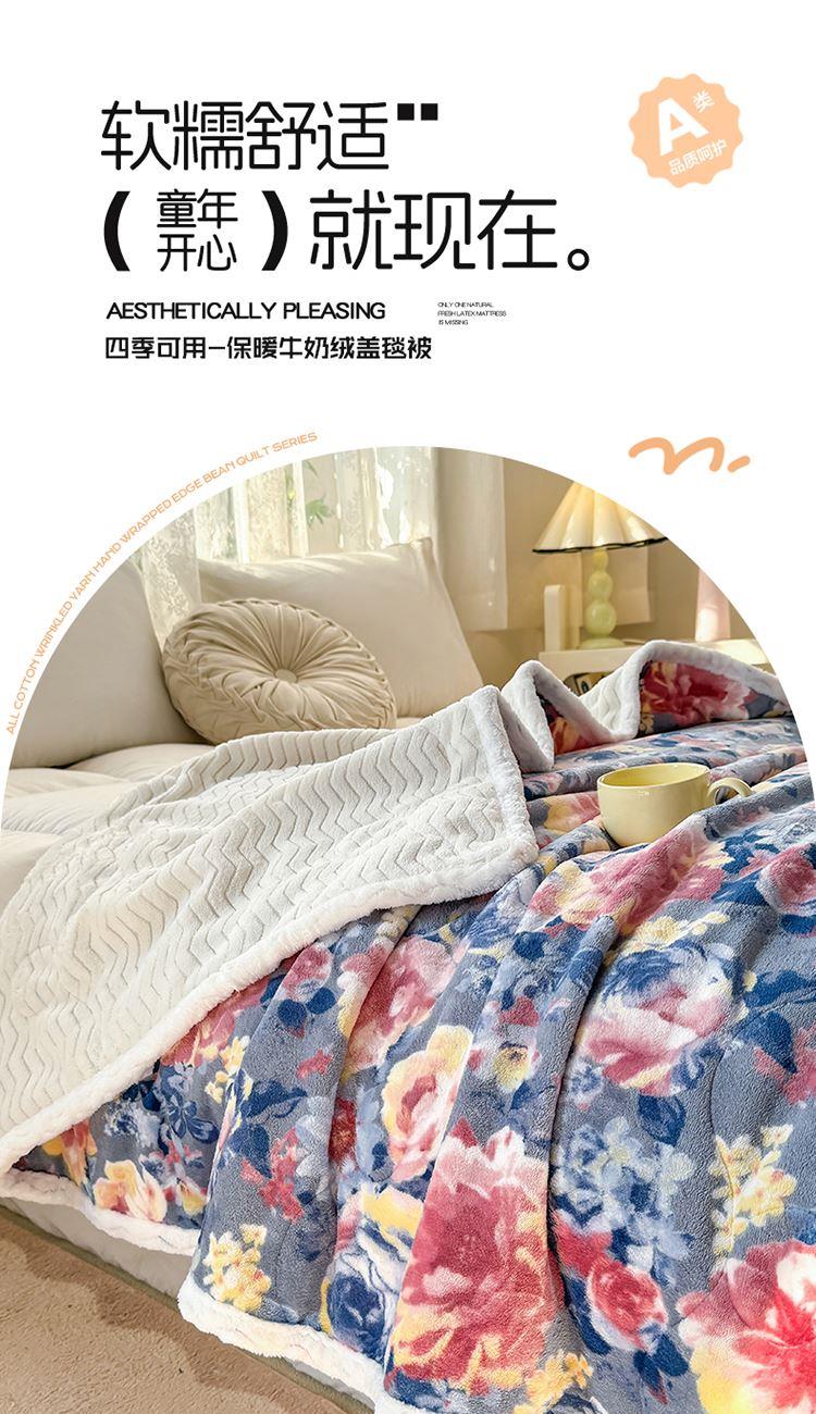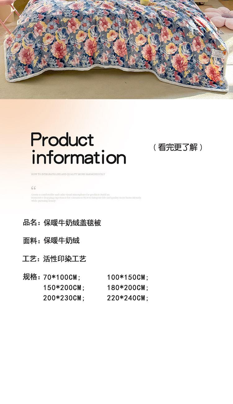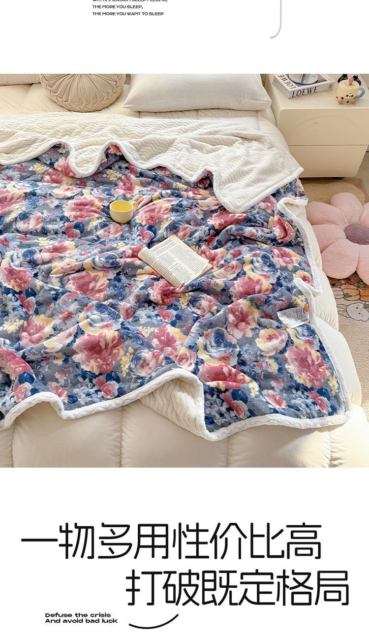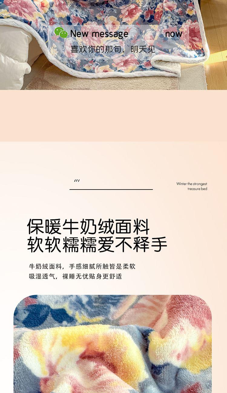 1:冬日暖阳与美梦相拥享受温暖的浪漫全新升级牛奶绒多功能夹棉盖毯被三层加厚锁温毯 专注打造温馨的家 尺寸150x200cm单毛毯 面料:牛奶绒+贝贝绒三层夹棉盖毯被 特点:盖垫两用速热保暖 包装:彩盒 重量:1.6kg