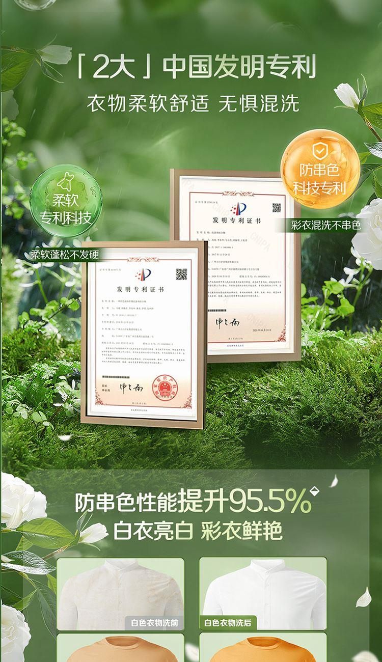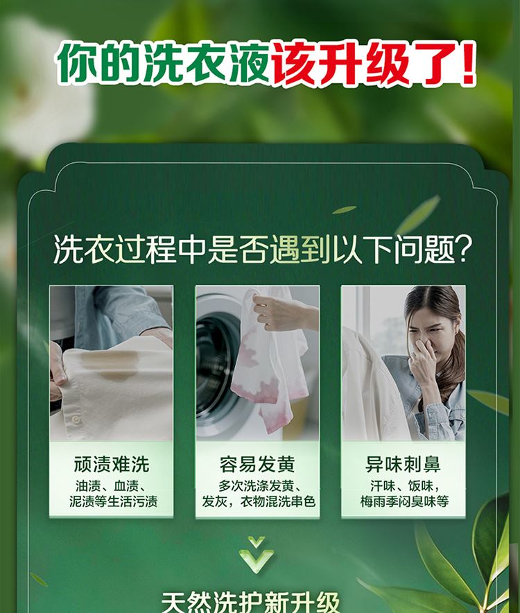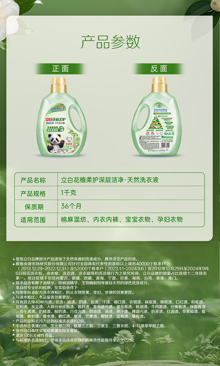 保质期限:3年 主要成分:表面活性剂、防串色剂、抗再沉积剂、着色剂、香精、防腐剂、柔软因子、天然来源成分(天然椰子油精华、棕榈油精华、天然酵素、烷基糖苷APG、山茶花精粹、牛油果提取物、柠檬香茅提取物) 产品功效:洁净更柔软 防发黄变 适用范围:棉麻混纺、内衣内裤、宝宝衣物、孕妇衣物
