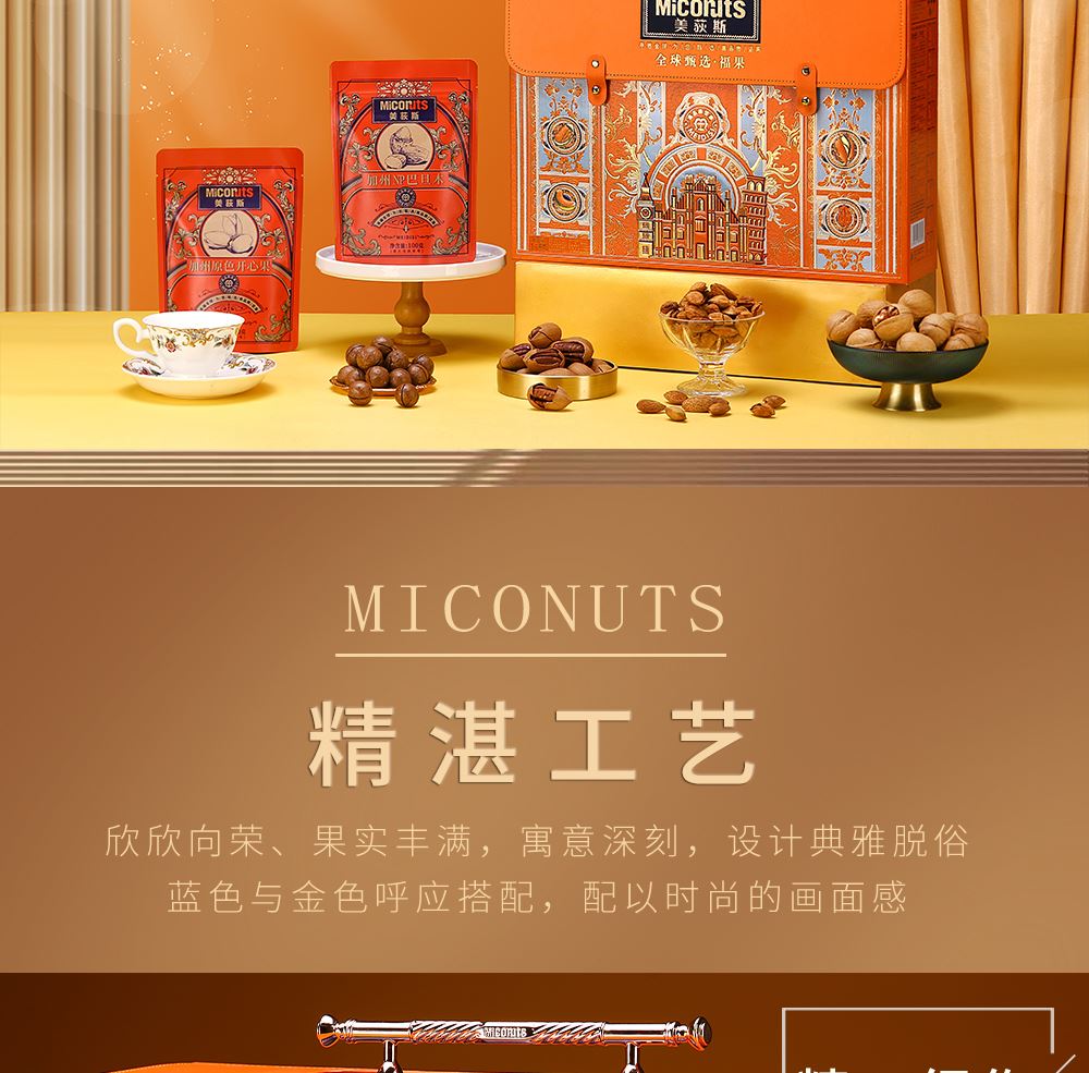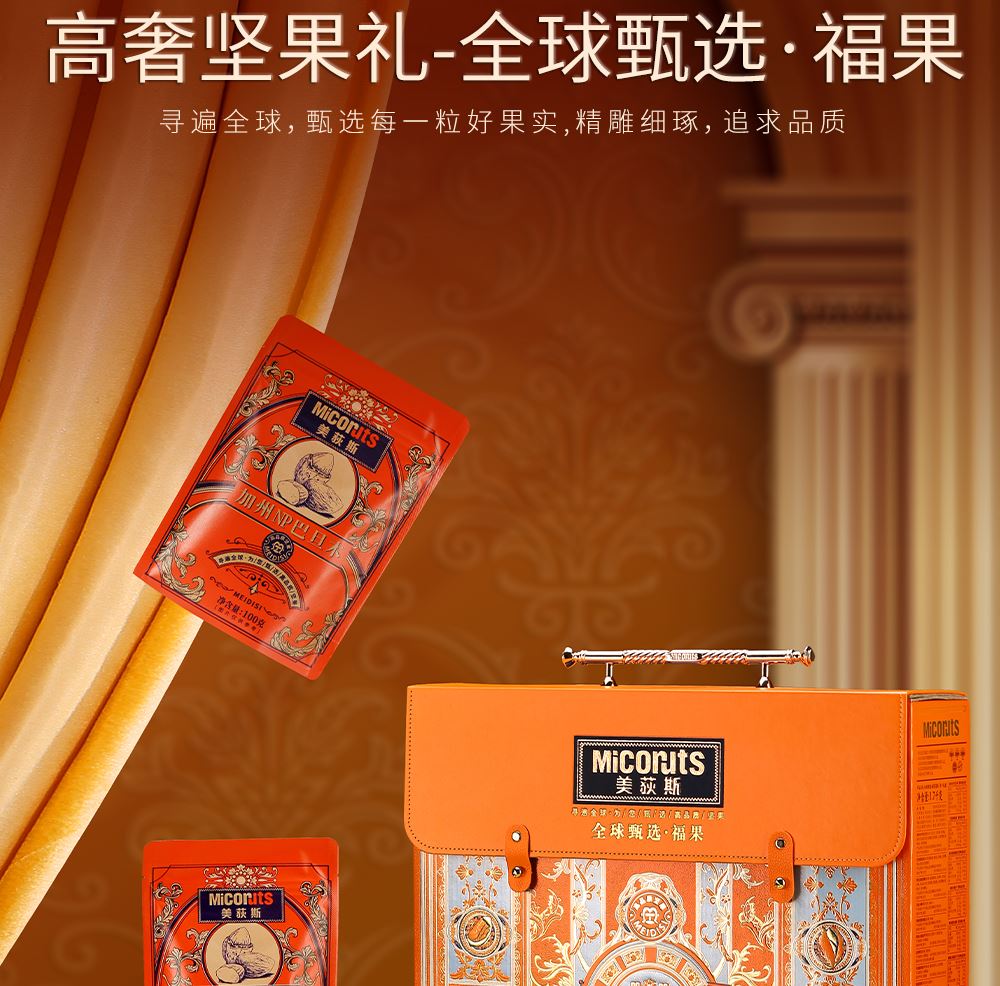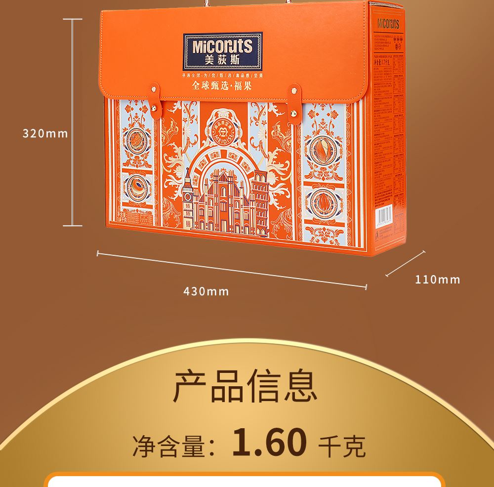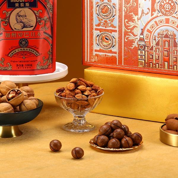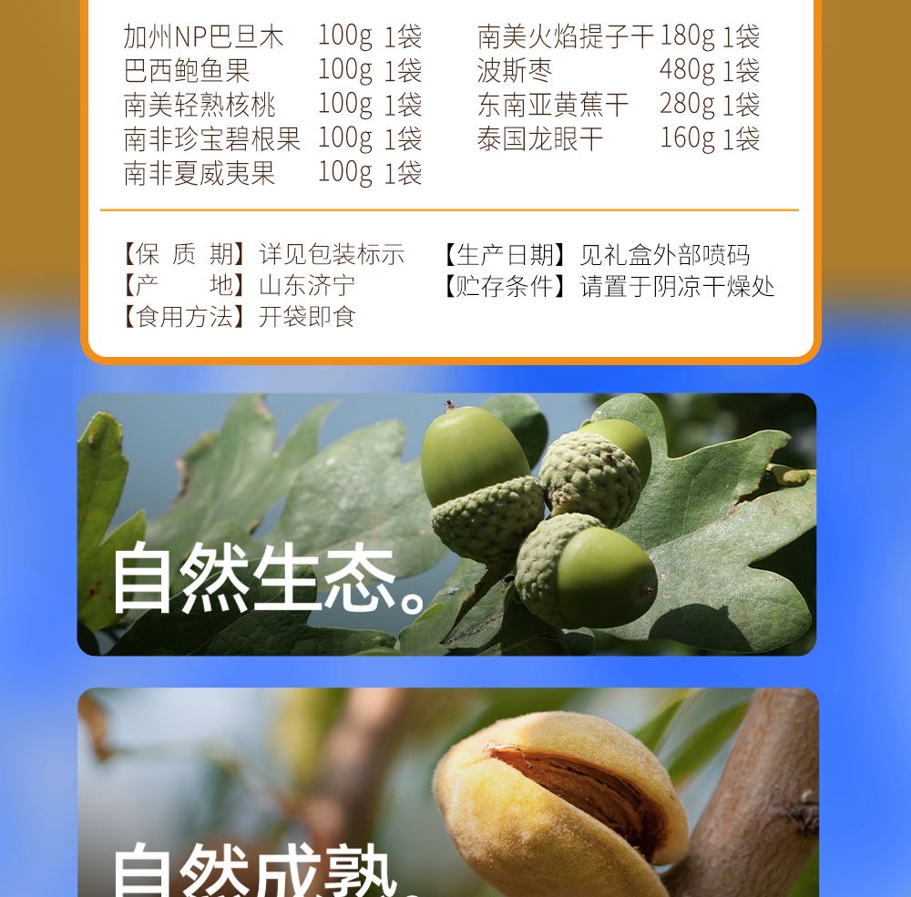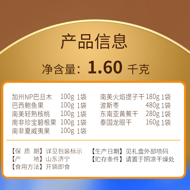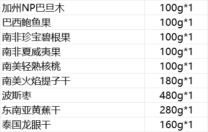 加州NP巴旦木 100g*1 巴西鲍鱼果 100g*1 南非珍宝碧根果 100g*1 南非夏威夷果 100g*1 南美轻熟核桃 100g*1 南美火焰提子干 180g*1 波斯枣 480g*1 东南亚黄蕉干 280g*1 泰国龙眼干 160g*1 合计:1600g