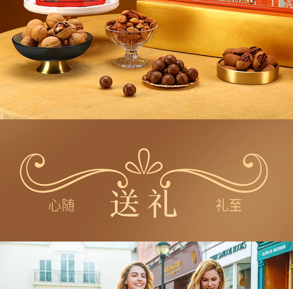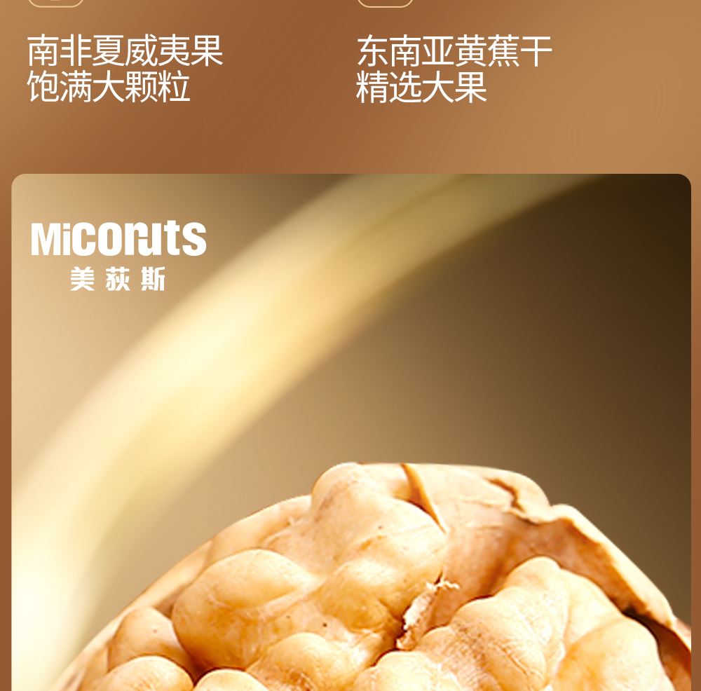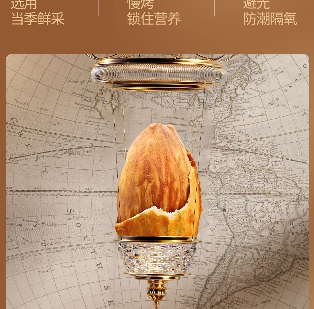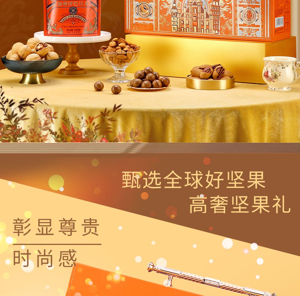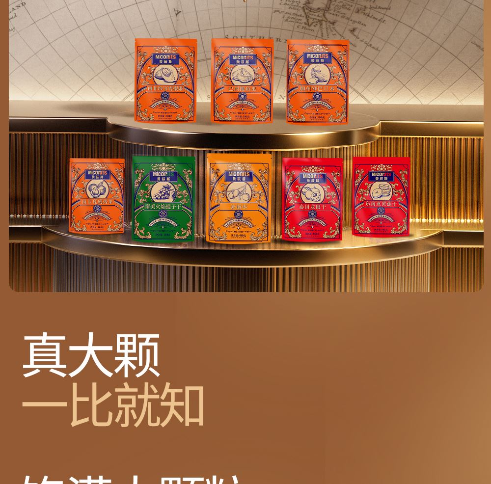 加州NP巴旦木 100g*1 巴西鲍鱼果 100g*1 南非珍宝碧根果 100g*1 南非夏威夷果 100g*1 南美轻熟核桃 100g*1 南美火焰提子干 180g*1 波斯枣 480g*1 东南亚黄蕉干 280g*1 泰国龙眼干 160g*1 合计:1600g