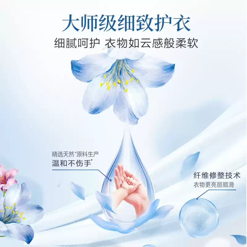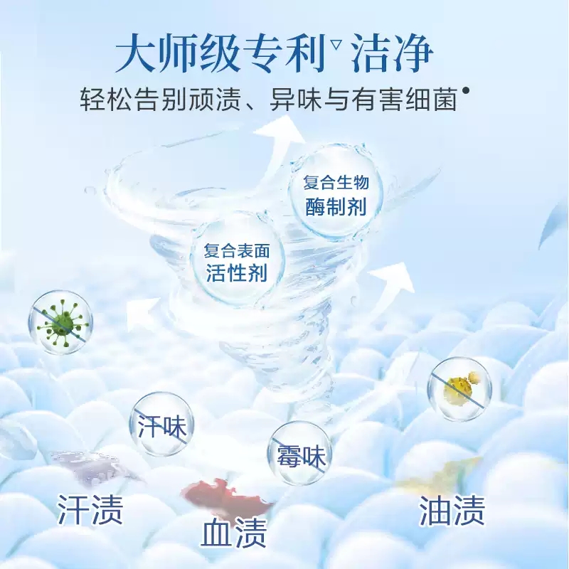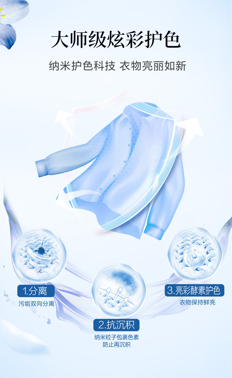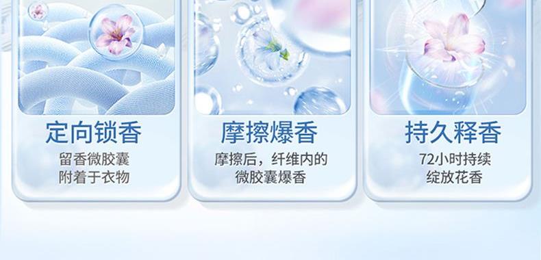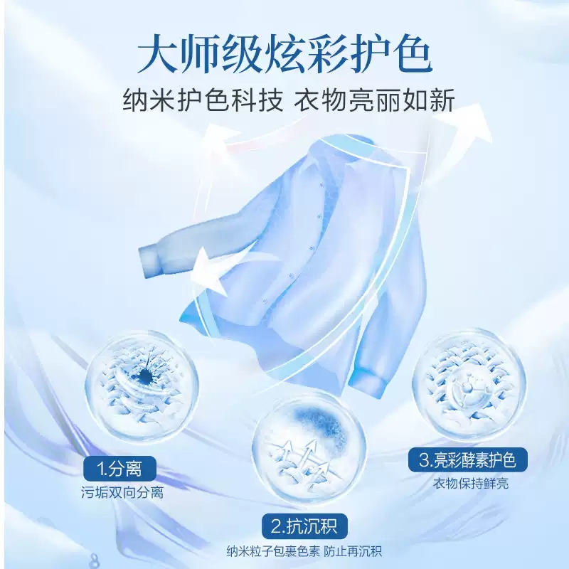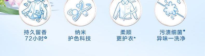保质期:三年 香型:奇遇蓝风铃 产品成分:表面活性剂、抗再沉积剂、酶制剂、防腐剂、着色剂、防串色剂、蓝风铃香氛 卖点: 持久留香72小时 纳米护色科技 炫彩柔顺更护衣 污渍、细菌、异味一洗净