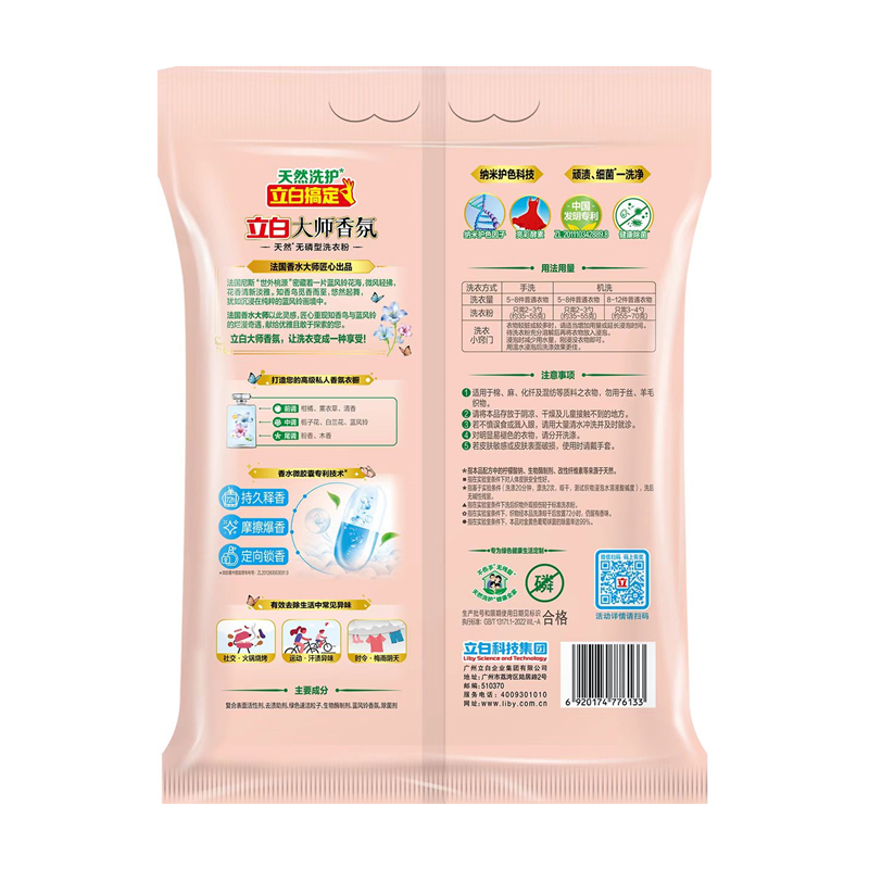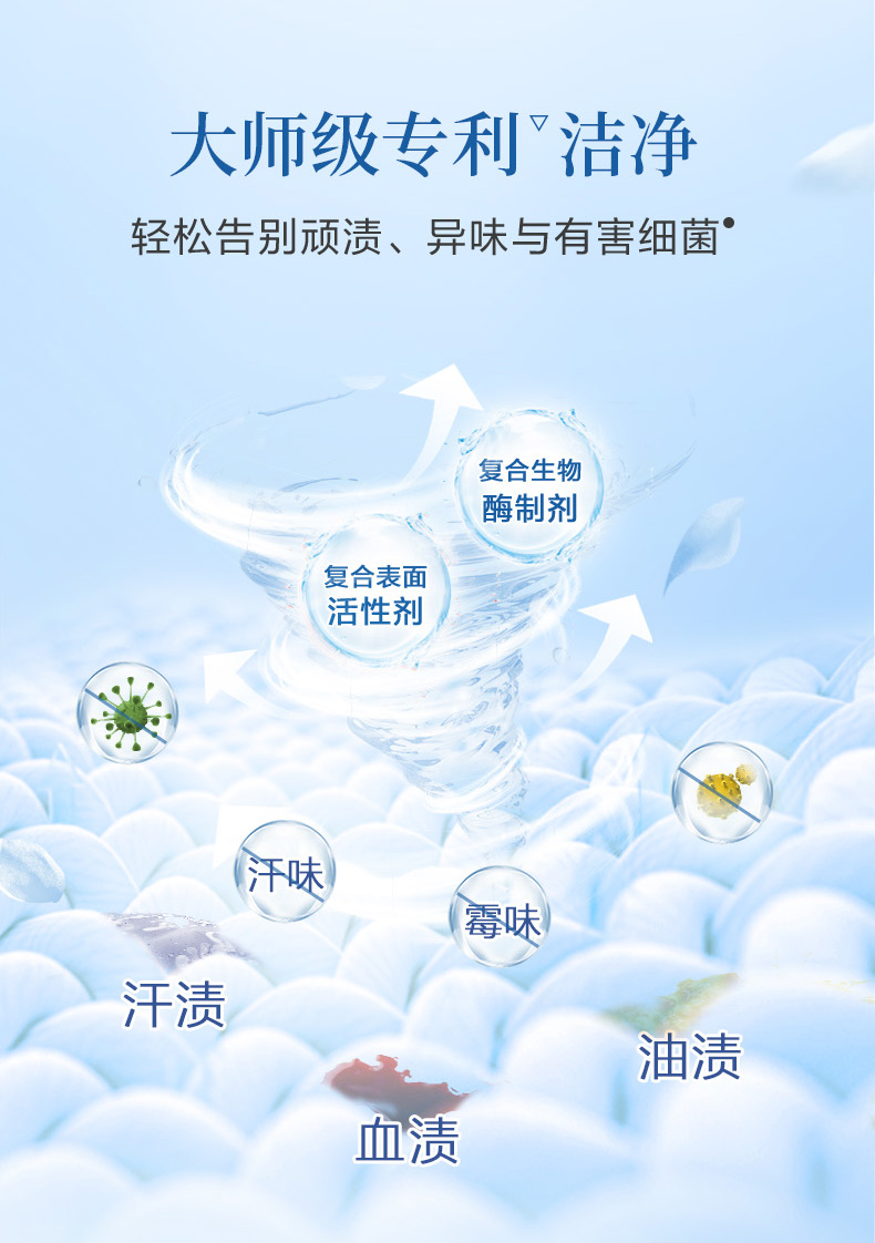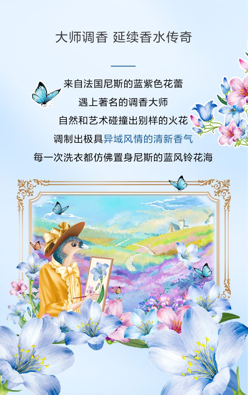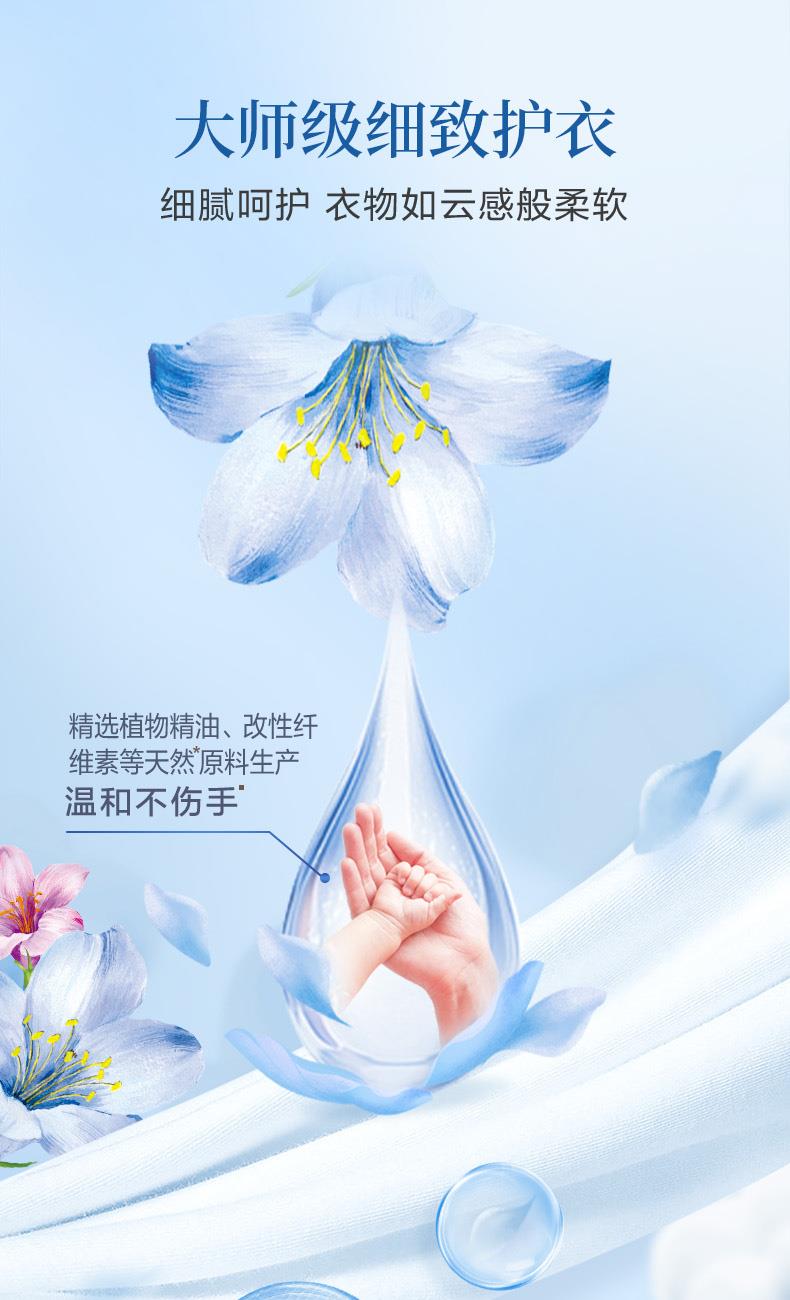 保质期:三年 香型:奇遇蓝风铃 产品成分:表面活性剂、抗再沉积剂、酶制剂、防腐剂、着色剂、防串色剂、蓝风铃香氛 卖点: 持久留香72小时 纳米护色科技 炫彩柔顺更护衣 污渍、细菌、异味一洗净