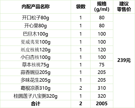 开口松子80g 1 80 开心果80g 1 80 巴旦木100g 1 100 夏威夷果100g 1 100 纸皮核桃120g 1 120 小白杏核100g 1 100 草本核桃75g 1 75 蒜香豌豆205g 1 205 多味花生205g 1 205 葛根凉茶310g 2 310 桂圆莲子八宝粥320g 1 320