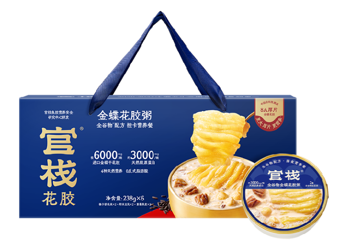 净含量: 1428g(238gx6) 保质期:12个月 口味:紫薯燕麦花胶粥238gx2+野米豆乳花胶粥238gx2+榛子碧根果花胶粥238gx2