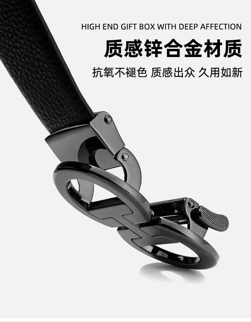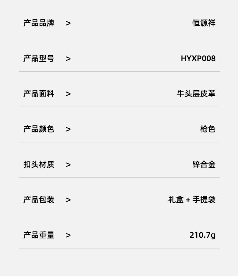 产品型号:HYXP008 产品颜色:黑色 产品材质:锌合金、牛头层皮革 产品尺寸:8*4cm 产品重量:210.7克 外包装尺寸:45*48*65mm