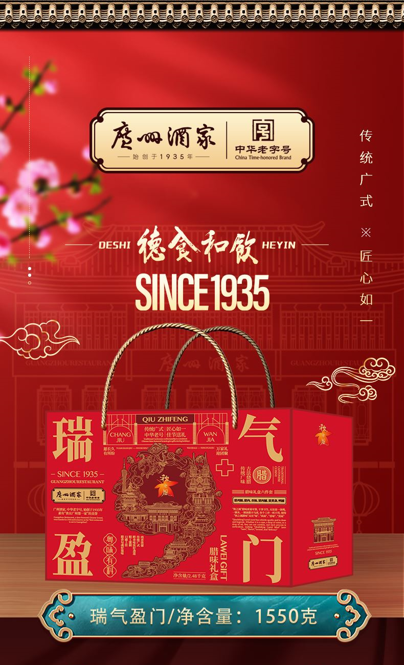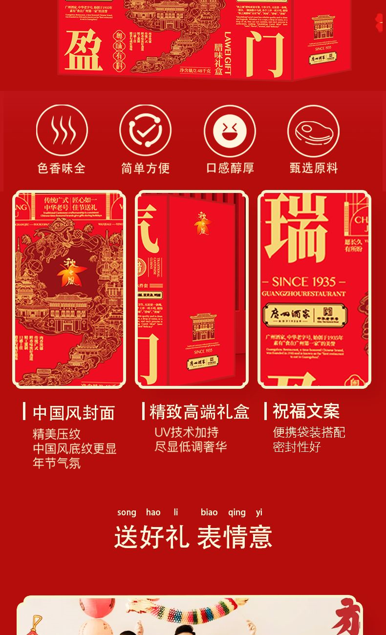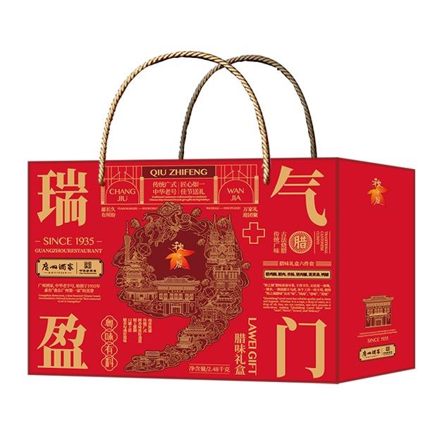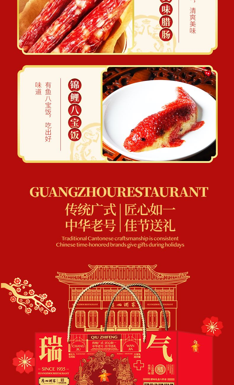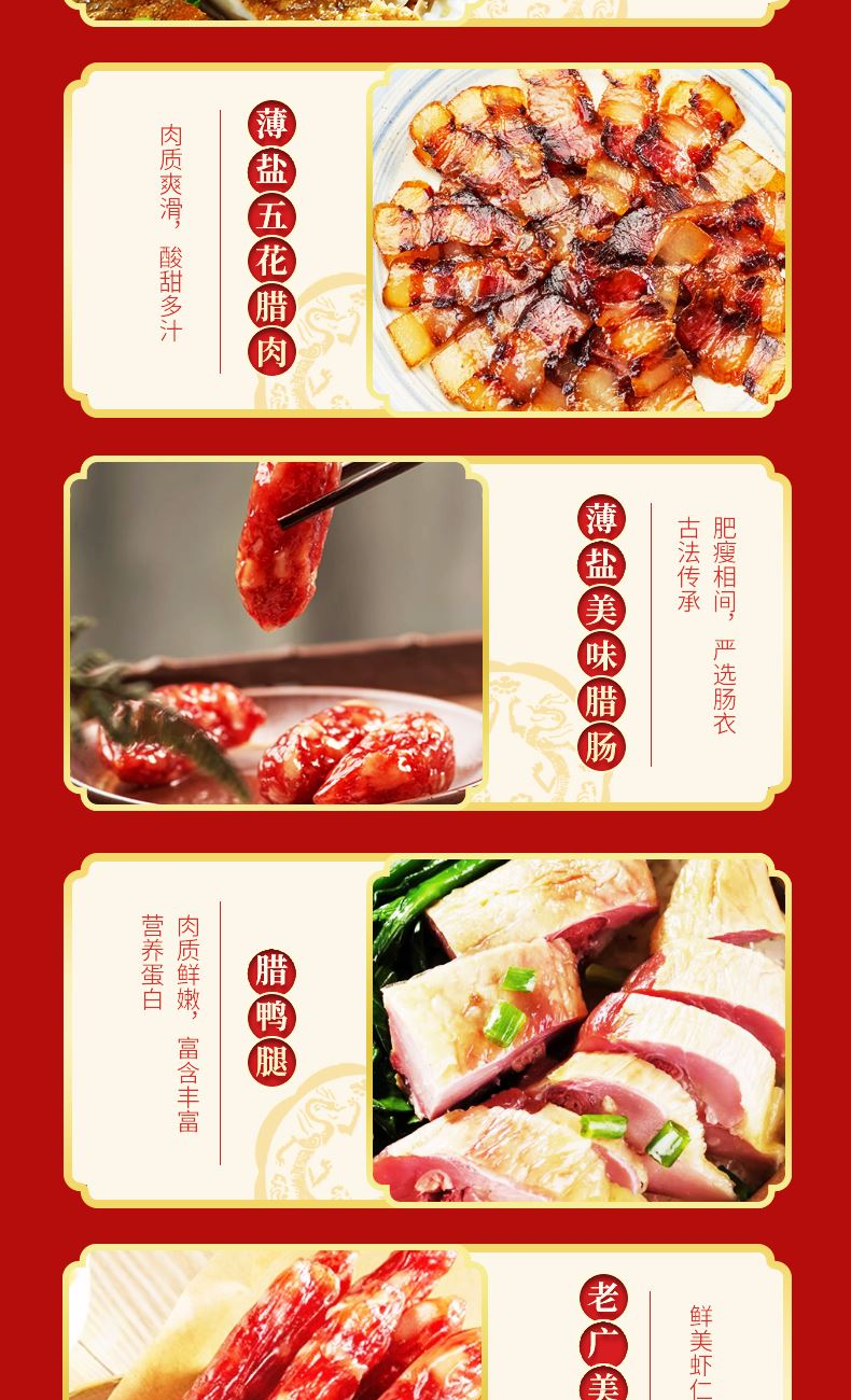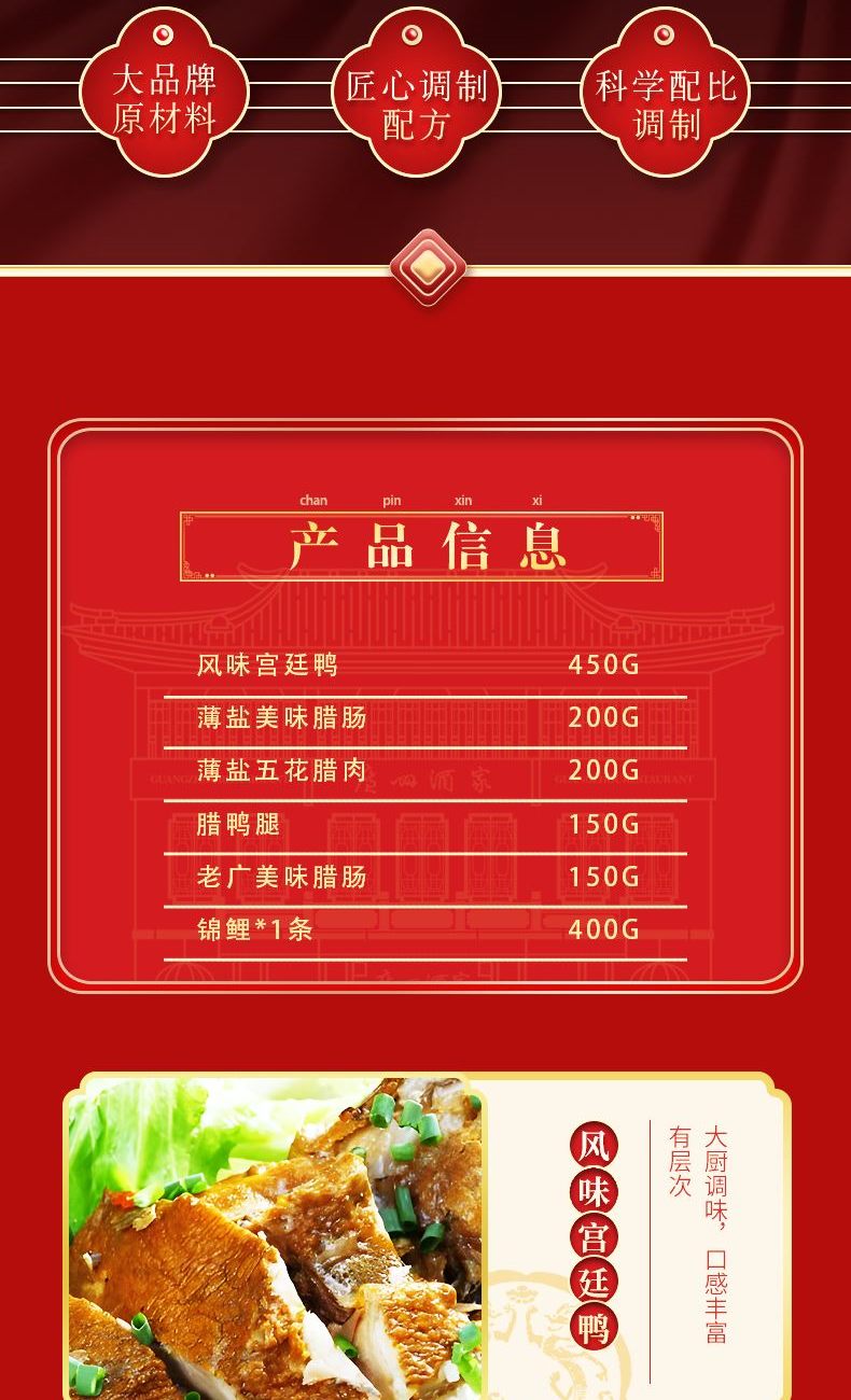 “食在广州” 承百年广府匠心,选上乘天然原料,遵古法生晒工艺 铸就一味甘香醇厚、寓意吉祥的岭南家宴至味 礼盒尺寸:37*12*27cm 内容物:风味宫廷鸭 450g 薄盐美味腊肠200克 薄盐五花腊肉200g 腊鸭腿150g/只 老广美味腊肠150g 赠:嘉庆斋锦鲤八宝鱼