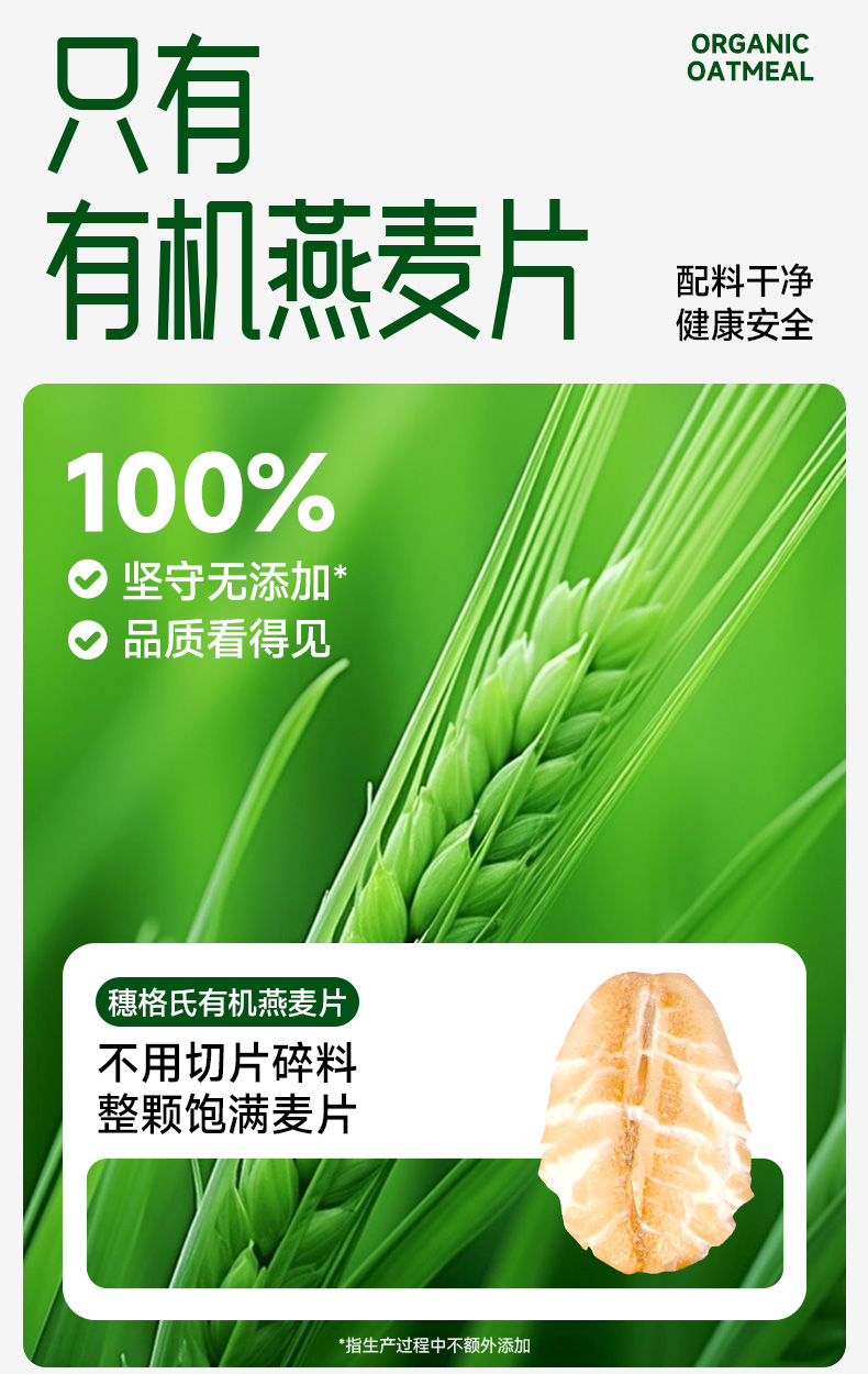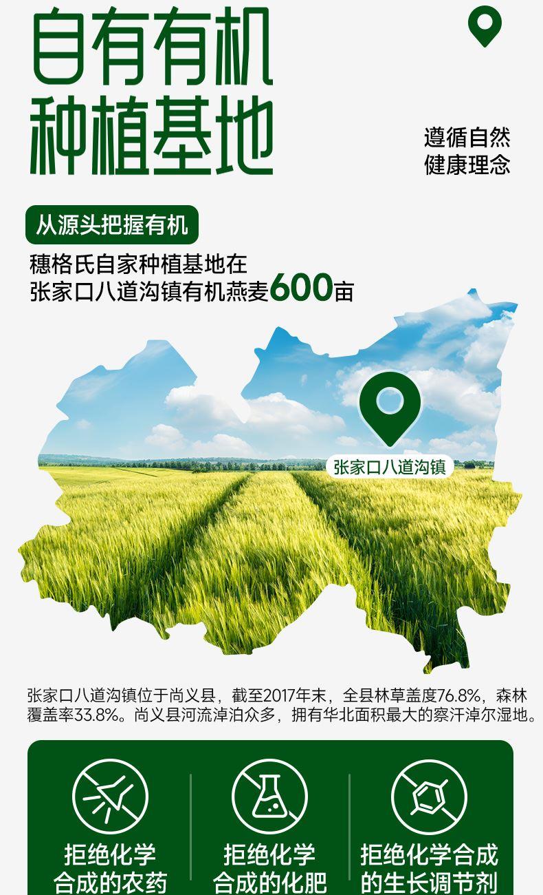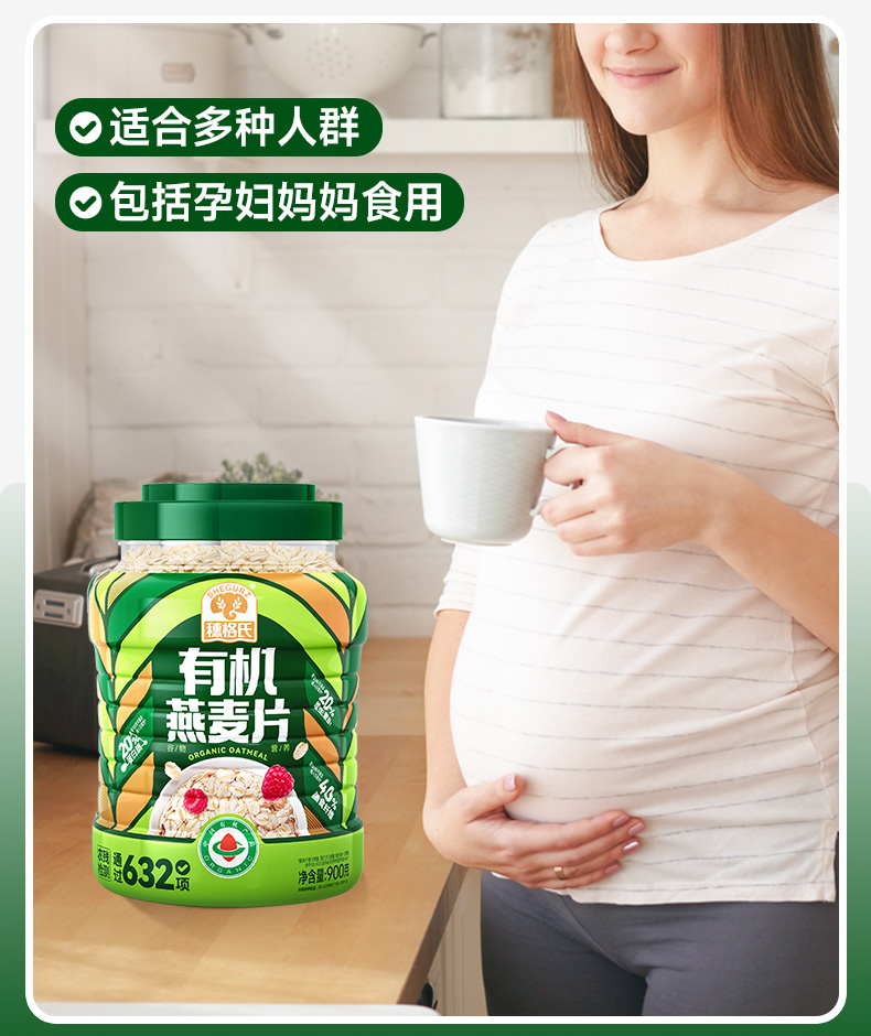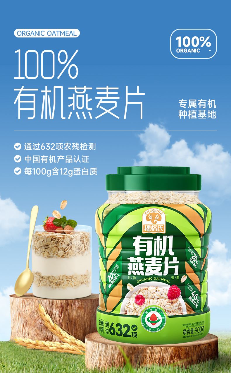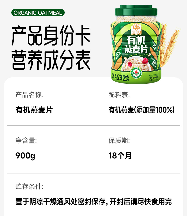 穗格氏有机燕麦片900g罐装 配料表:有机燕麦片 产品卖点: 1,一罐一码 全程有机可追溯; 2,穗格氏专属有机种植基地,张家口市农业科学院育成品种“坝莜一号”; 3,高膳食纤维,含有蛋白质,无添加蔗糖,含维生素B1; 4,通过632项农残检测; 5,适合青少年,上班族,宝妈,中老年人的有机新生活。