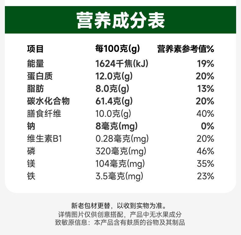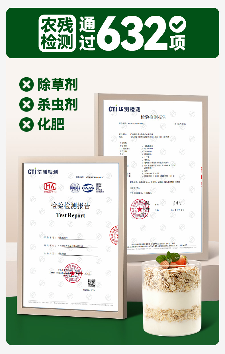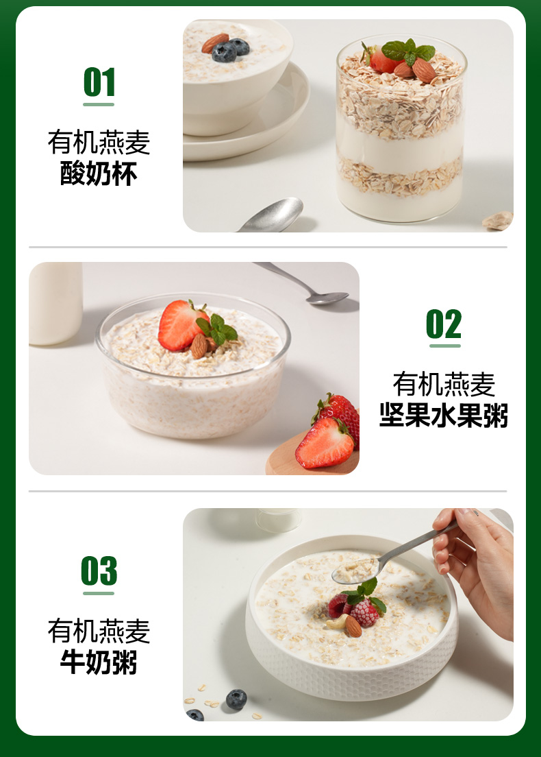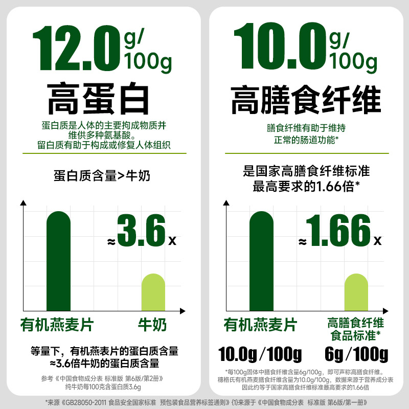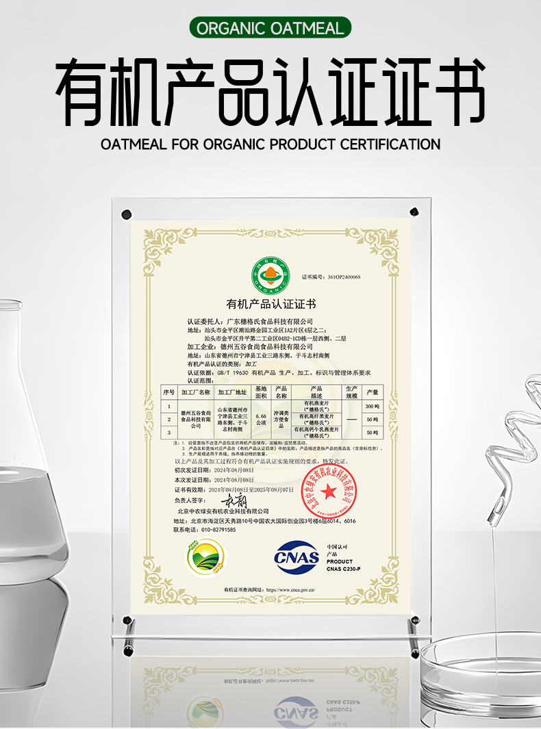 穗格氏有机燕麦片900g罐装 配料表:有机燕麦片 产品卖点: 1,一罐一码 全程有机可追溯; 2,穗格氏专属有机种植基地,张家口市农业科学院育成品种“坝莜一号”; 3,高膳食纤维,含有蛋白质,无添加蔗糖,含维生素B1; 4,通过632项农残检测; 5,适合青少年,上班族,宝妈,中老年人的有机新生活。