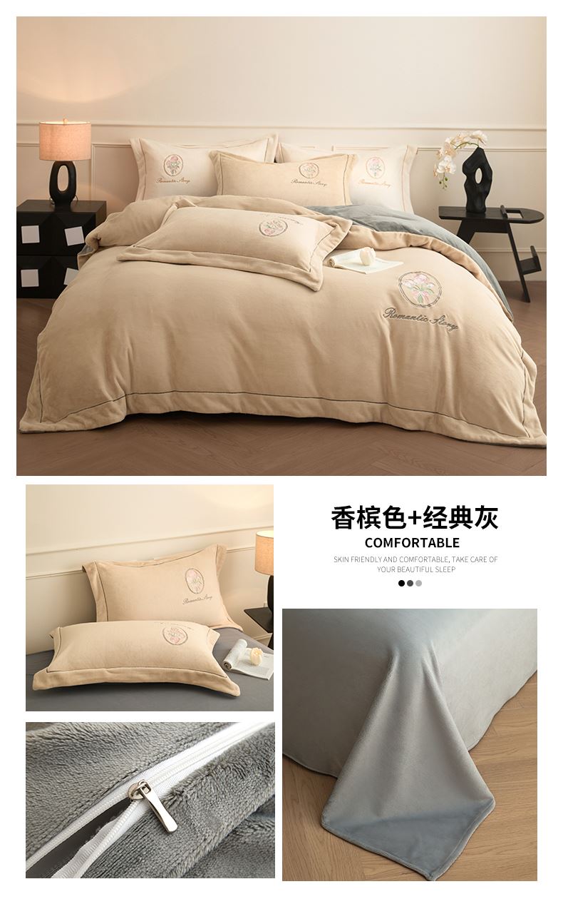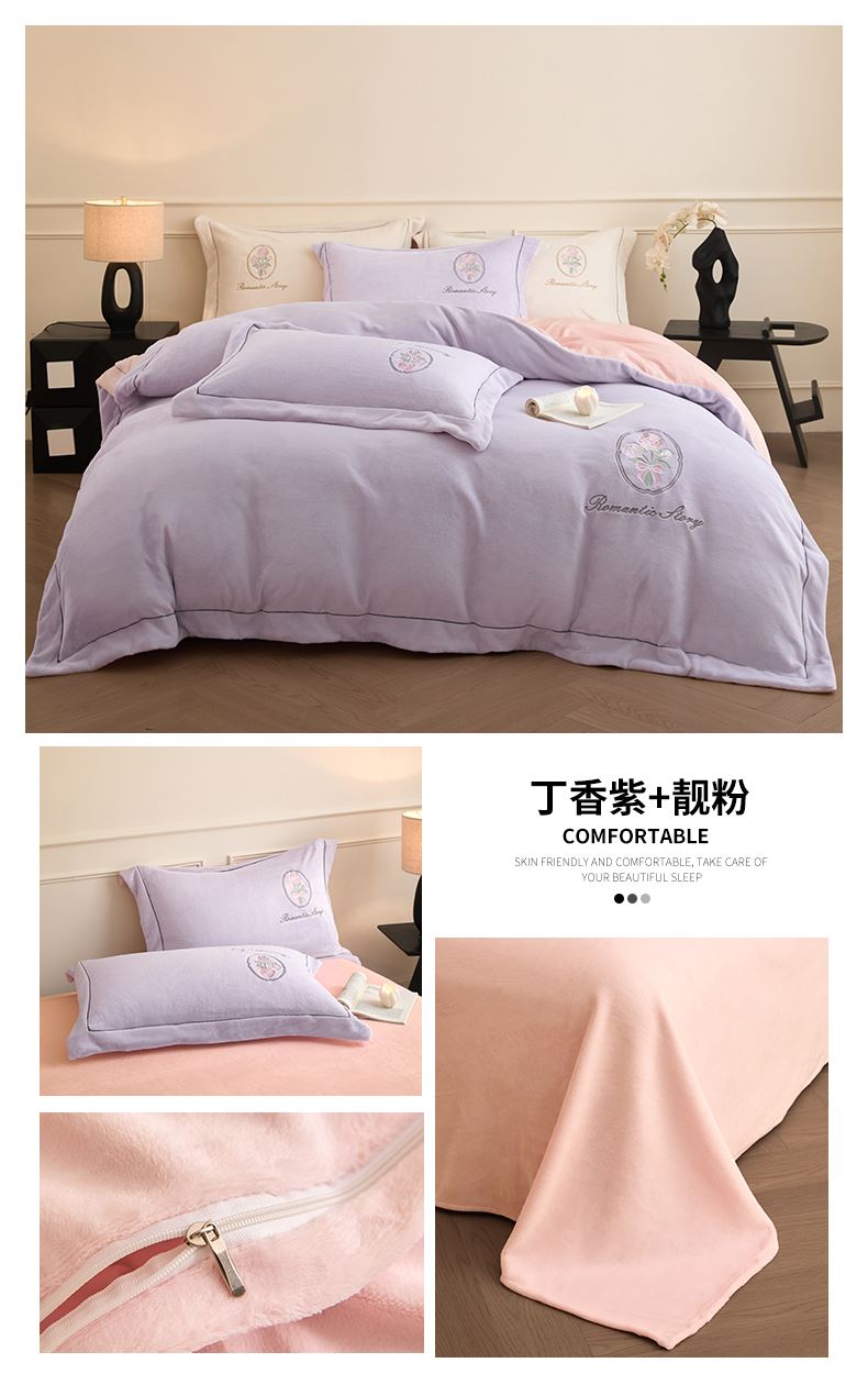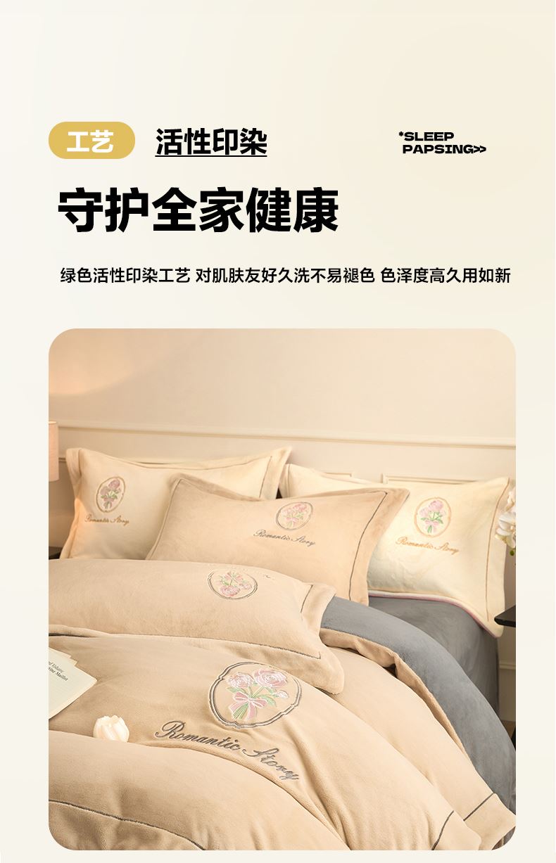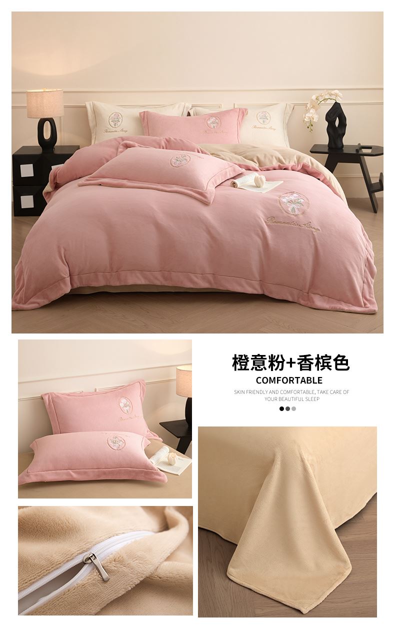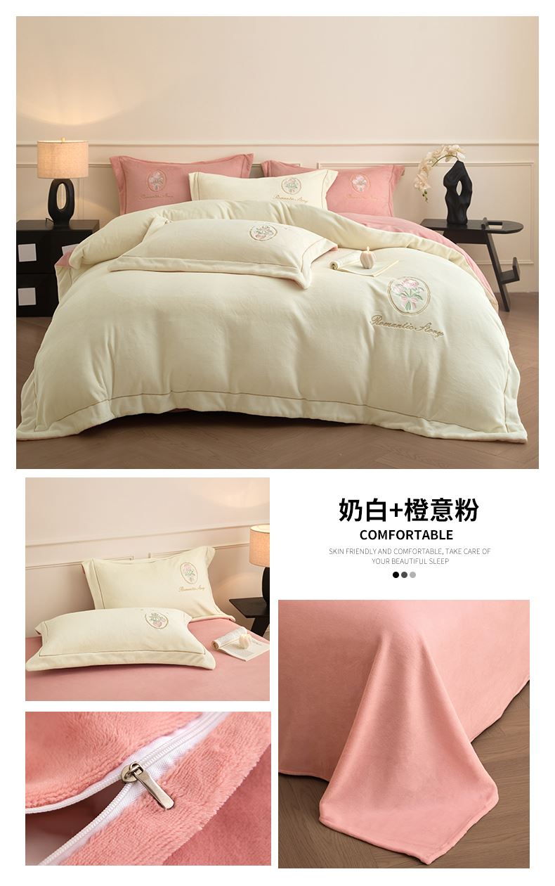 规格:1.5-1.8M床用 被套200*230cm 床单230*250cm 枕套48*74cm 面料:牛奶绒/聚酯纤维 花色:奶白+橙意粉、橙意粉+香槟色、丁香紫+靓粉、天空蓝+香草灰、香槟色+经典灰、香槟色+经典灰 加厚牛奶绒面料密实 触感如婴儿肌肤般细腻 如牛奶般温润顺滑 绒毛丰满不掉毛抗静电 是冬日被窝的小太阳 精致刺绣既温柔又浪漫 加上宽边工艺的设计 让你感受生活的温馨与美好!