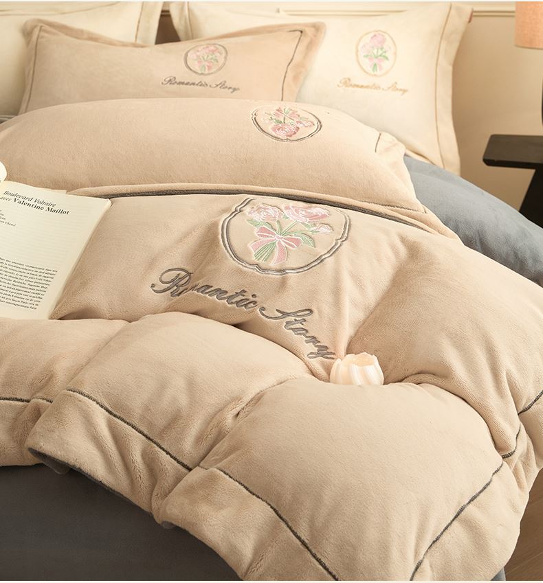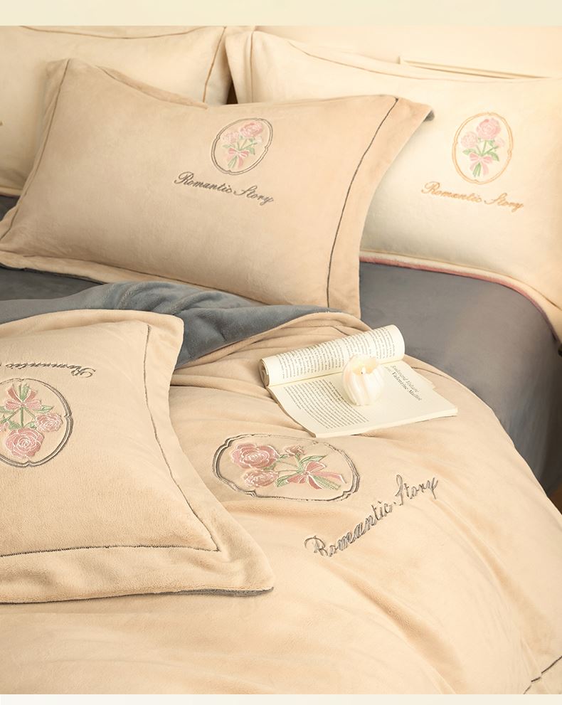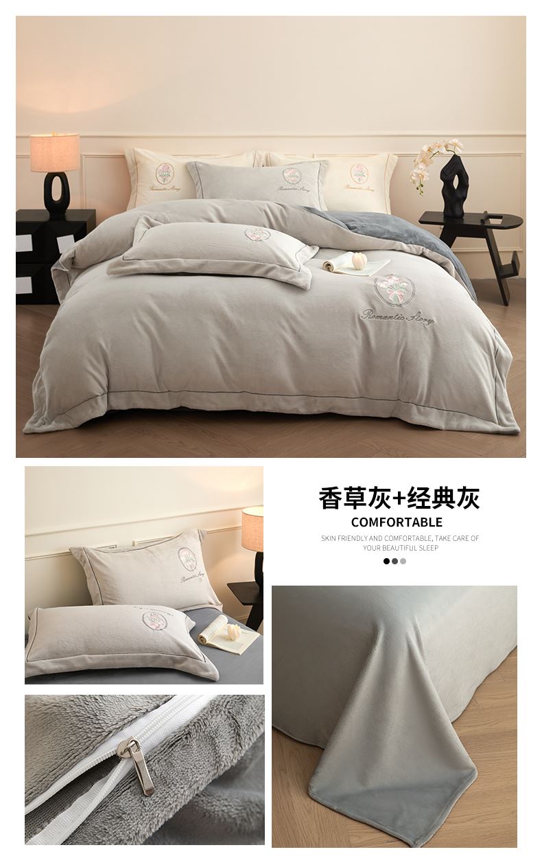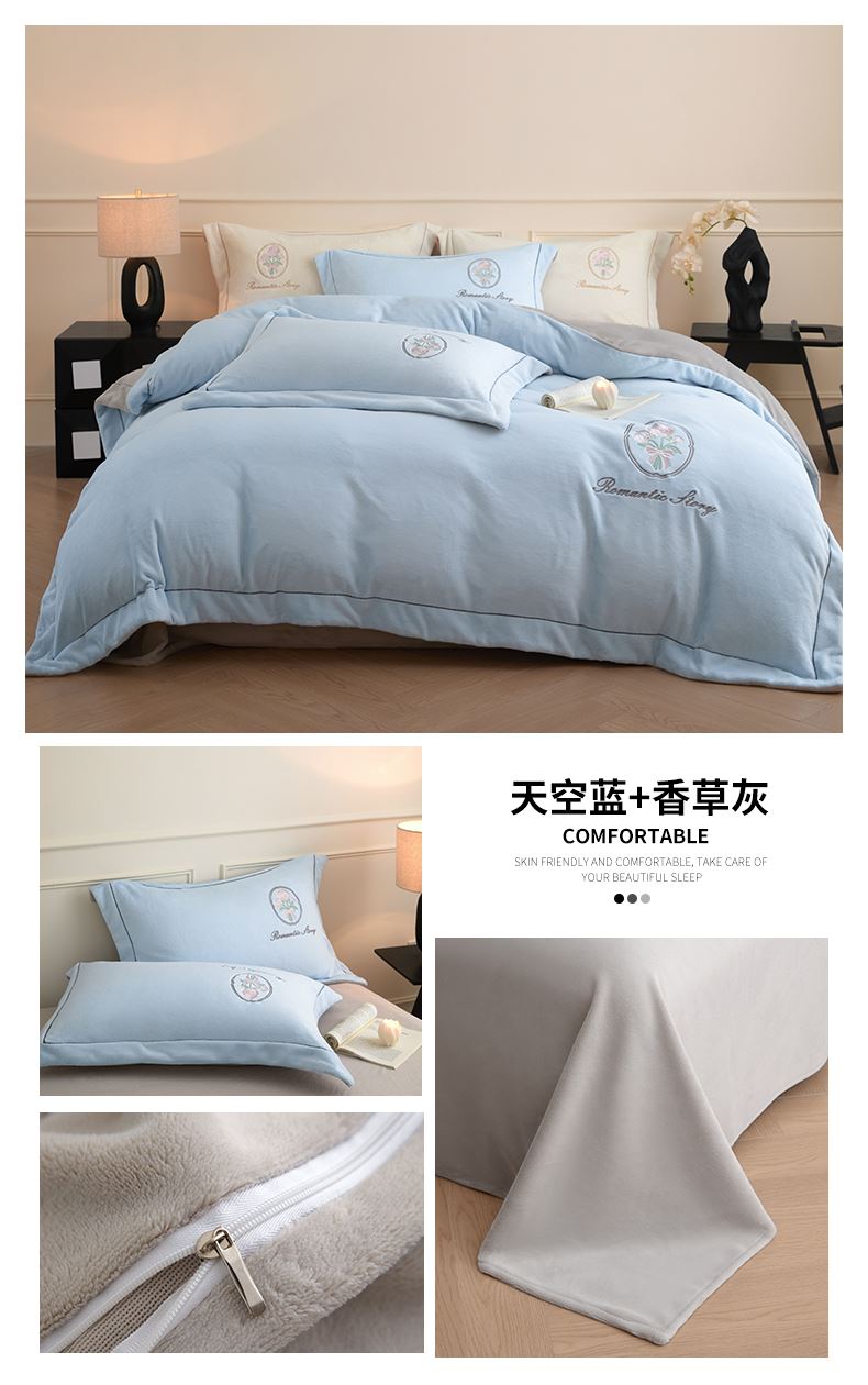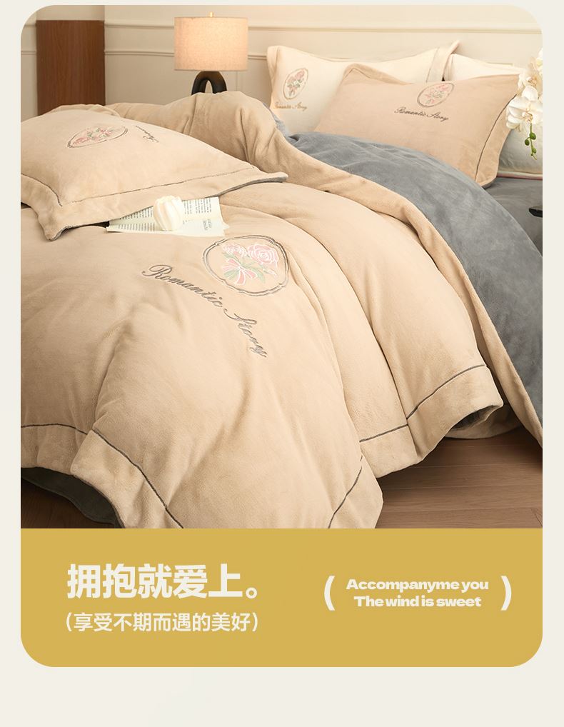 规格:1.5-1.8M床用 被套200*230cm 床单230*250cm 枕套48*74cm 面料:牛奶绒/聚酯纤维 花色:奶白+橙意粉、橙意粉+香槟色、丁香紫+靓粉、天空蓝+香草灰、香槟色+经典灰、香槟色+经典灰 加厚牛奶绒面料密实 触感如婴儿肌肤般细腻 如牛奶般温润顺滑 绒毛丰满不掉毛抗静电 是冬日被窝的小太阳 精致刺绣既温柔又浪漫 加上宽边工艺的设计 让你感受生活的温馨与美好!