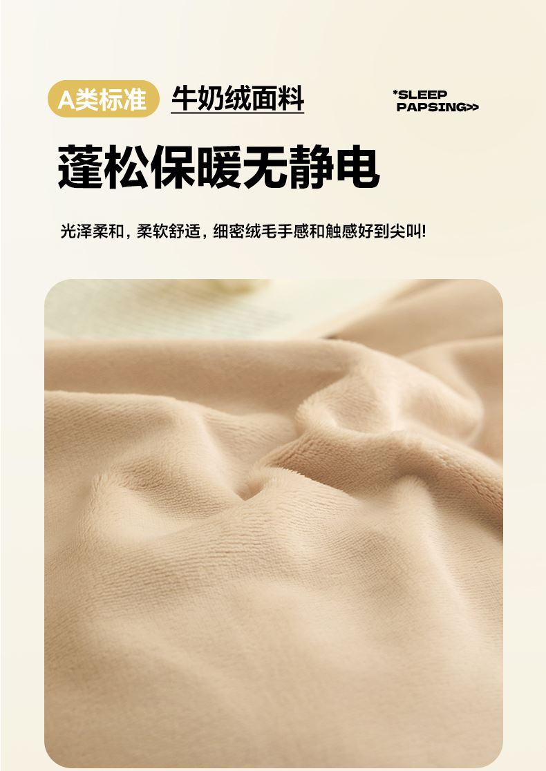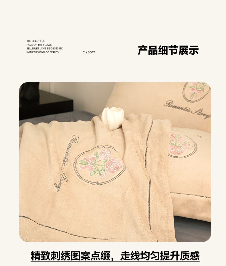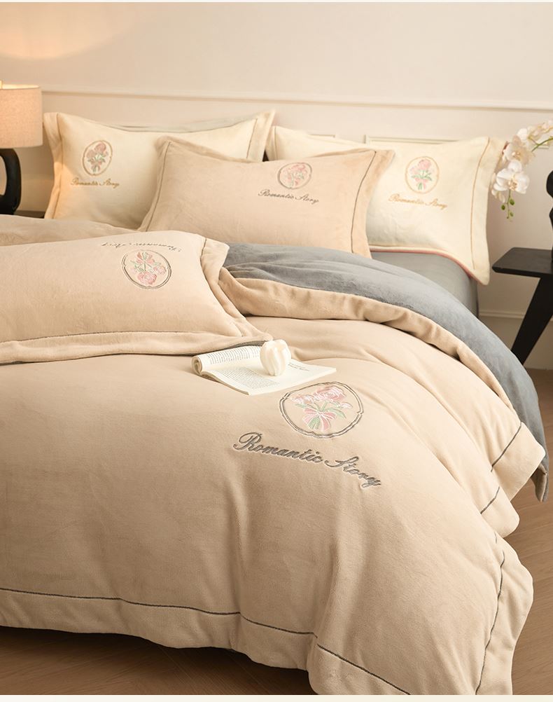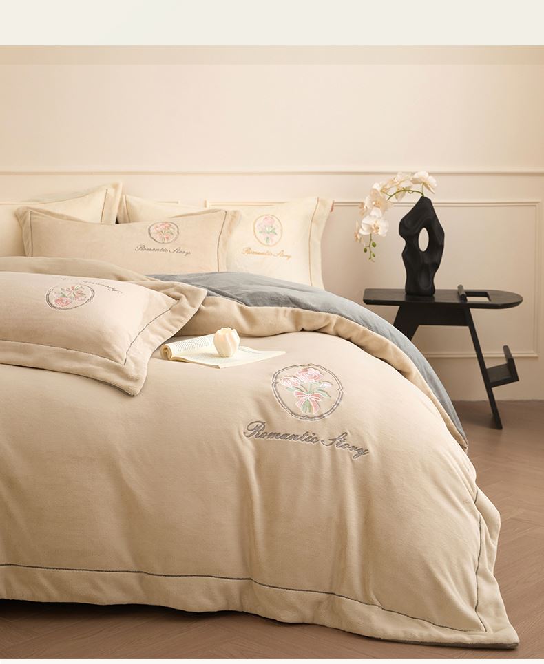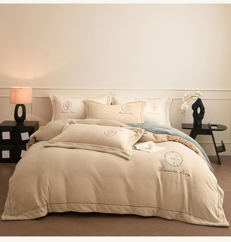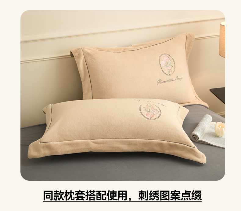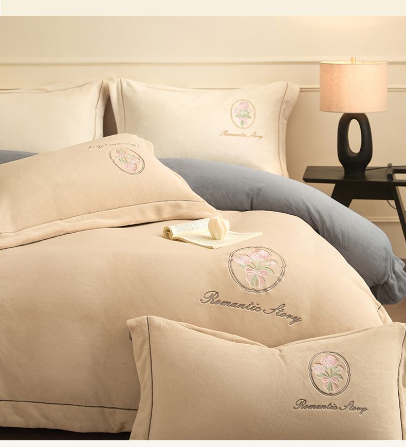 规格:1.5-1.8M床用 被套200*230cm 床单230*250cm 枕套48*74cm 面料:牛奶绒/聚酯纤维 花色:奶白+橙意粉、橙意粉+香槟色、丁香紫+靓粉、天空蓝+香草灰、香槟色+经典灰、香槟色+经典灰 加厚牛奶绒面料密实 触感如婴儿肌肤般细腻 如牛奶般温润顺滑 绒毛丰满不掉毛抗静电 是冬日被窝的小太阳 精致刺绣既温柔又浪漫 加上宽边工艺的设计 让你感受生活的温馨与美好!