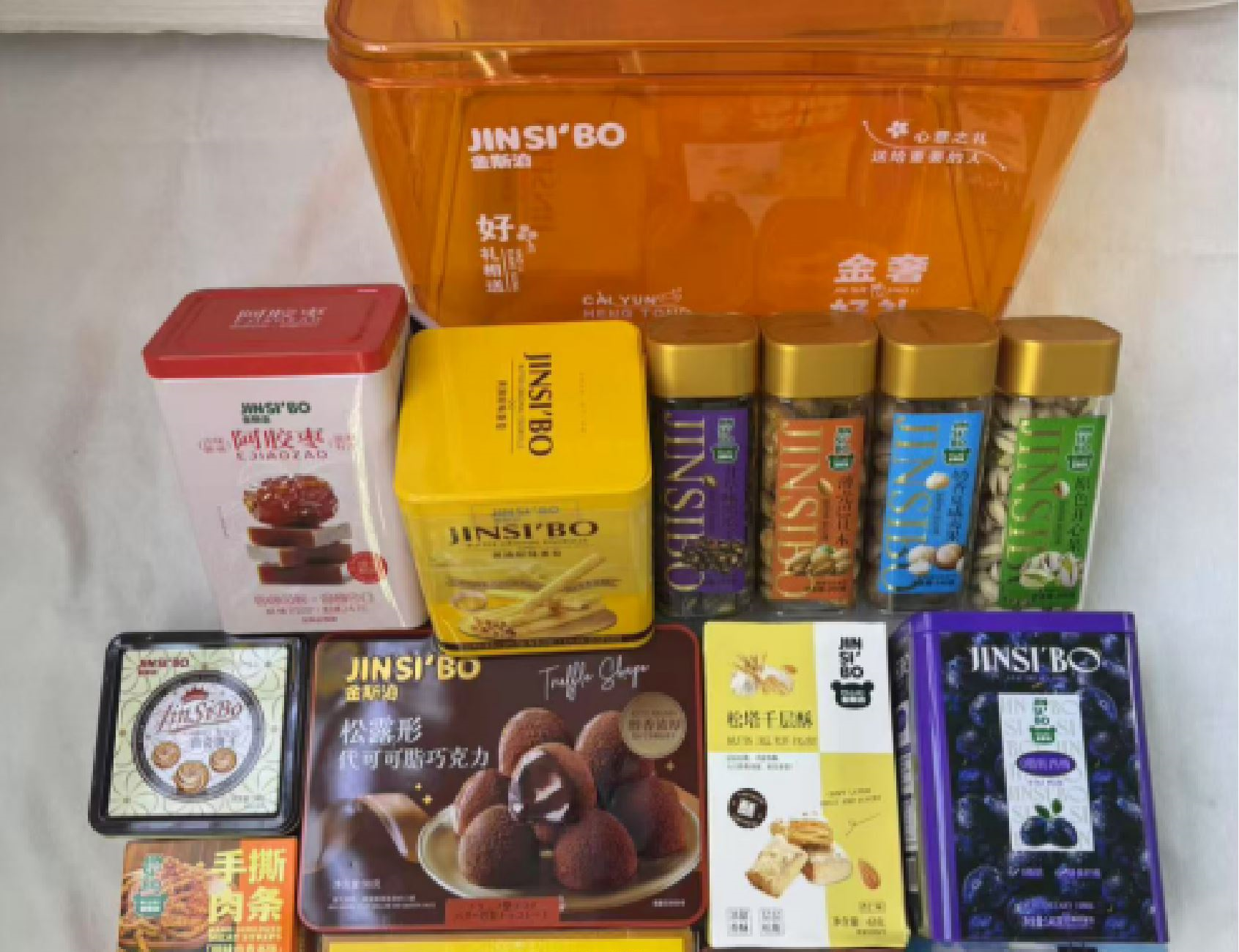 1.0脂肪西梅146g 2.甘草味黑瓜子238g 3.薄壳巴旦木200g 4.奶香夏威夷果240g 5.原色开心果208g 6.曲奇饼干54g 7.本味肉脯21g 8.原味阿胶枣246g 9.黄油猫型酪饼82g 10.牛肉粒170g 11.松塔千层63g*1 12.松露巧克力98g*1 13.滴朵白咖啡90g*1 14.手撕肉条14g*1 15.萌熊饼干48g*1 16.薄壳巴旦木200g*1
