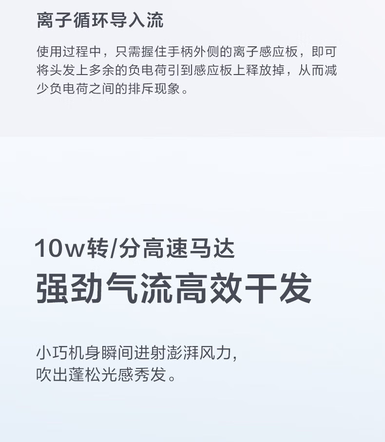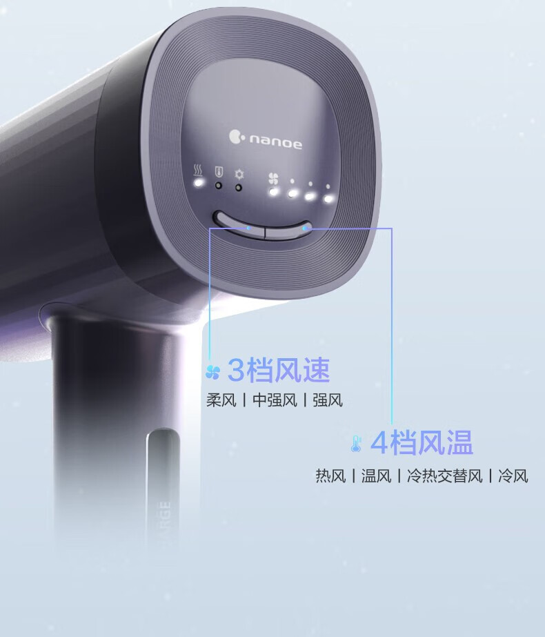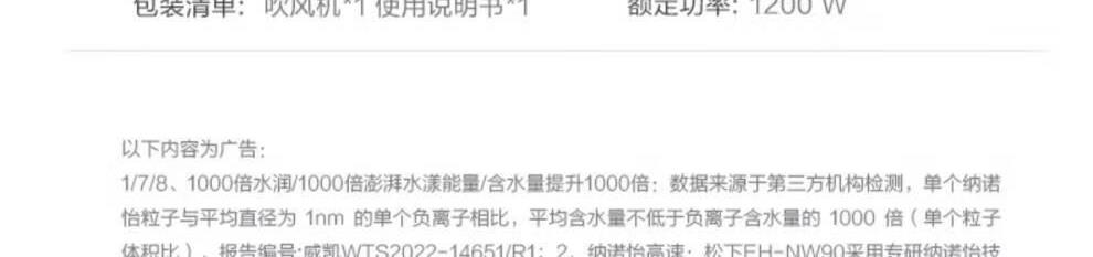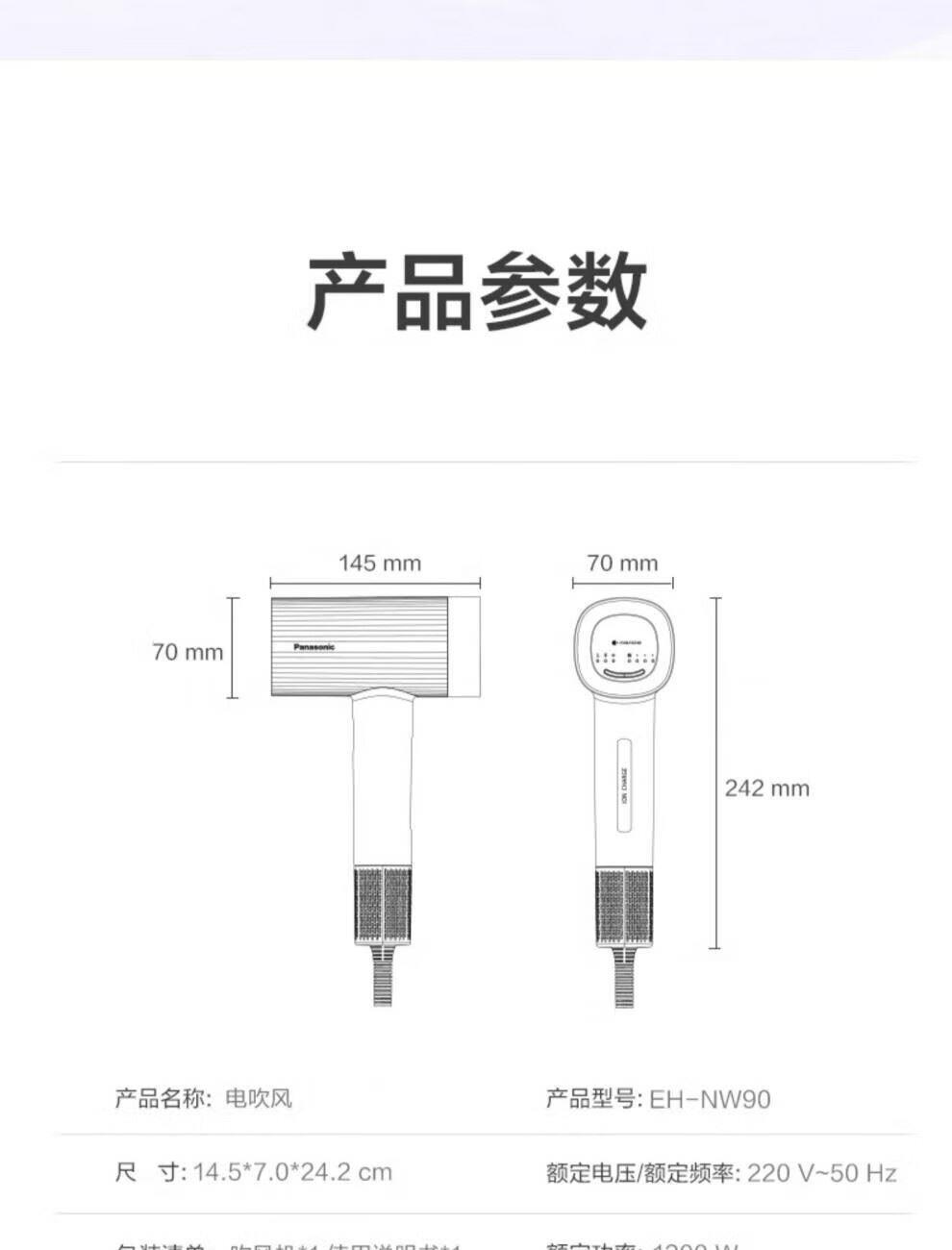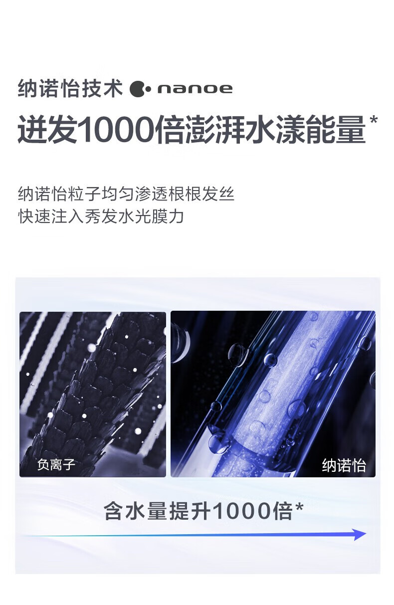 尺寸:14.5*7.0*24.2cm 功率:1200W 转速:105000转/分 净重:484g 诺怡技术补水润发 高速无刷马达低温速干 离子导入技术 促进纳诺怡更好吸附发丝 离子感应循环技术 促进纳诺怡成分更好吸收 10w转/分高速无刷马达 大风力低温速干 L型无损风道,广域风嘴设计 三档风速,四档风温