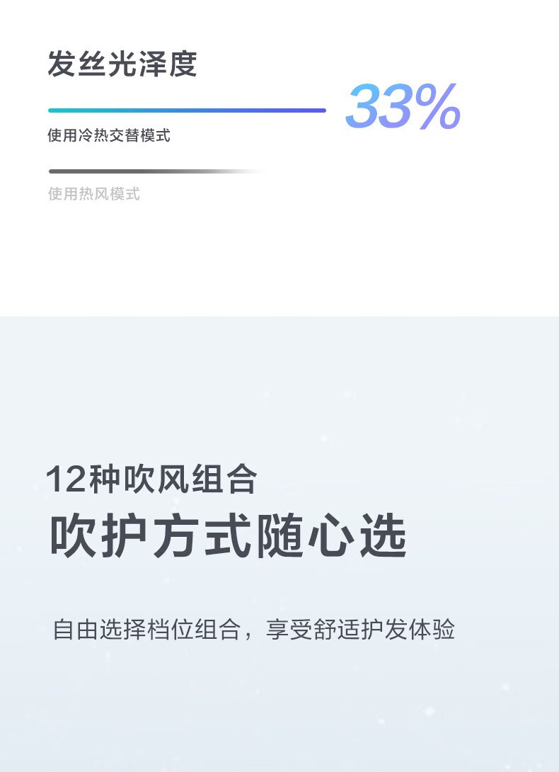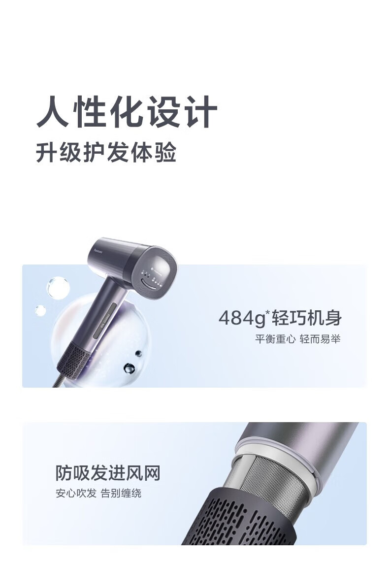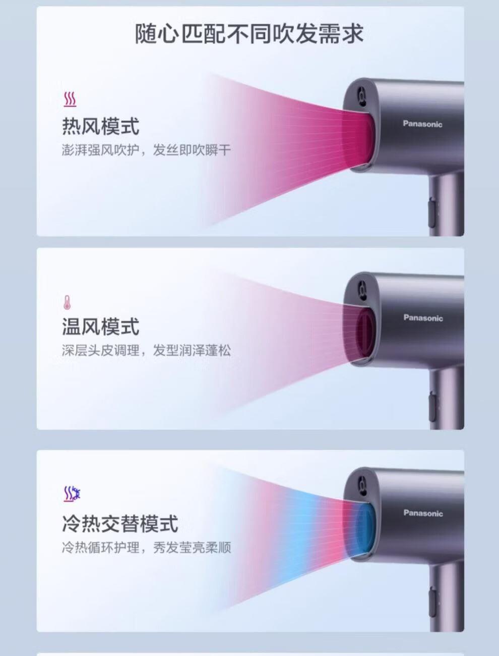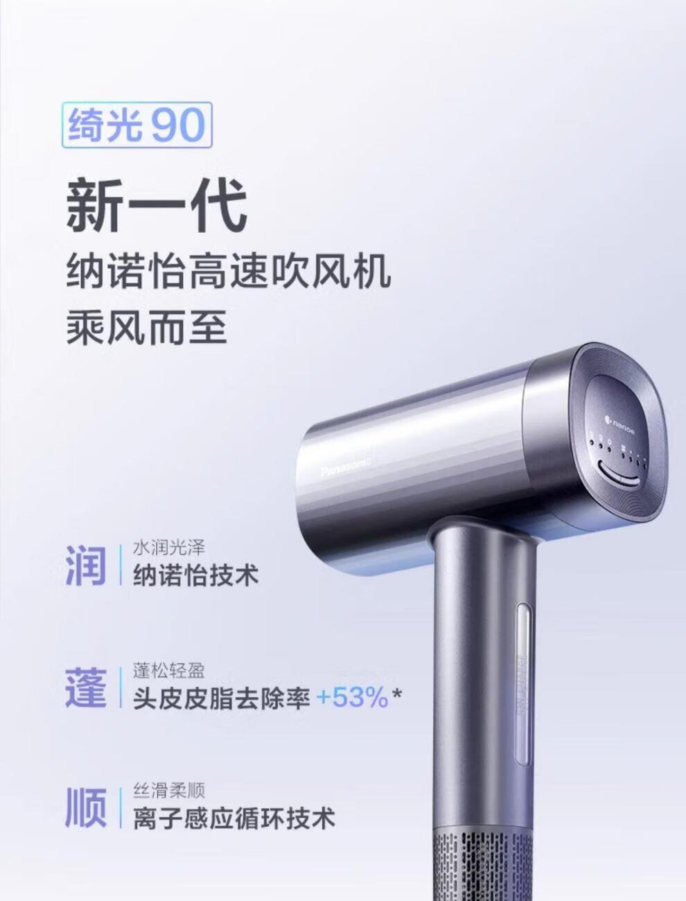 尺寸:14.5*7.0*24.2cm 功率:1200W 转速:105000转/分 净重:484g 诺怡技术补水润发 高速无刷马达低温速干 离子导入技术 促进纳诺怡更好吸附发丝 离子感应循环技术 促进纳诺怡成分更好吸收 10w转/分高速无刷马达 大风力低温速干 L型无损风道,广域风嘴设计 三档风速,四档风温