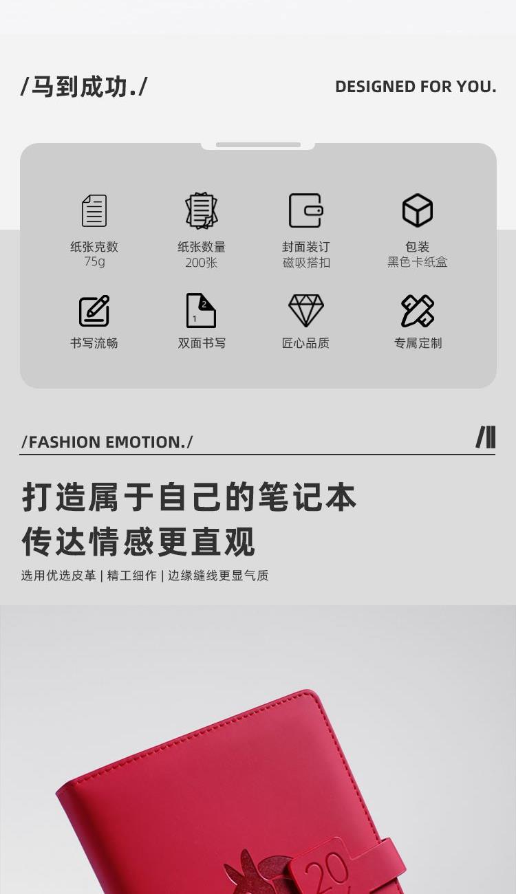 配置 记事本*1 黑卡纸盒*1 变色皮革 75克本白200张 定制工艺 激光 镭射 马年专属版 尺寸 笔记本 :145*210mm 礼盒:230*152*28mm