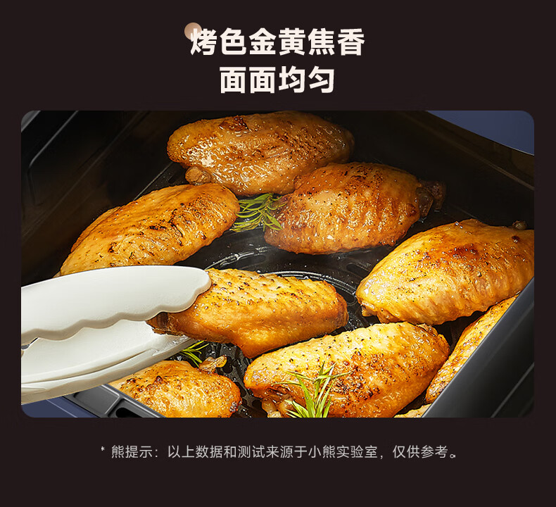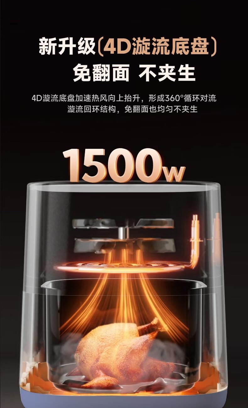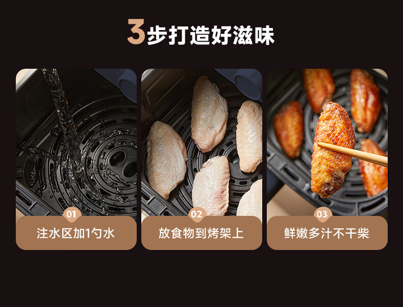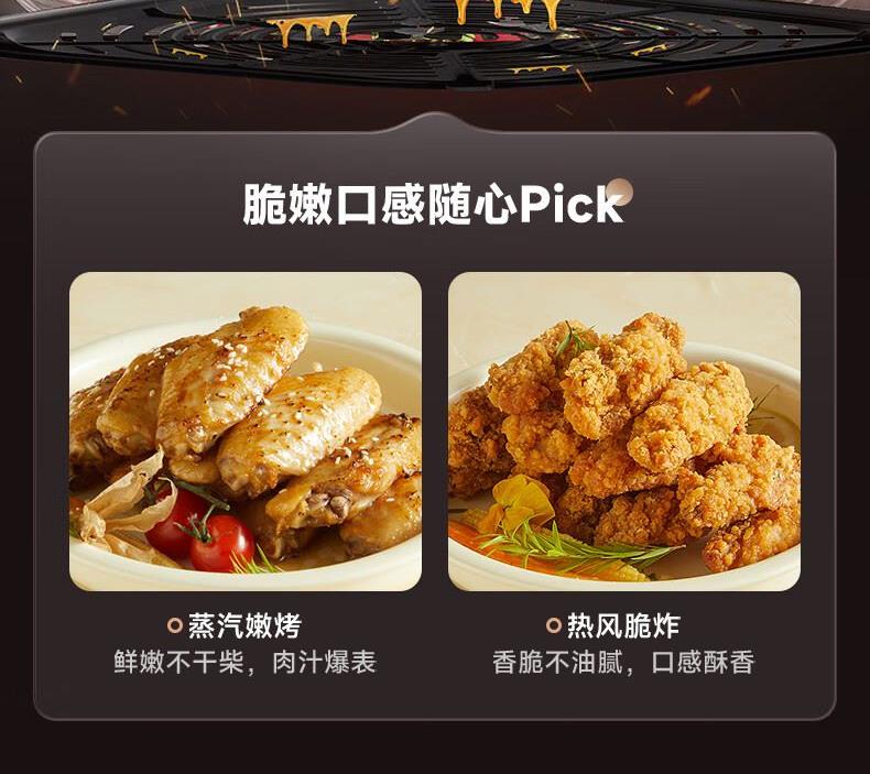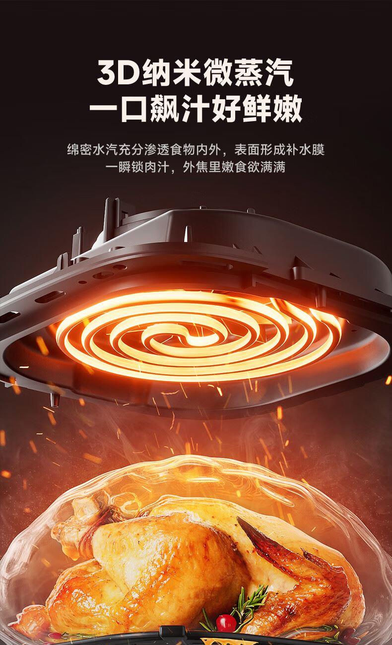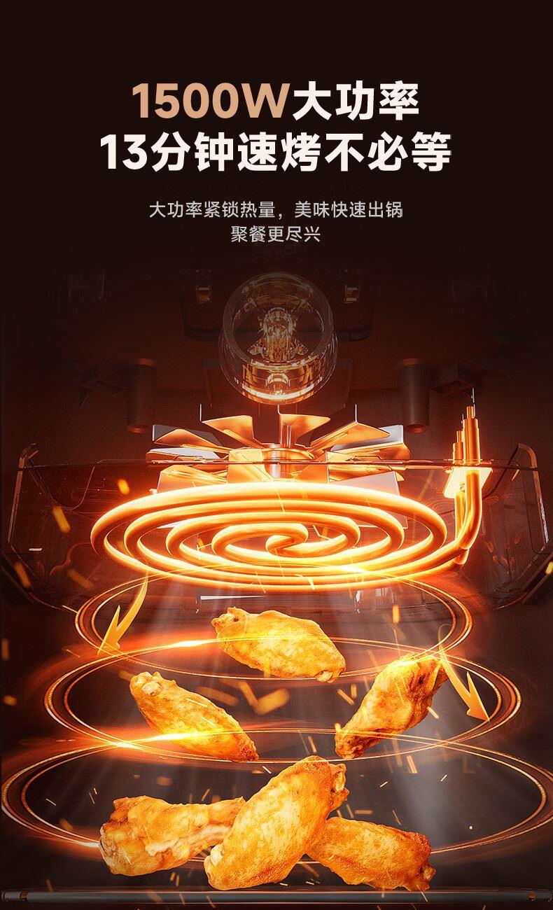 容量 5L 额定功率 1500W加热 产品重量 4KG 包装尺寸 391*316*347 1、免翻面结构设计 2、微蒸汽嫩烤,通过微蒸汽嫩烤补充食物水分 3、低噪音结构设计,噪音低至46db 4、5L家庭大容量 5、双旋钮操作简易方便,适合老人小孩