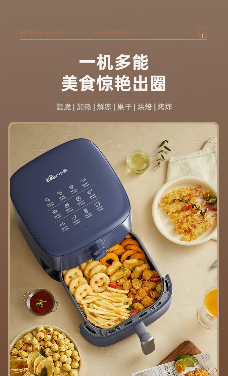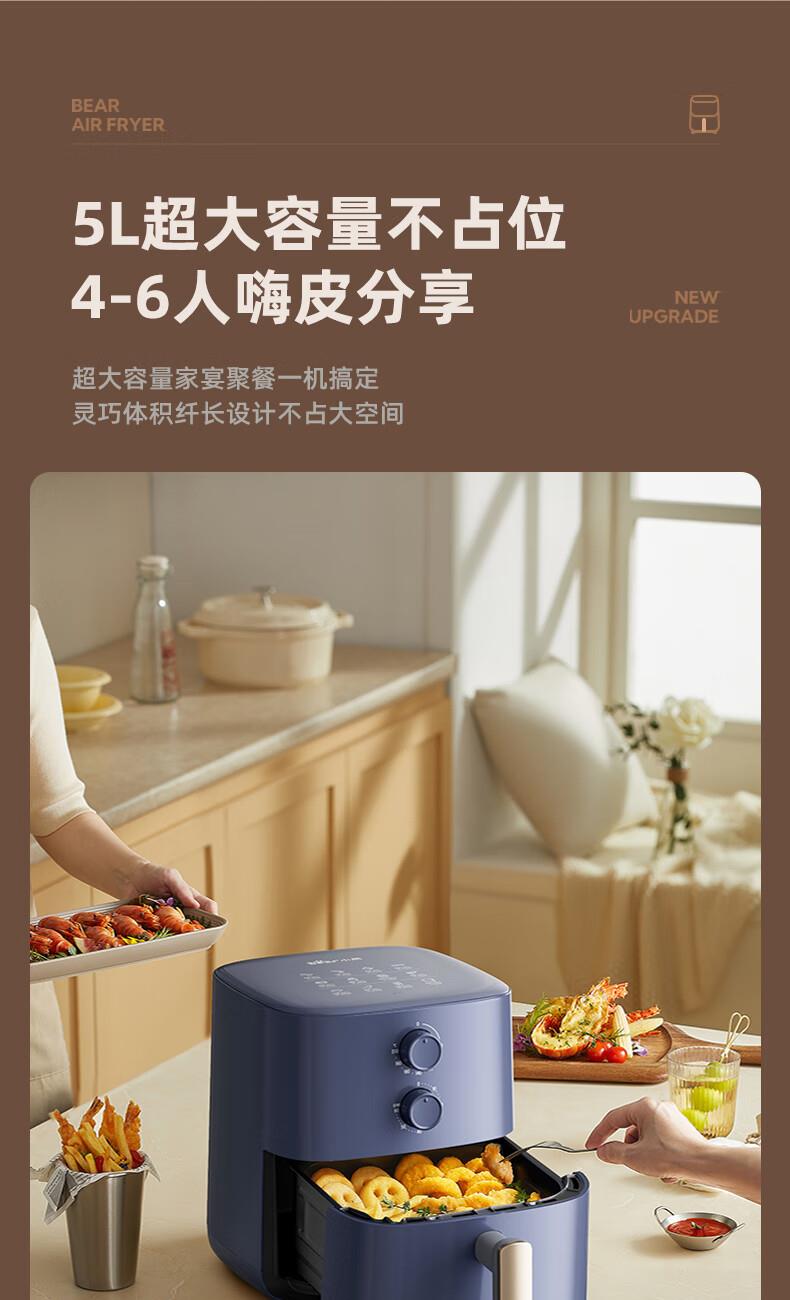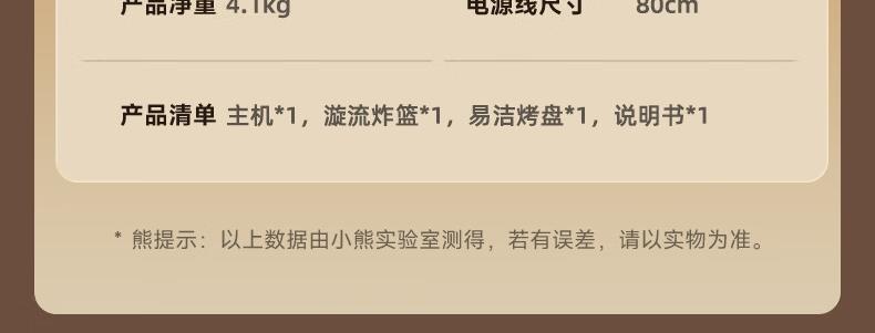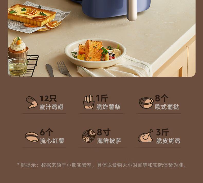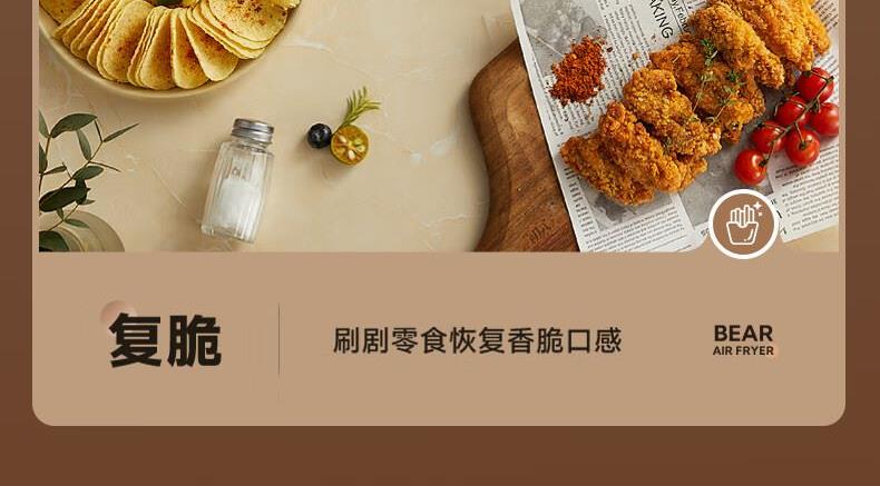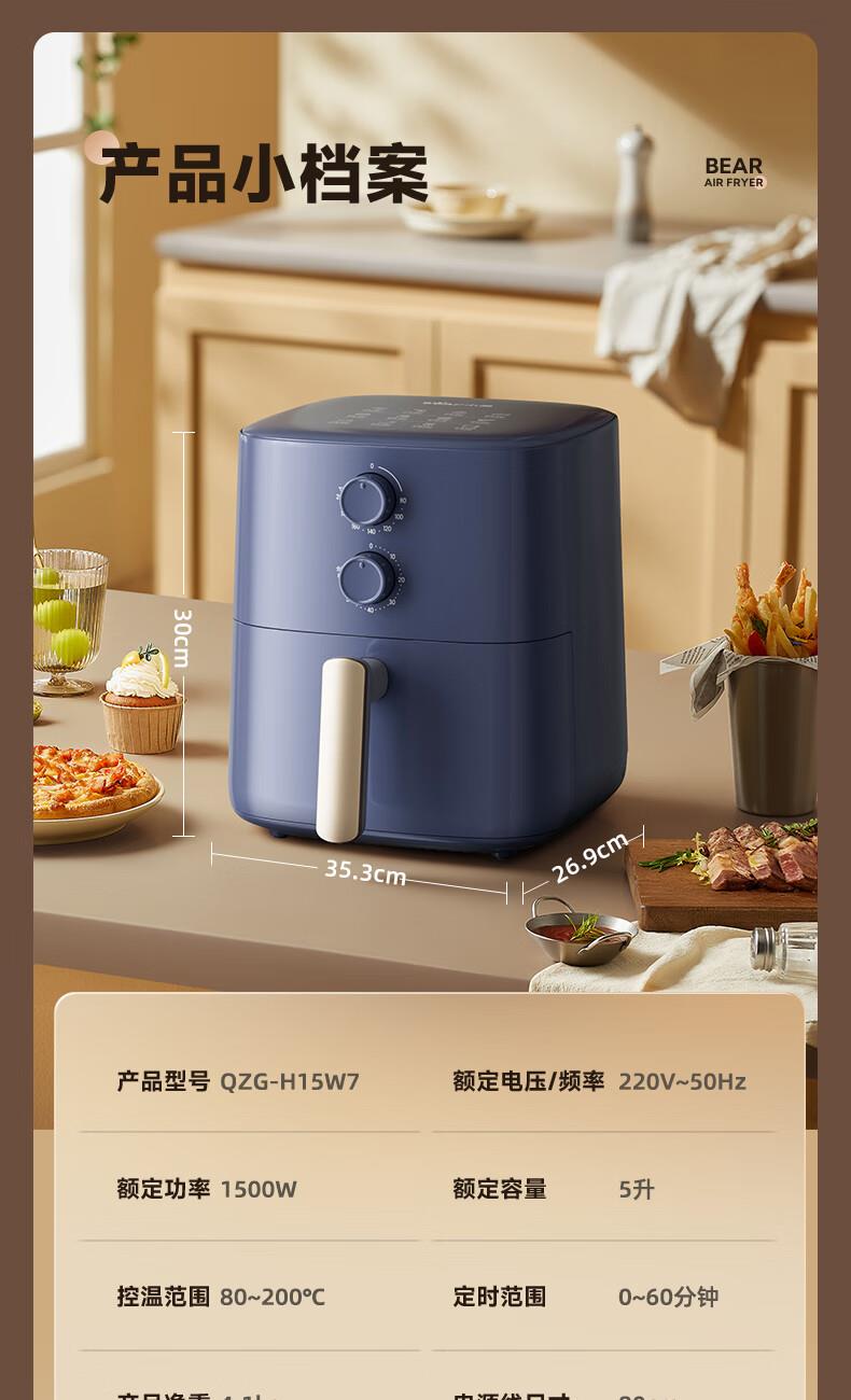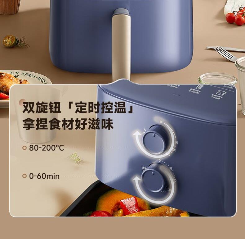 容量 5L 额定功率 1500W加热 产品重量 4KG 包装尺寸 391*316*347 1、免翻面结构设计 2、微蒸汽嫩烤,通过微蒸汽嫩烤补充食物水分 3、低噪音结构设计,噪音低至46db 4、5L家庭大容量 5、双旋钮操作简易方便,适合老人小孩