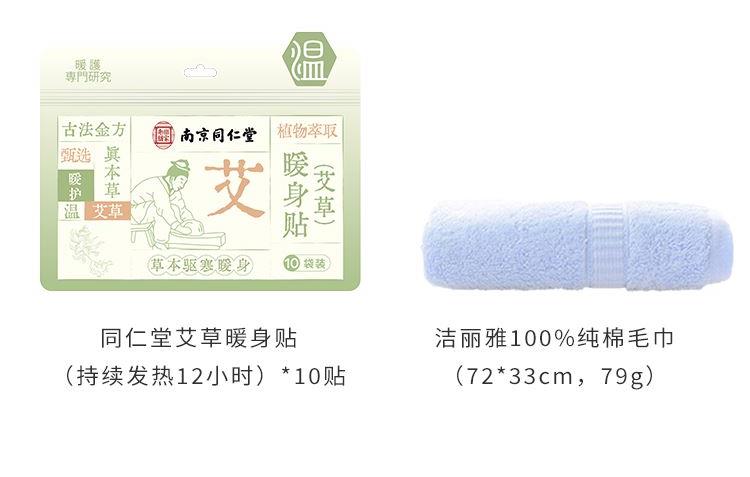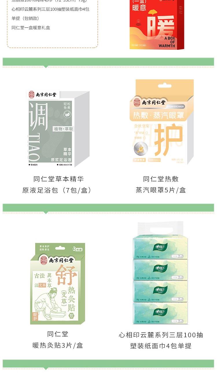 同仁堂艾草暖身贴(持续发热12小时)*10贴 同仁堂暖热灸贴3片/盒 同仁堂热敷蒸汽眼罩5片/盒 同仁堂草本精华原液足浴包(7包/盒) 洁丽雅纯棉毛巾(72*33cm,79g) 心相印云麓系列三层100抽塑装纸面巾4包单提(包销款) 思珀莱一盒暖意礼盒