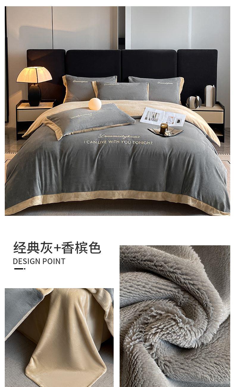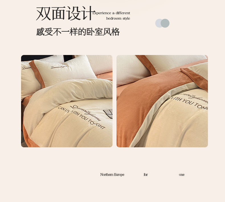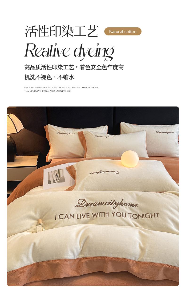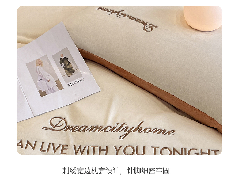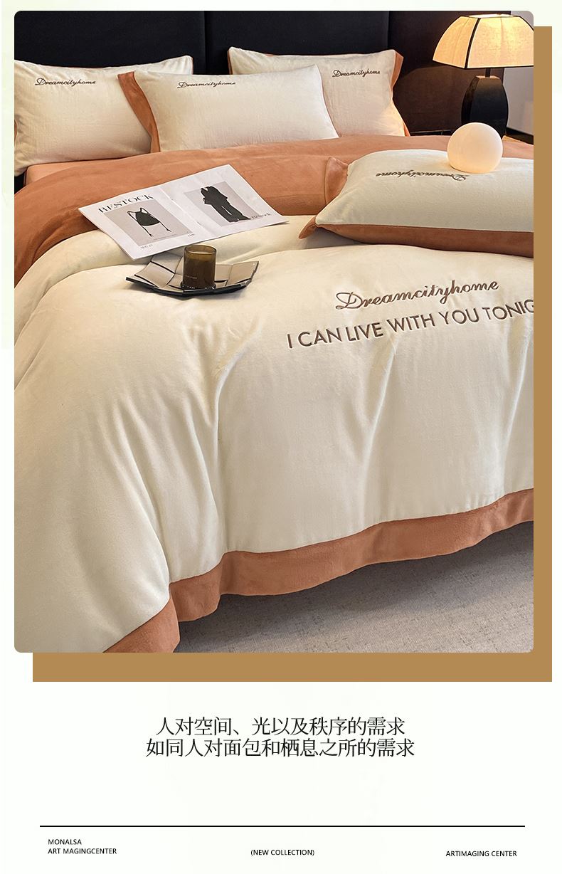 精选高克重牛奶绒面料,绒毛浓密厚实,上手便是满溢的柔软。不同于普通绒类的单薄,高克重带来的是实打实的温暖包裹感 —— 刚钻进被窝,暖意就顺着肌肤蔓延开来,无需再忍受 “冷被窝” 的煎熬。时尚双拼配色,将两种温柔色调巧妙融合,既有撞色的灵动感,又不失简约大气。无论是莫兰迪色系的低饱和碰撞,还是经典深浅色的搭配,都能轻松适配现代、北欧、ins 等多种家居风格。
