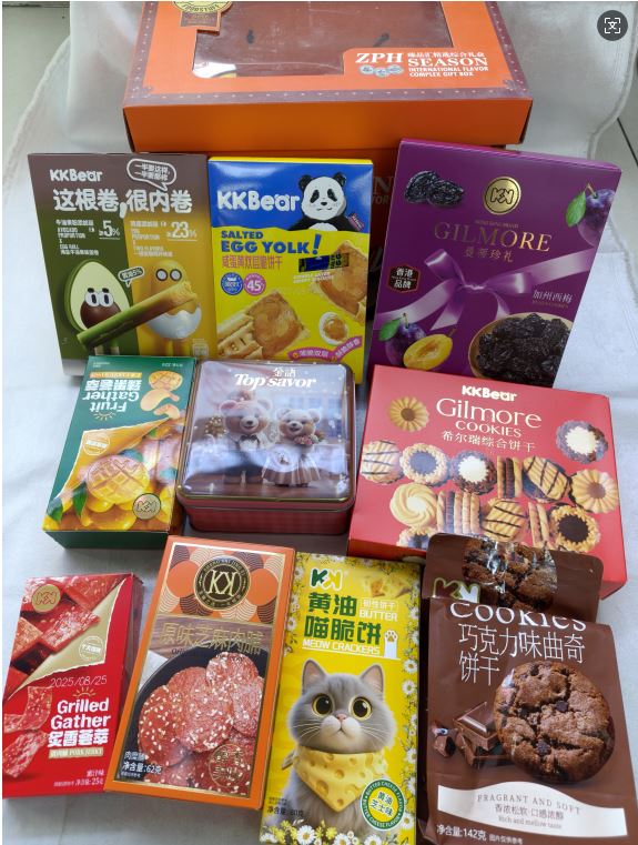 1.超友味希尔瑞综合饼干 2.原味黑芝麻肉脯62g 3.超友味咸蛋黄双层脆饼干 4.超友味曼蒂珍礼西梅干 5.超友味臻果荟萃芒果干 6.超友味炙香荟萃 7.这根卷果味蛋卷 8.KK黄油喵脆饼 9.方盒小熊卡布奇诺风味饼干 10.巧克力味曲奇