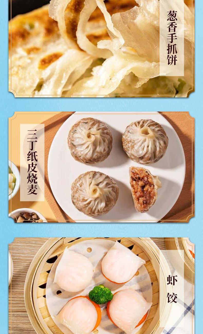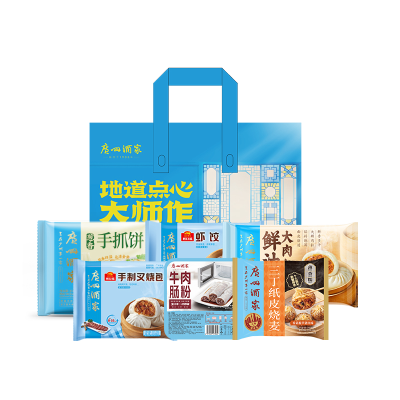 中华粤菜标杆 无需茶楼排队,在家轻松复刻地道广式饮茶体验 省心、放心和正宗的味道 礼盒尺寸:39.5*28*23cm 内容物:虾饺(160g) 三丁纸皮烧麦(240g) 葱香手抓饼(450g) 牛肉肠粉(185g) 手制叉烧包(337.5g) 鲜汁大肉包(390g)