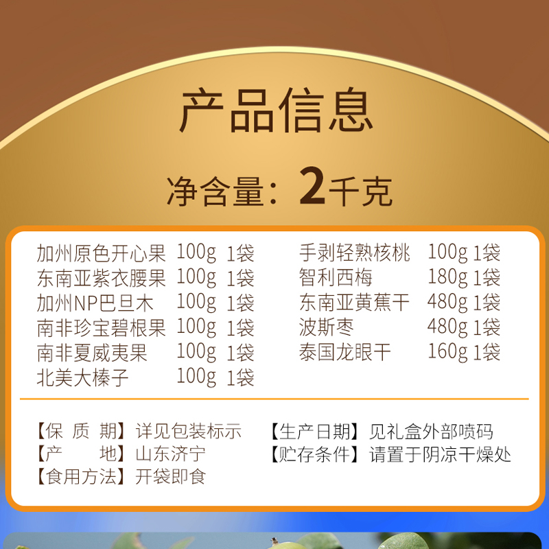 加州原色开心果 100g*1 东南亚紫衣腰果 100g*1 加州NP巴旦木 100g*1 南非珍宝碧根果 100g*1 南非夏威夷果 100g*1 北美大榛子 100g*1 手剥轻熟核桃 100g*1 智利西梅 180g*1 东南亚黄蕉干 480g*1 波斯枣 480g*1 泰国龙眼干 160g*1 合计:2000g