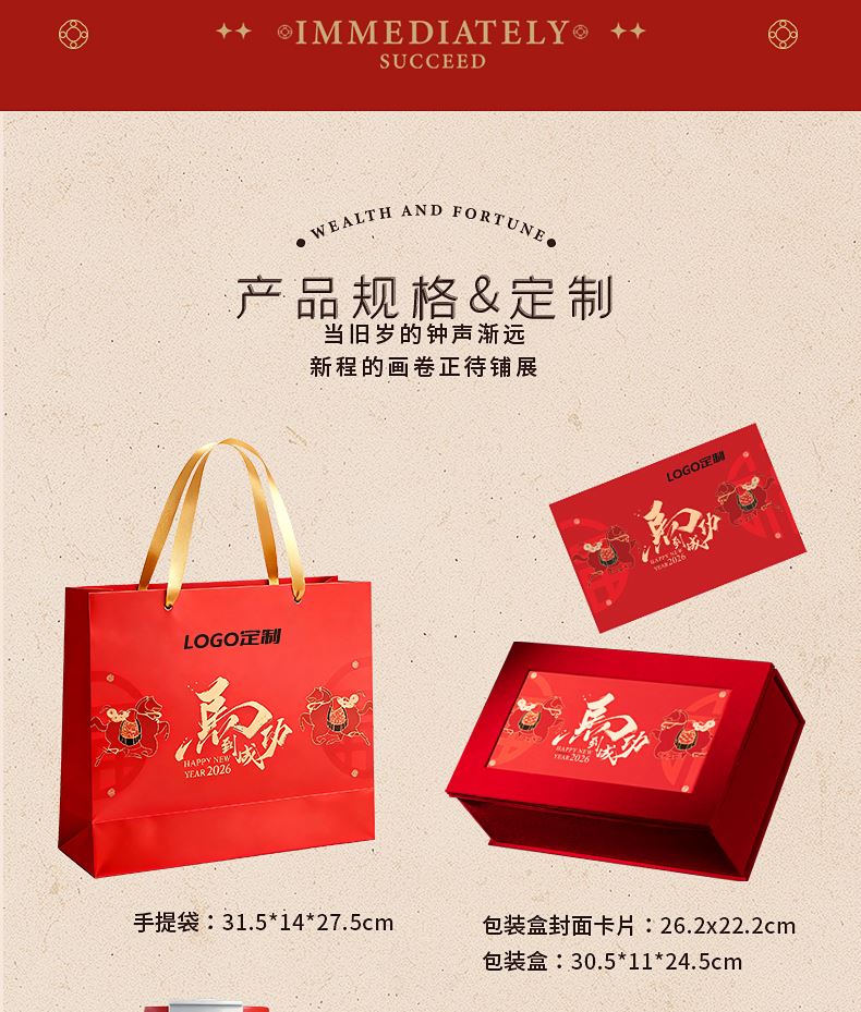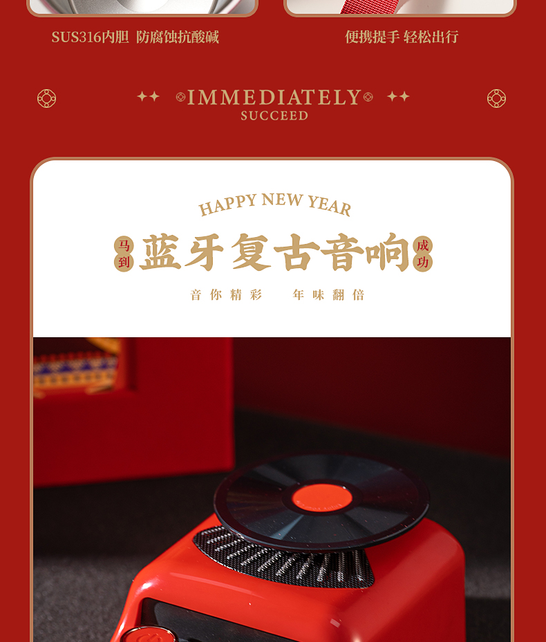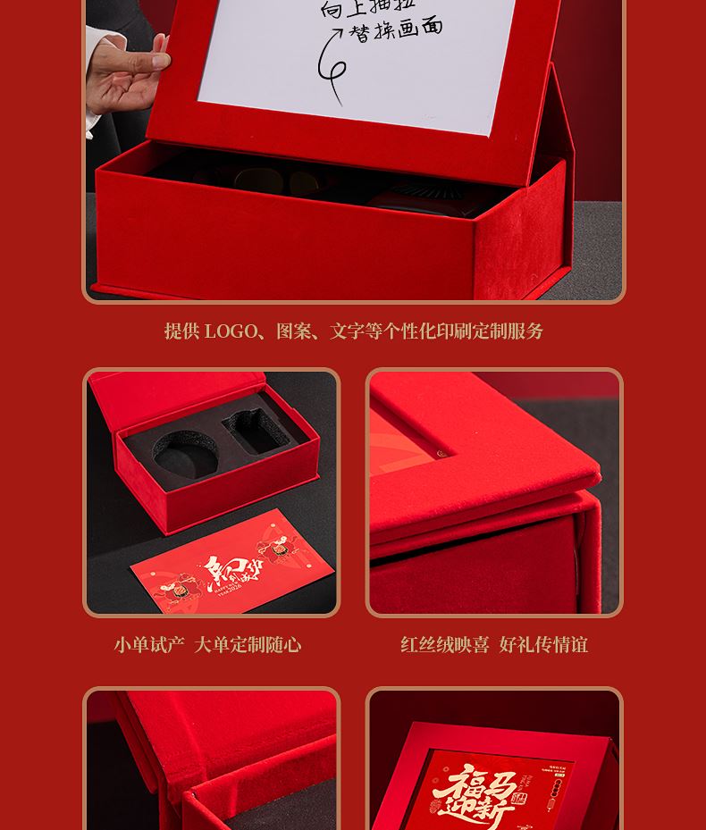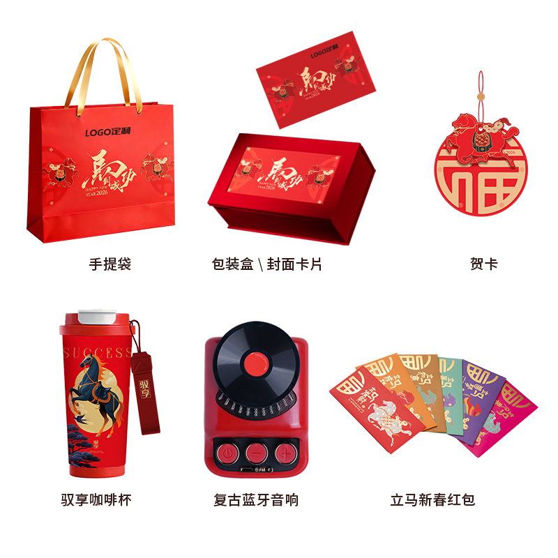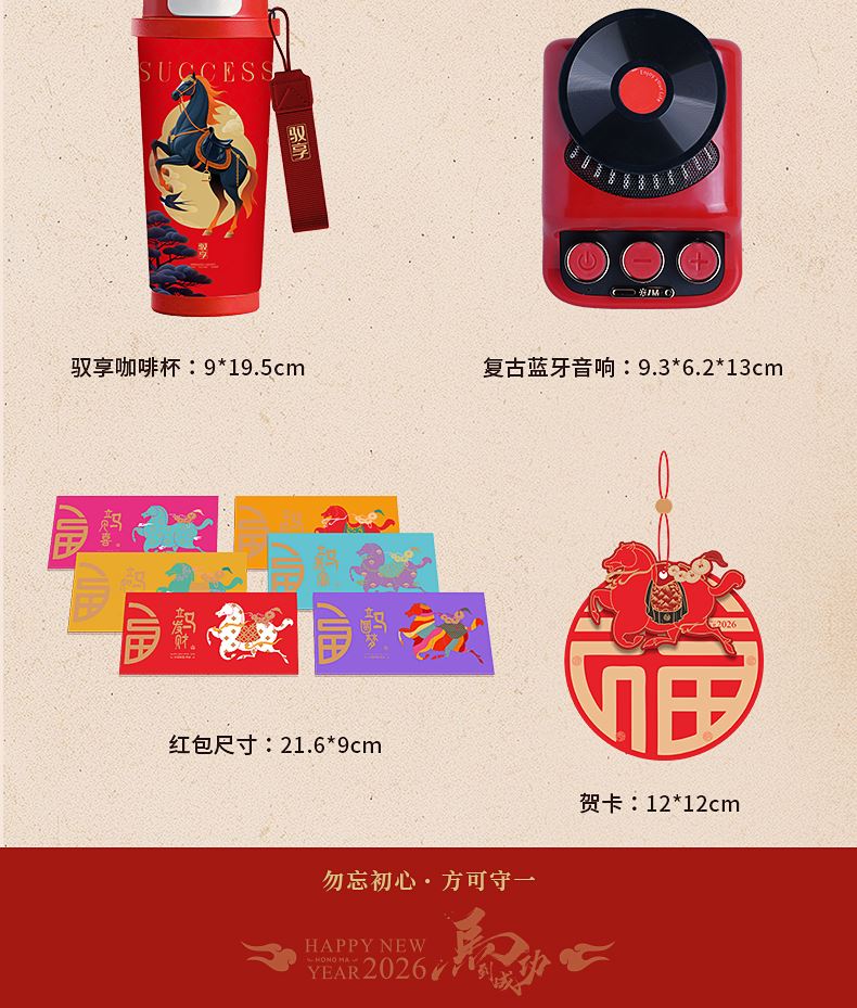 1、红色咖啡杯:500ML 内316 2、好运复古蓝牙音箱:蓝牙、氛围灯、趣味按键 3、新年红包*6:开启新年好运程 4、绒面礼盒:日历功能、收纳功能 用完不闲置 注:礼盒可专版定制画面