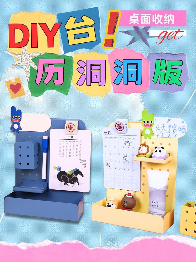 桌面洞洞板*1 23cm*18cm (山影蓝/奶黄色) 挂件笔筒*1 6.5cm*5cm 磁铁夹子*1 3.5cm*3cm 记事月历*1 10cm*15cm 13张 免钉小层架*1 7.5cm*4.5cm 磁吸白板+白板笔*1 11cm*6.5cm 包装盒尺寸:27.5*23.3*10.5cm
