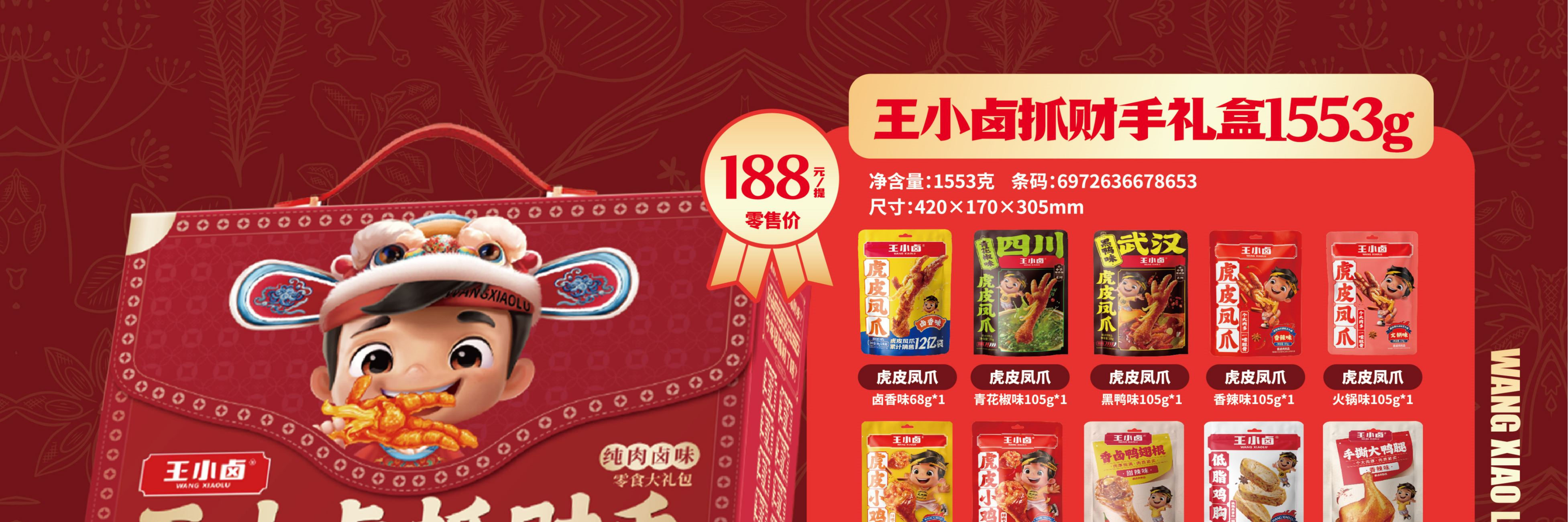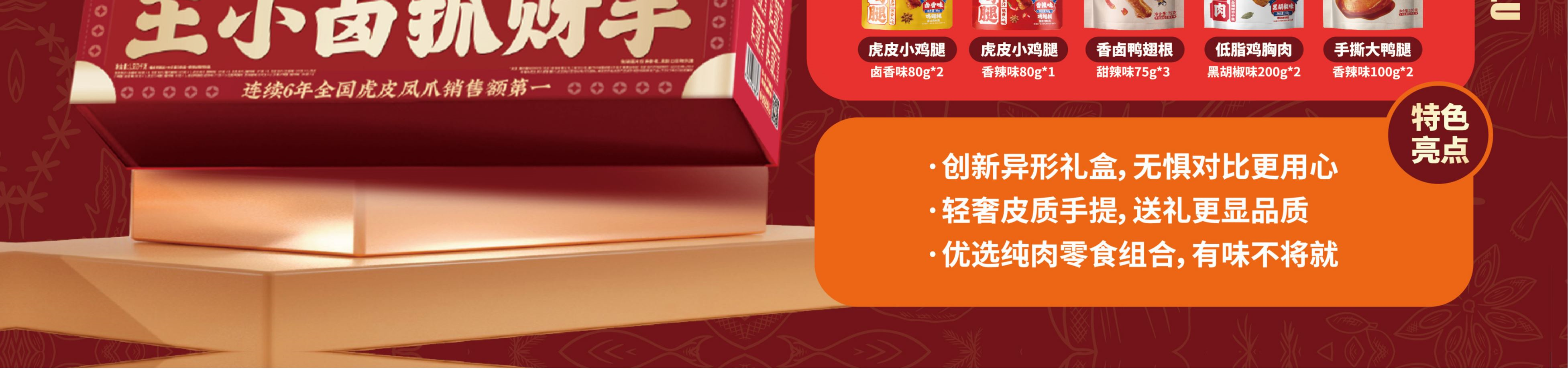 配置: 鸡翅根-卤香-80g×2、 鸡翅根-香辣-80g×1、 虎皮凤爪-卤香-68g×1、 虎皮凤爪-青花椒-105g×1、 虎皮凤爪-黑鸭-105g×1、 虎皮凤爪-香辣-105g×1、 虎皮凤爪-火锅-105g×1、 鸭翅根-甜辣-75g×3、 鸡胸肉-黑胡椒-200g×2、 手撕鸭腿-香辣-100g×2