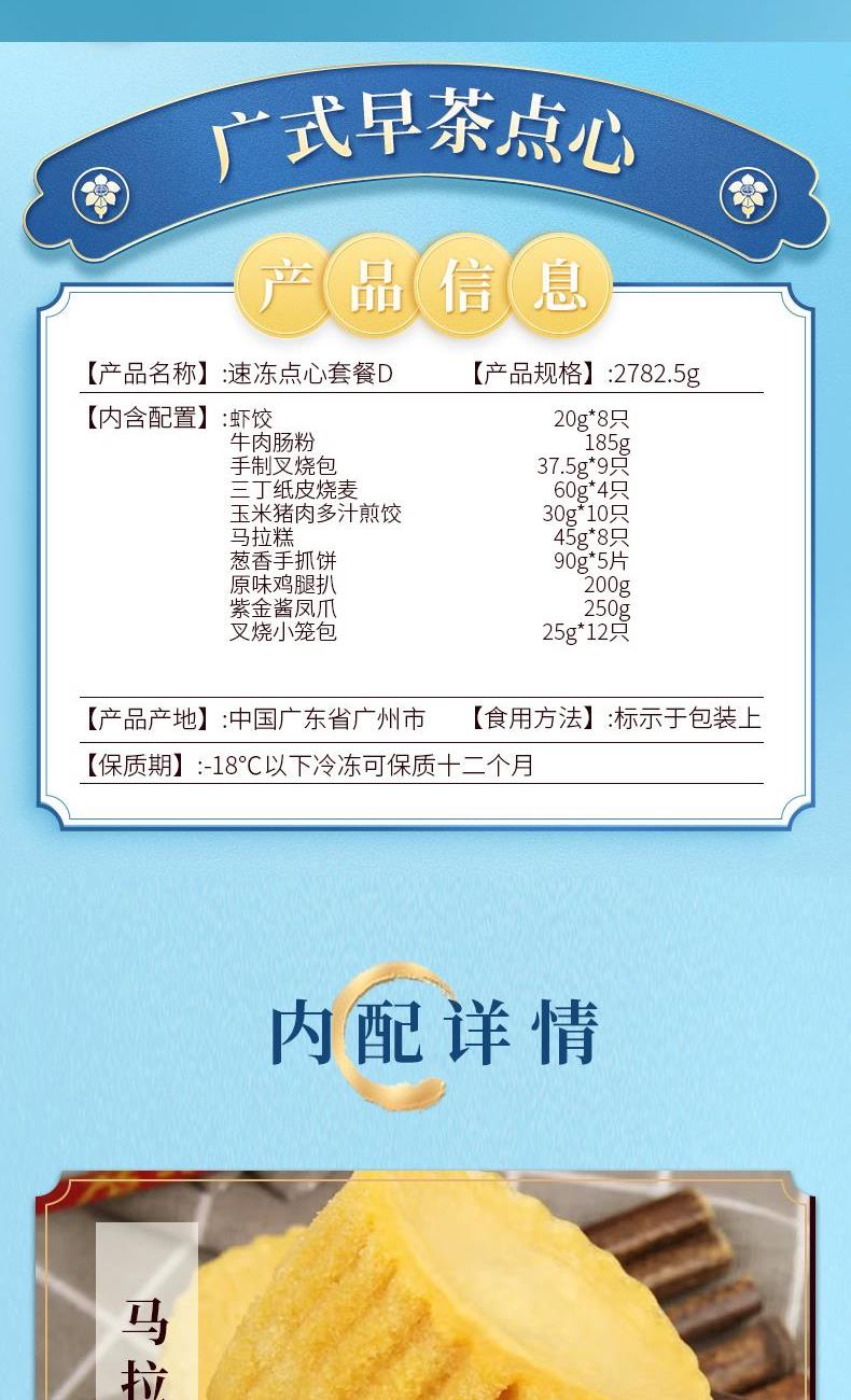 中华粤菜标杆 无需茶楼排队,在家轻松复刻地道广式饮茶体验 省心、放心和正宗的味道。 礼盒尺寸:42.5*29.5*26.5cm 内容物:虾饺(160g) 牛肉肠粉(185g) 手制叉烧包(337.5g) 三丁纸皮烧麦(240g) 玉米猪肉多汁煎饺(300g) 原味鸡腿扒 (200g) 葱香手抓饼(450g) 马拉糕(360g) 紫金酱凤爪(250g) 叉烧小笼包(300g)