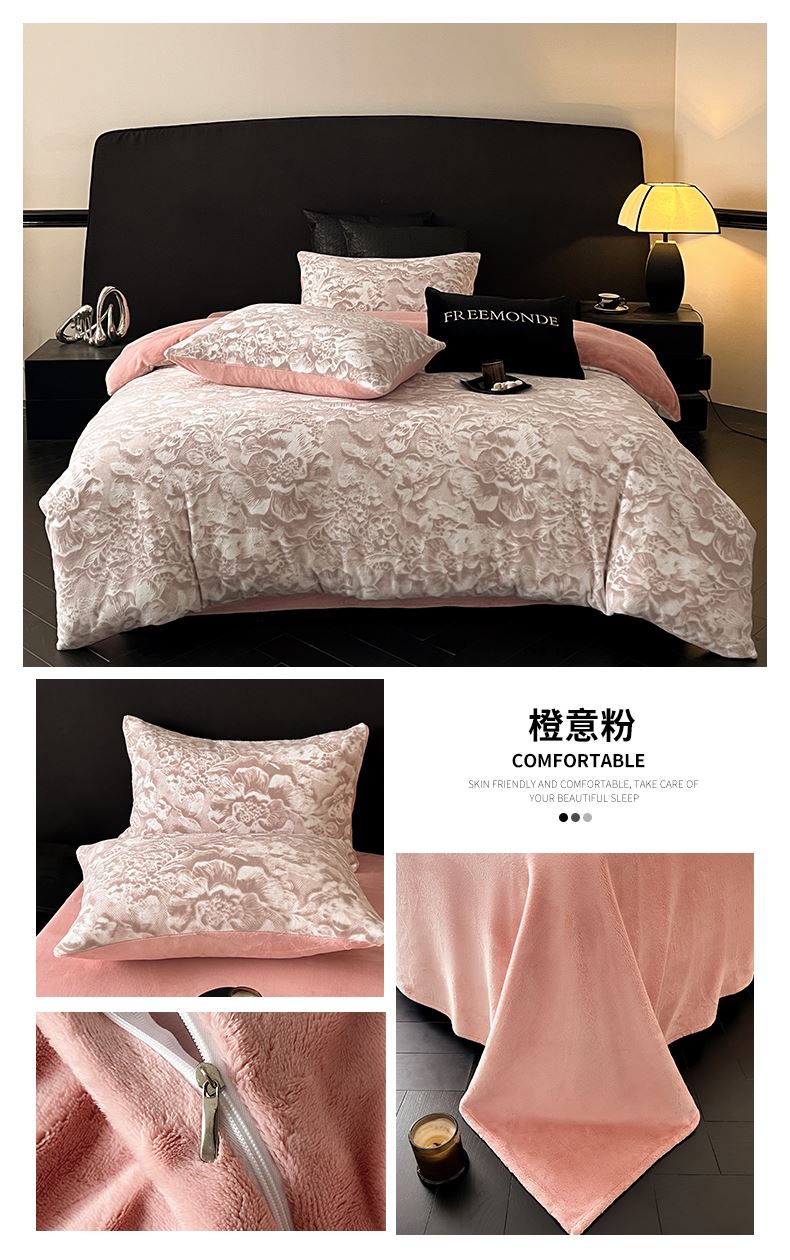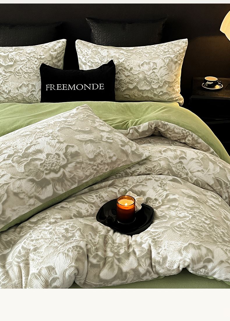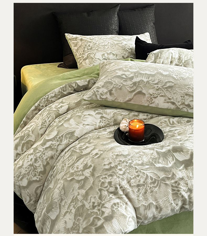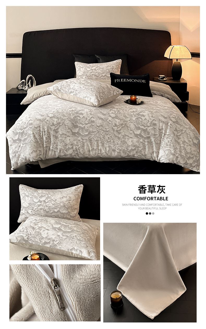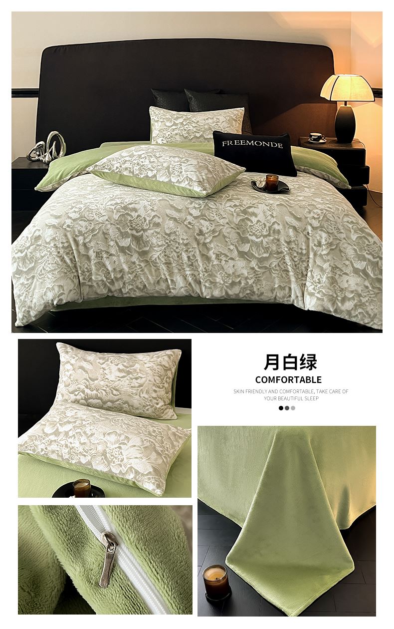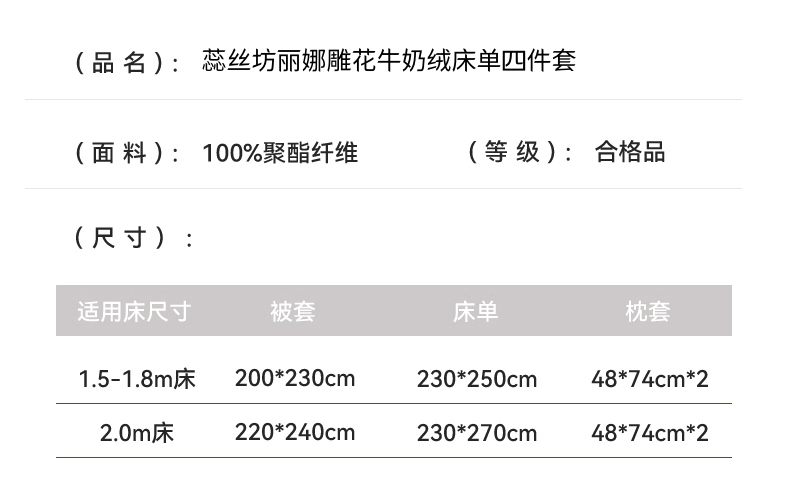 规格:1.5-1.8M床适用 被套200*230cm 床单230*250cm 枕套48*74cm 面料:牛奶绒 花色:香草灰、橙意粉、香槟色、月光绿 雕花牛奶绒面料,绒毛细密,不易起球和掉毛,撸猫般的柔顺手感,远离寒冬,高颜值AB双面设计,A面采用时髦洋气的印花图案点缀,栩栩如生,B面纯色简约,给卧室增添一抹冬日的亮色。