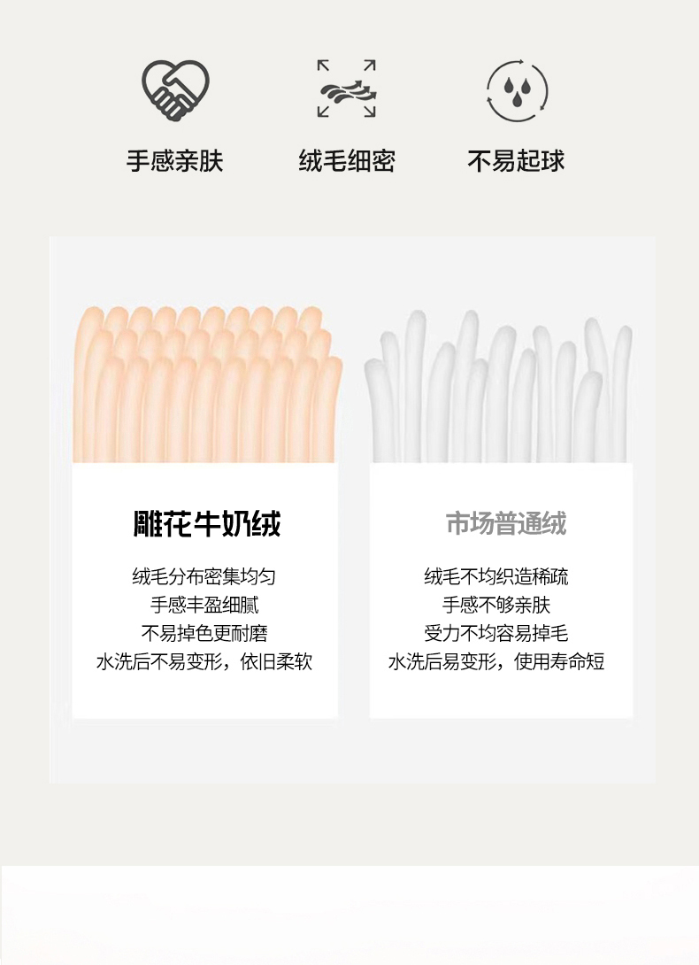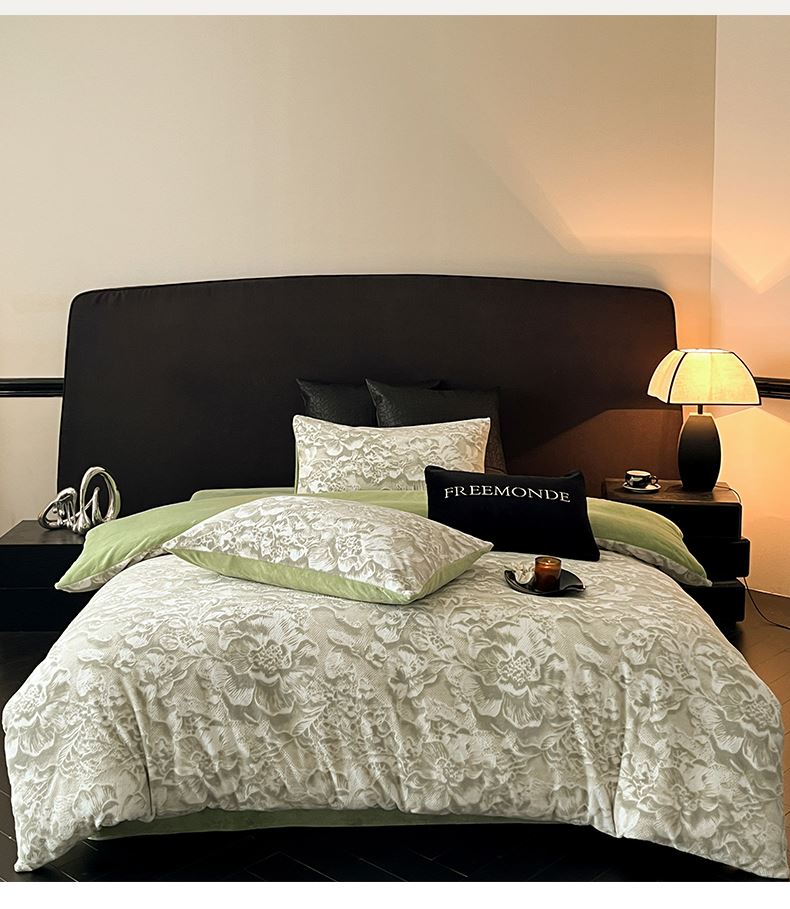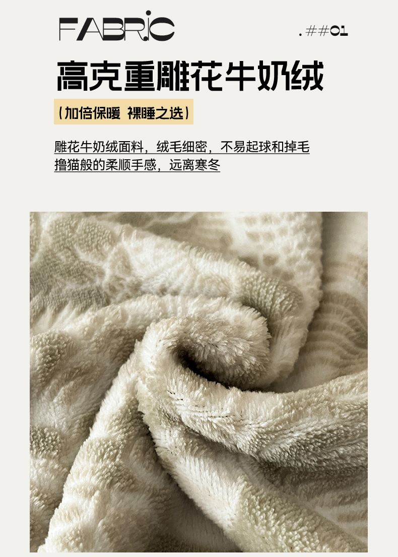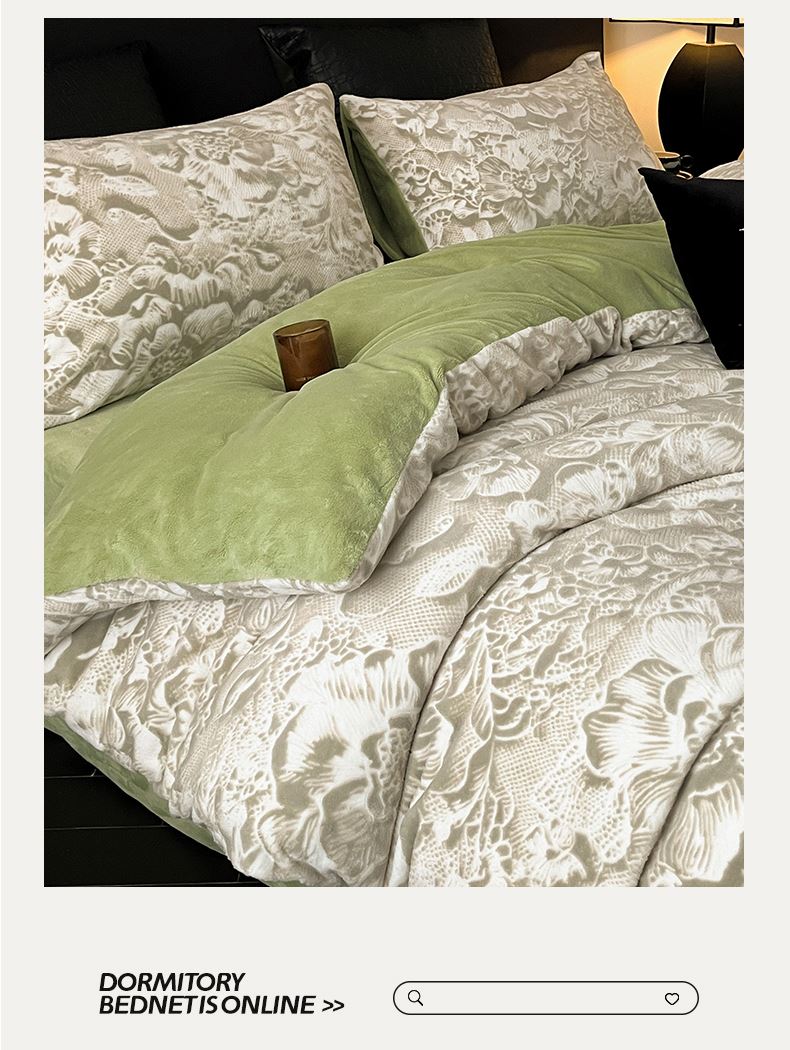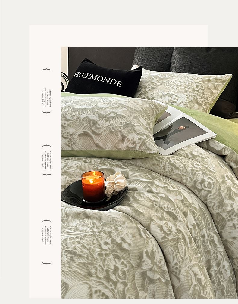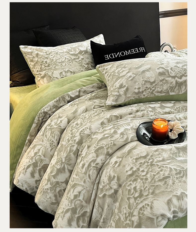 规格:1.5-1.8M床适用 被套200*230cm 床单230*250cm 枕套48*74cm 面料:牛奶绒 花色:香草灰、橙意粉、香槟色、月光绿 雕花牛奶绒面料,绒毛细密,不易起球和掉毛,撸猫般的柔顺手感,远离寒冬,高颜值AB双面设计,A面采用时髦洋气的印花图案点缀,栩栩如生,B面纯色简约,给卧室增添一抹冬日的亮色。