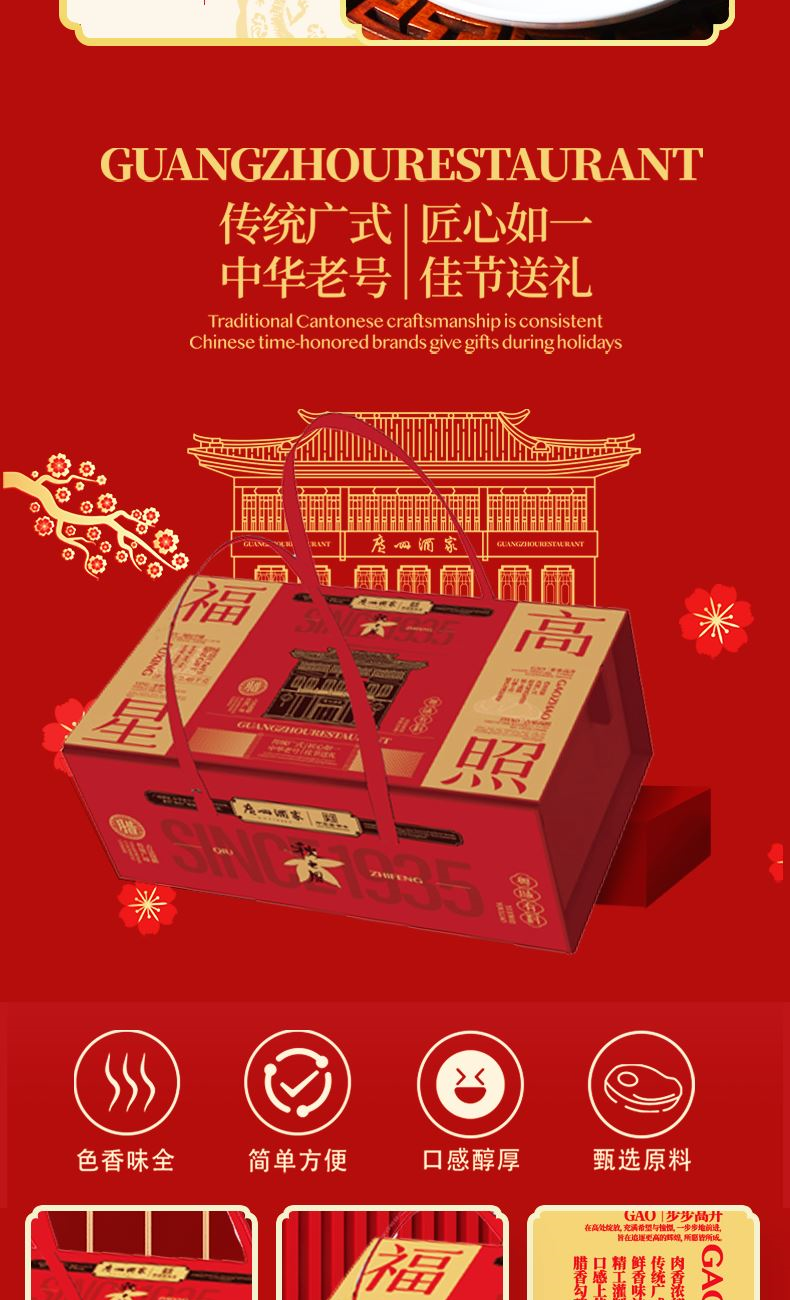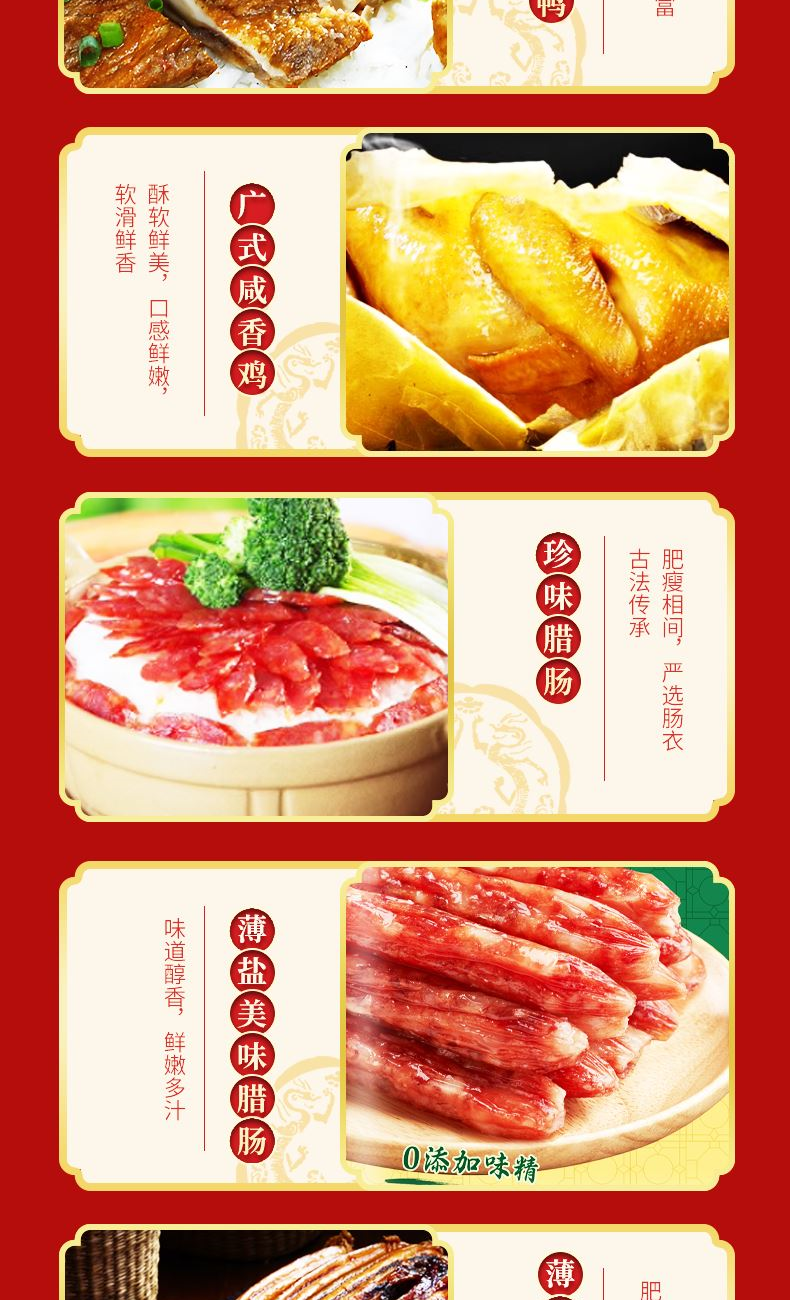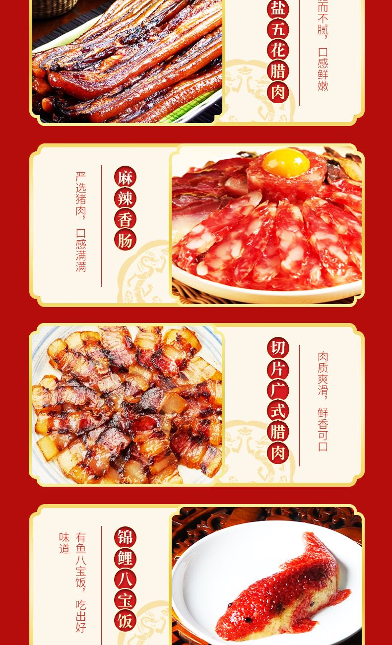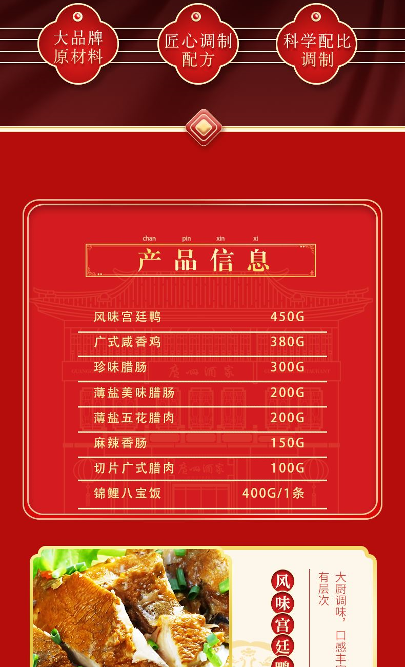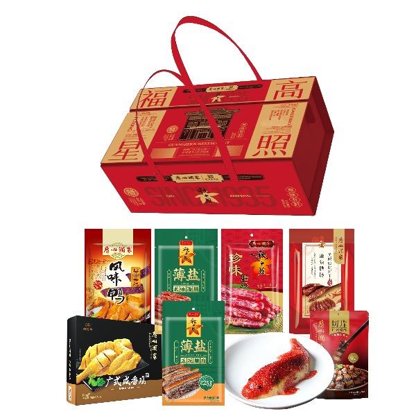 “食在广州” 承百年广府匠心,选上乘天然原料,遵古法生晒工艺 铸就一味甘香醇厚、寓意吉祥的岭南家宴至味 礼盒尺寸:35*22*15.5cm 内容物:珍味腊肠300g 广式咸香鸡380g 薄盐五花腊肉200g 麻辣香肠150g 风味宫廷鸭450g 切片广式腊肉100g 薄盐美味腊肠200克 赠:嘉庆斋锦鲤八宝鱼