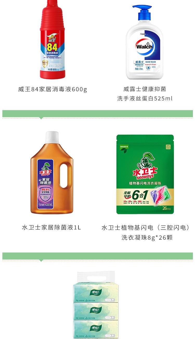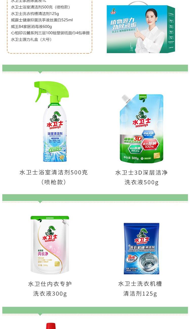 水卫士植物基闪电(三腔闪电)洗衣凝珠8g*26颗 水卫士3D深层洁净洗衣液500g 水卫仕内衣专护洗衣液300g 水卫士家清液1L 水卫士浴室清洁剂500克(喷枪款) 水卫士洗衣机槽清洁剂125g 威露士健康洗手液丝蛋白525ml 威王84家居消毒液600g 心相印云麓系列三层100抽塑装纸面巾4包单提 思珀莱源力礼盒(大号)