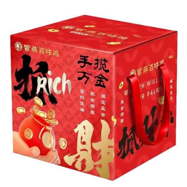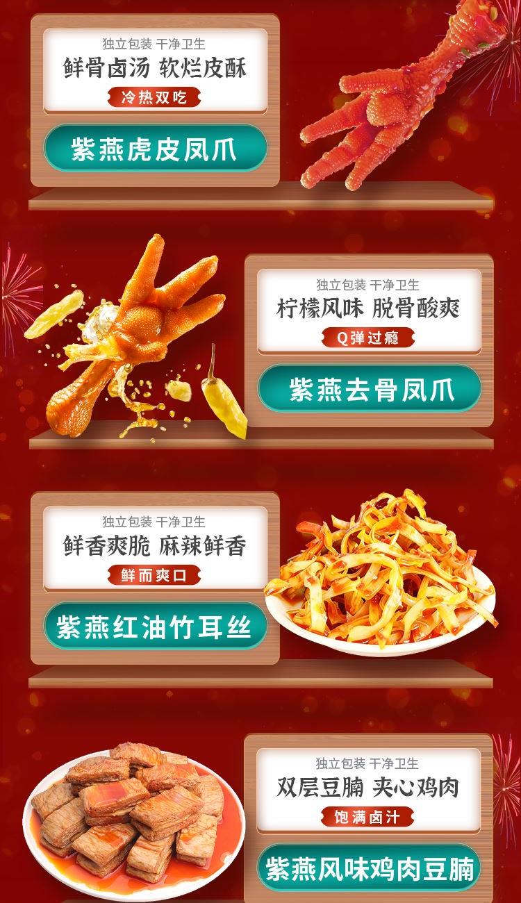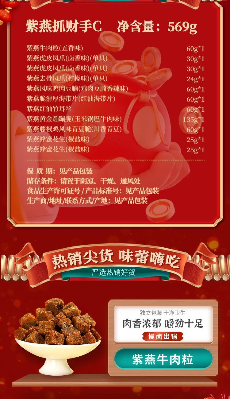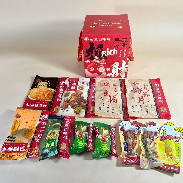 紫燕牛肉粒(五香味)60g*1 紫燕虎皮凤爪(卤香味)(单只)30g*2 紫燕去骨凤爪(柠檬味)(单只)24g*1 紫燕风味鸡肉豆腩(鸡肉豆腩香辣味)60g*1 紫燕脆滑厚海带片(红油海带片)60g*1 紫燕红油竹耳丝60g*1 紫燕黄金蹦蹦脆(玉米锅巴牛肉味)135g*1 紫燕藤椒鸡风味青豆脆(川香青豆)60g*1 紫燕蜂蜜花生(椒盐味)25g*2 礼盒+组装+外盒