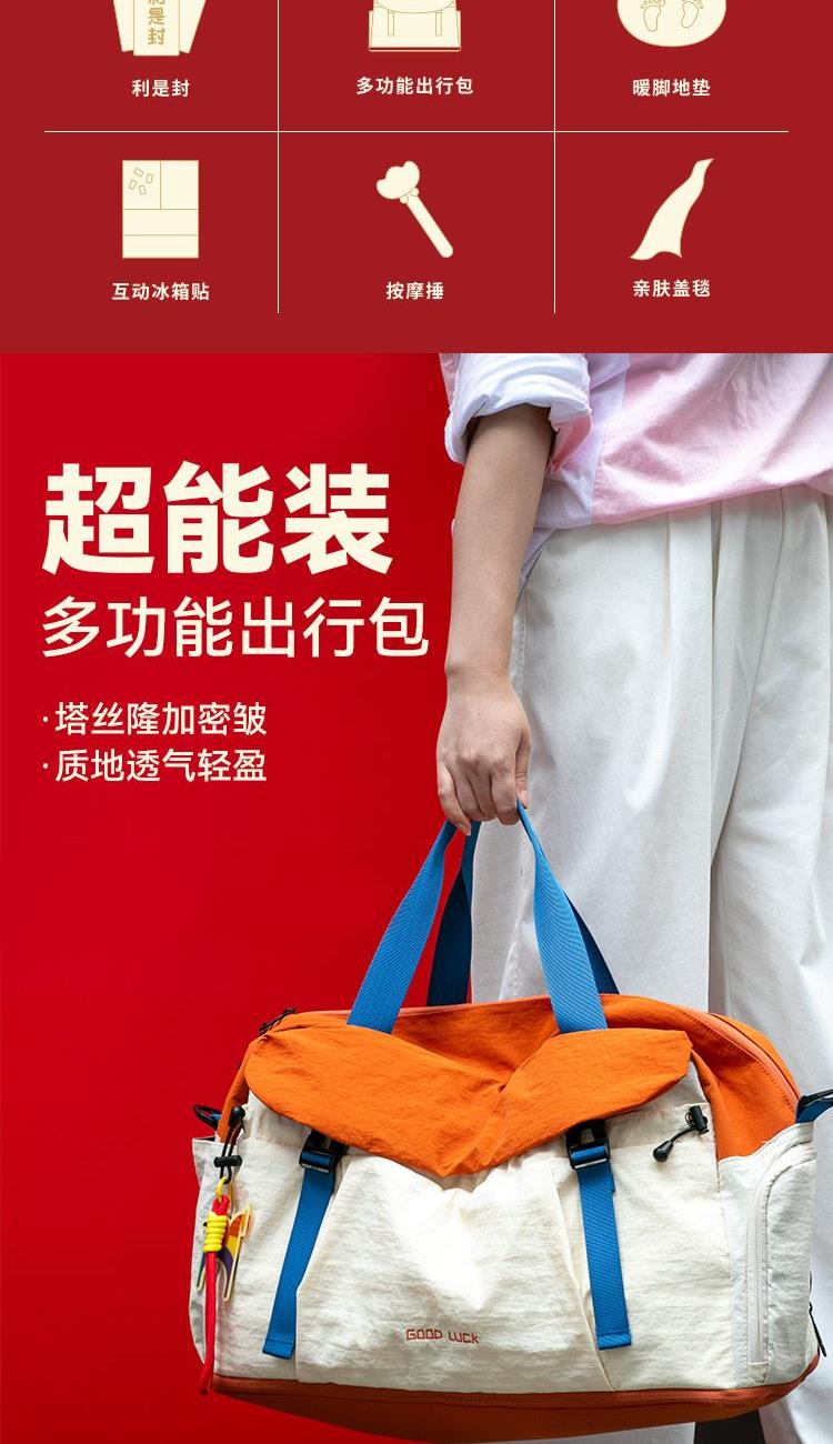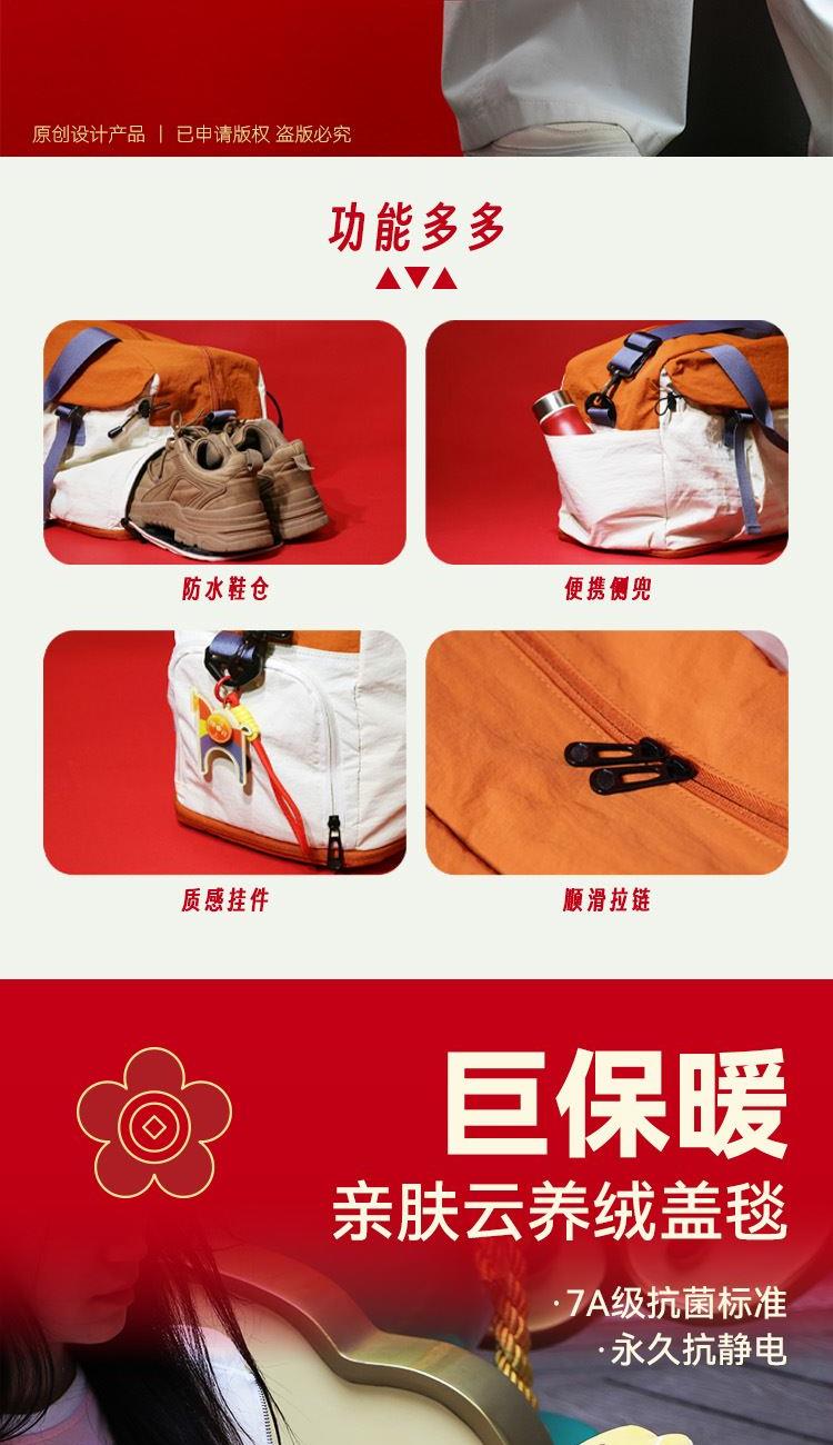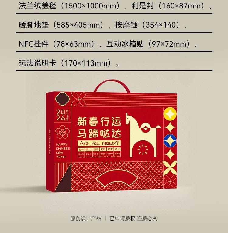 利是封*6 多功能出行包*1 暖脚地垫*1 互动冰箱贴*1 按摩捶*1 双层云氧绒盖毯版*1 玩法说明卡*1 NFC互动挂件*1