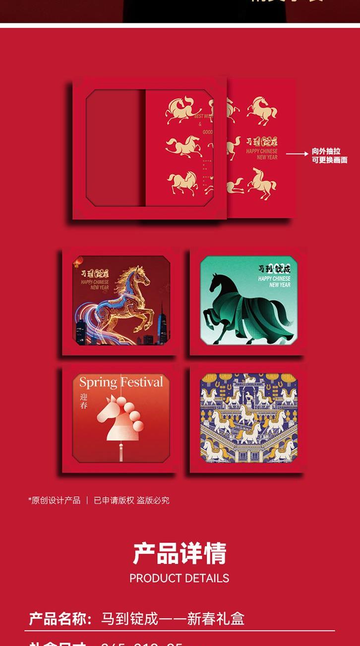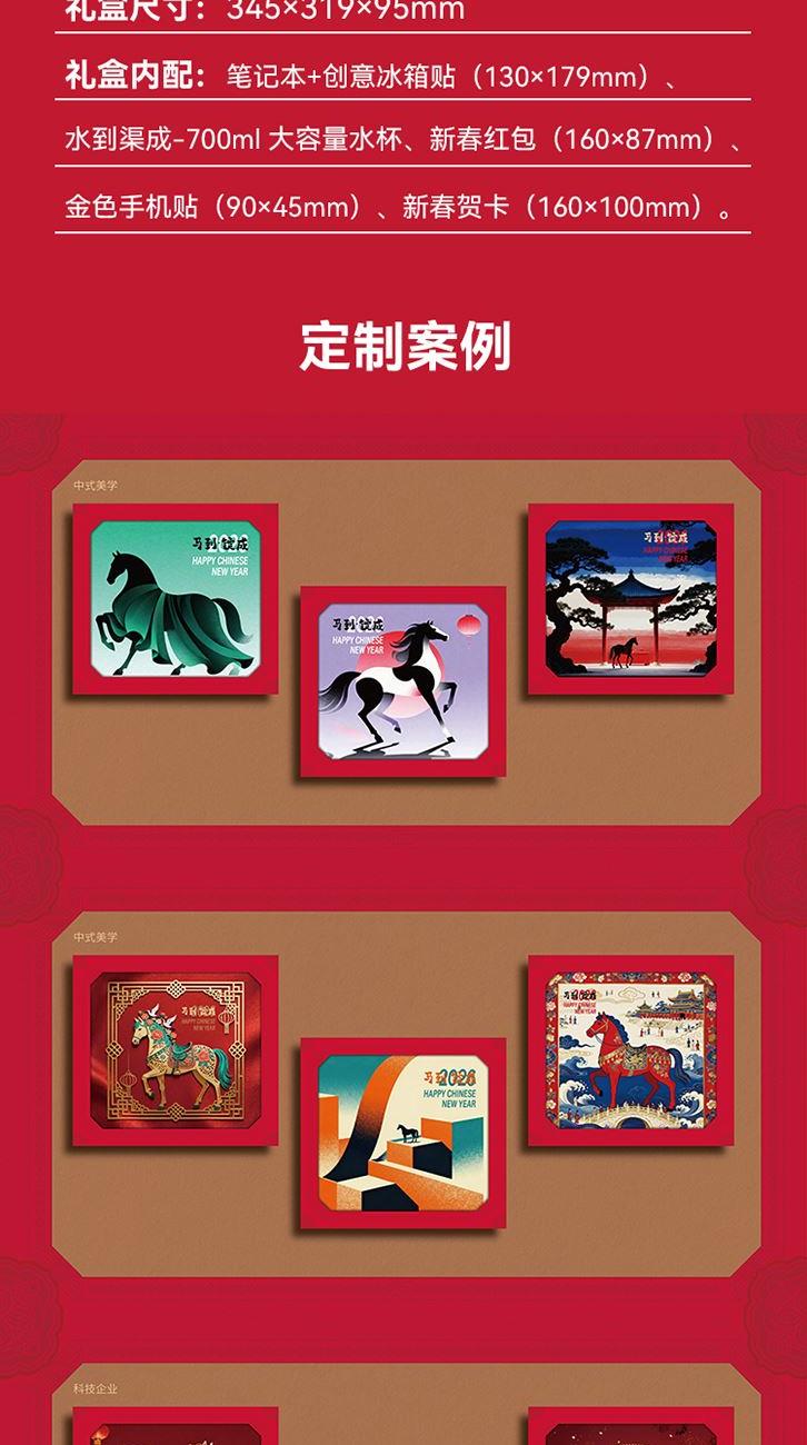 马到·锭成 水到渠成-700ml 大容量水杯*1 马到·锭成-笔记本+创意冰箱贴*1 马到·锭成-新春红包*6 马到·锭成-新春贺卡*1 马到·锭成-金色手机贴*1