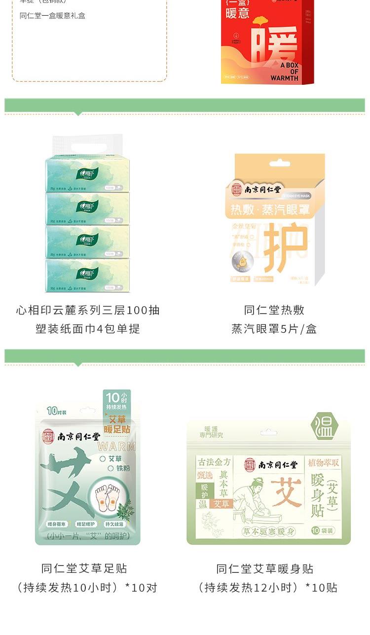 同仁堂艾草暖身贴(持续发热12小时)*10贴 同仁堂艾草足贴(持续发热10小时)*10对 同仁堂热敷蒸汽眼罩5片/盒 心相印云麓系列三层100抽塑装纸面巾4包单提(包销款) 思珀莱一盒暖意礼盒