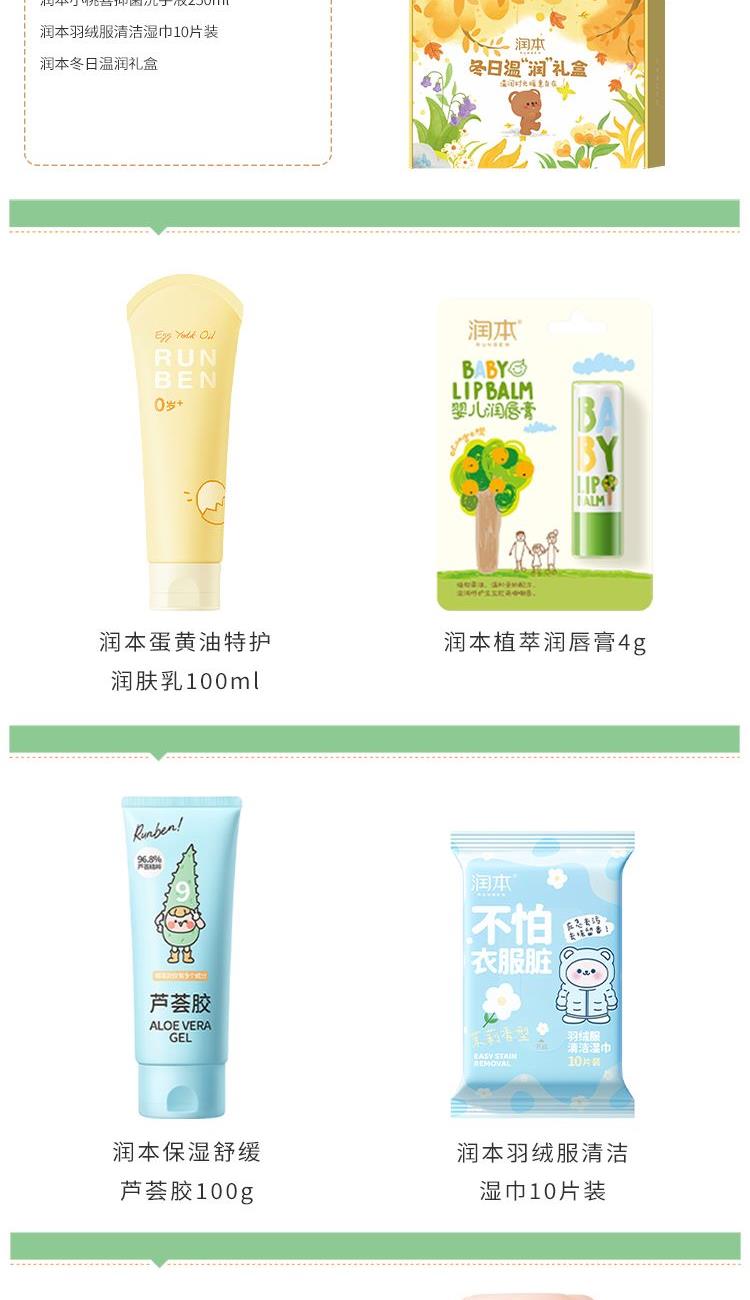 润本蛋黄油特护润肤乳100ml 润本植萃润唇膏4g 润本小桃喜透润保湿喷雾30ml 润本保湿舒缓芦荟胶100g 润本小桃喜洗手液250ml 润本羽绒服清洁湿巾10片装 思珀莱冬日温润礼盒
