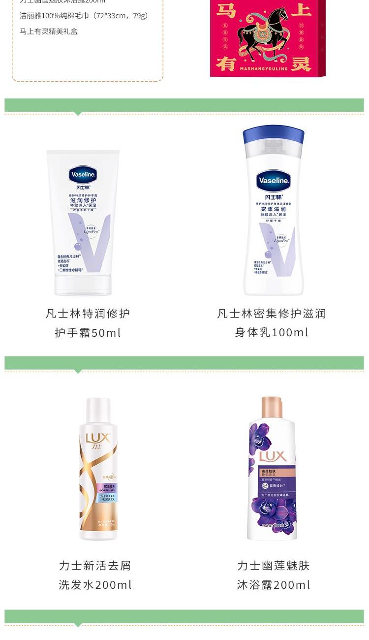 凡士林密集修护滋润身体乳100ml 凡士林特润修护护手霜50ml 凡士林修护润唇膏原味3.5g 力士新活去屑洗发水200ml 力士幽莲魅肤沐浴露200ml 洁丽雅纯棉毛巾(72*33cm,79g) 马上有灵精美礼盒