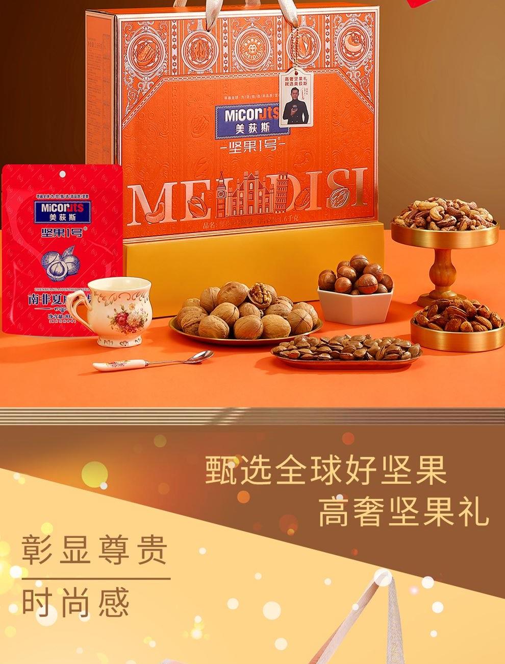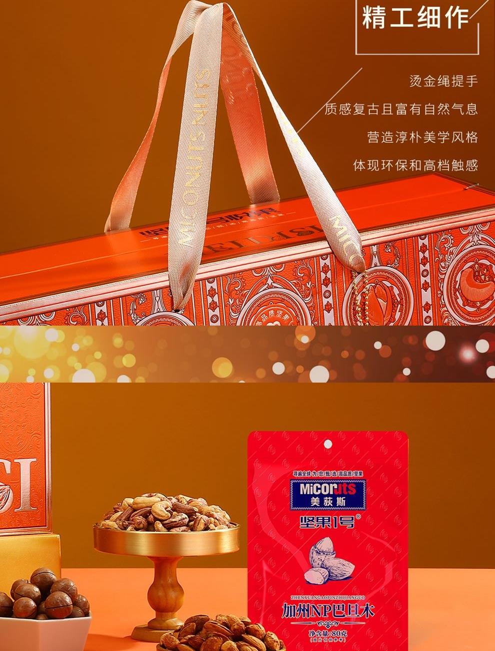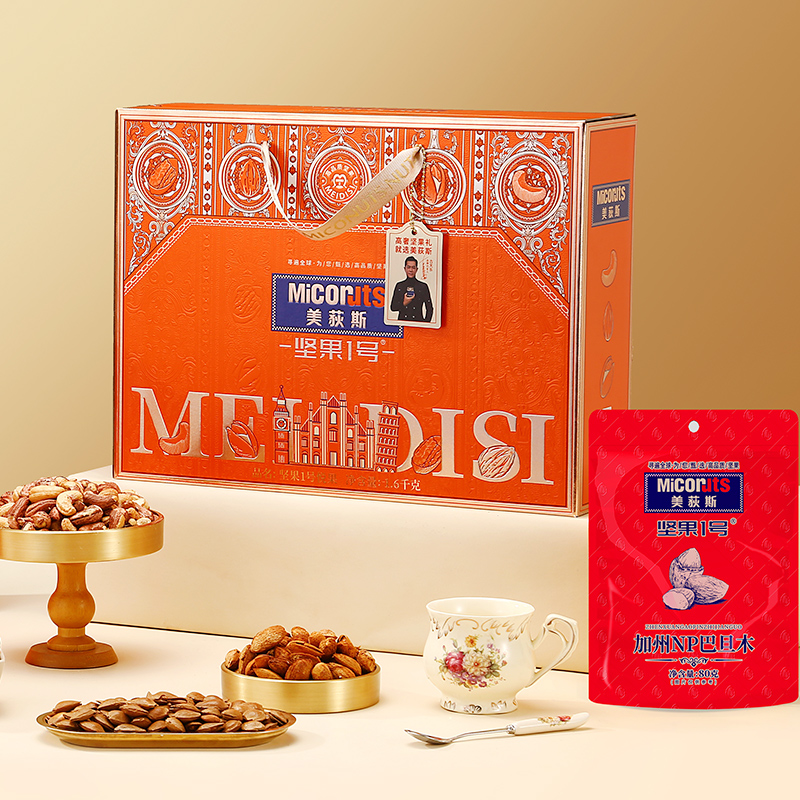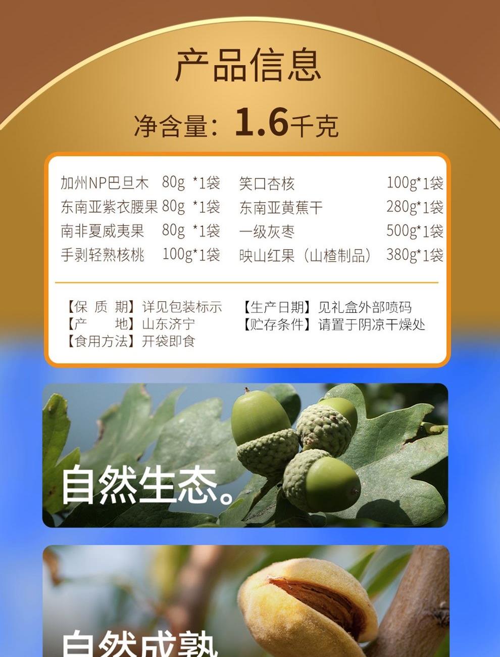 加州NP巴旦木 80g*1 东南亚紫衣腰果 80g*1 南非夏威夷果 80g*1 手剥轻熟核桃 100g*1 笑口杏核 100g*1 东南亚黄蕉干 280g*1 一级灰枣 500g*1 映山红果 380g*1 合计:1600g