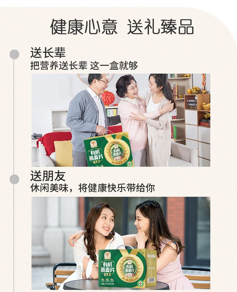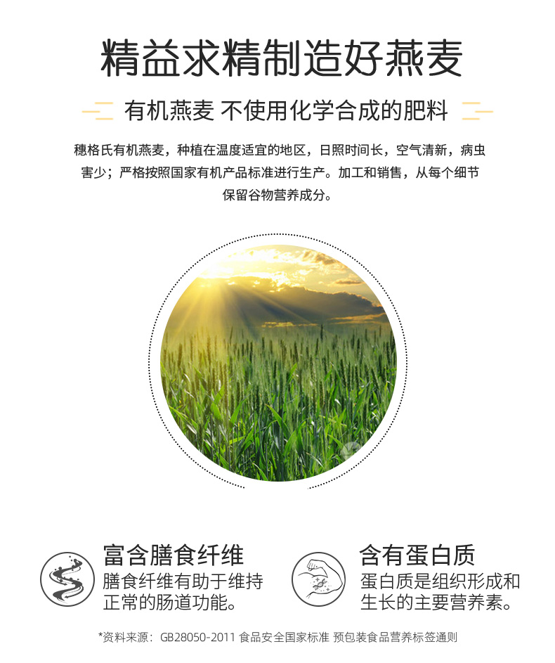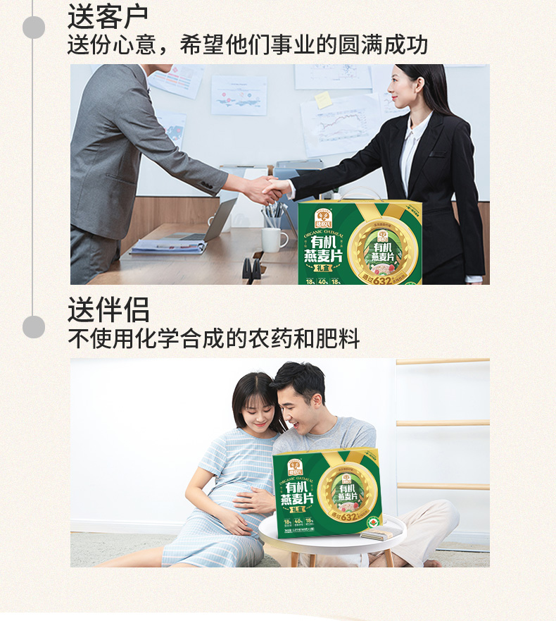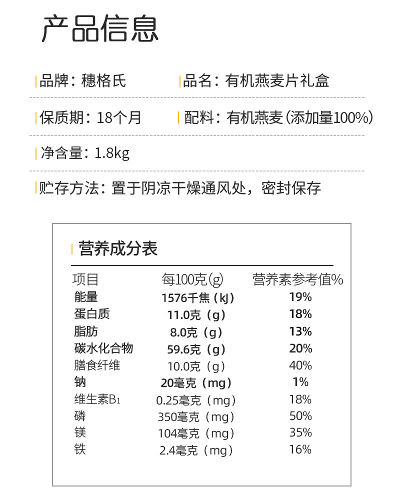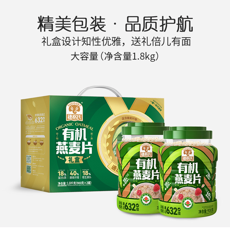 穗格氏有机燕麦礼盒1.8kg 配料表:有机燕麦片 产品卖点: 1,一罐一码 全程有机可追溯; 2,穗格氏专属有机种植基地,张家口市农业科学院育成品种“坝莜一号”; 3,高膳食纤维,含有蛋白质,无添加蔗糖,含维生素B1; 4,通过632项农残检测; 5,适合青少年,上班族,宝妈,中老年人的有机新生活。 6,精美年货礼盒。