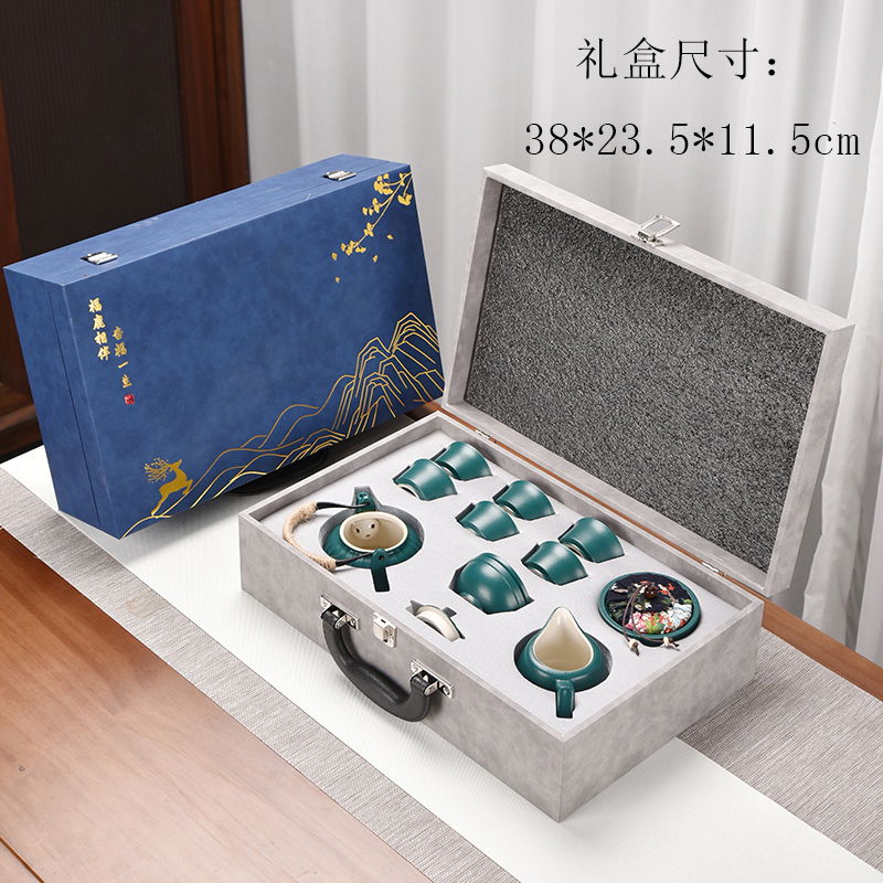 配制:1壶 6杯 1茶叶罐1公道杯1茶托1茶漏 1茶道6件套 1礼盒 材质:细陶 规格: 茶壶:11.7*9.5cm 杯: 6.3*3.3cm 茶叶罐: 8*7cm 公道杯:11.9*8.5cm 推荐说明:绿色茶具套装。亚光磨砂釉茶具,手感舒适。16头一应俱全,大气实用
