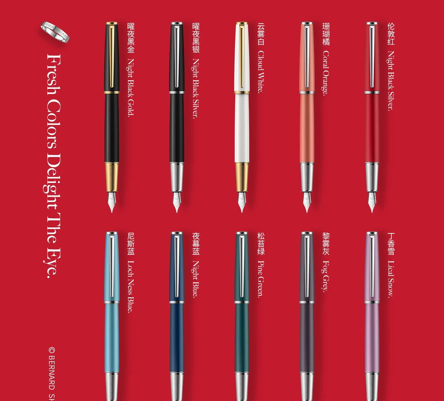 墨水笔类型:螺纹上墨式 墨水笔重量:墨水/宝珠笔31g/35g 颜色分类:曜夜黑金曜夜黑银黎雾灰松苔绿夜幕蓝伦敦红珊瑚橘丁香紫尼斯蓝云雾白 书写粗细:F尖 套餐类型:官方标配 包装方式:鸿运墨水笔记本礼盒装 适用场景:送礼书写 钢笔笔尖成分:不锈钢 笔尖种类:标准型 适用人群:文艺青年 上墨方式:旋转吸墨 笔杆材质:金属笔尖 嵌入方式:明尖 笔身纹理:磨砂 墨水材质:非碳素墨水