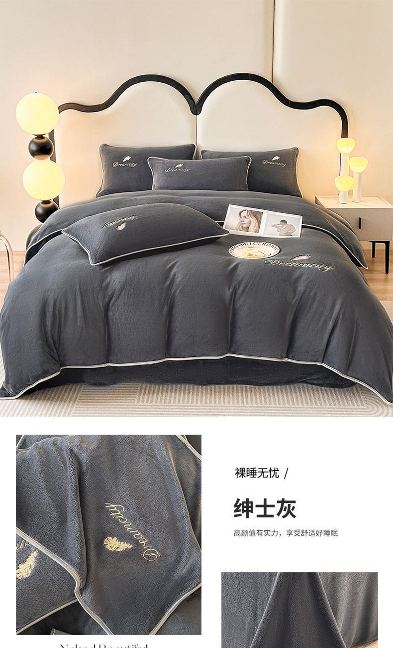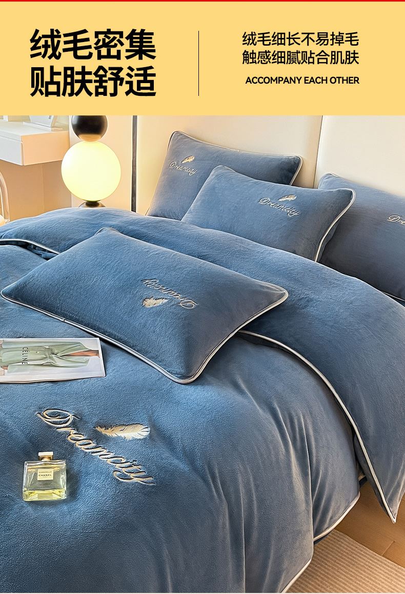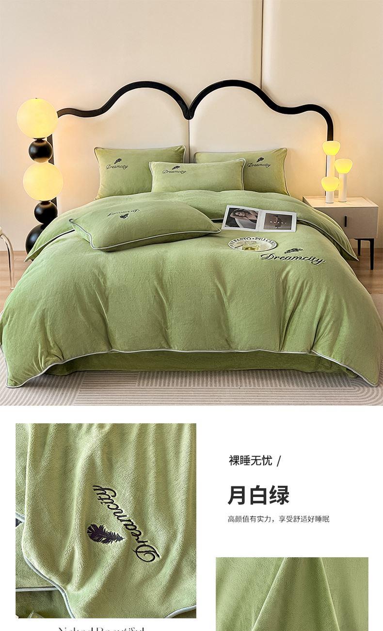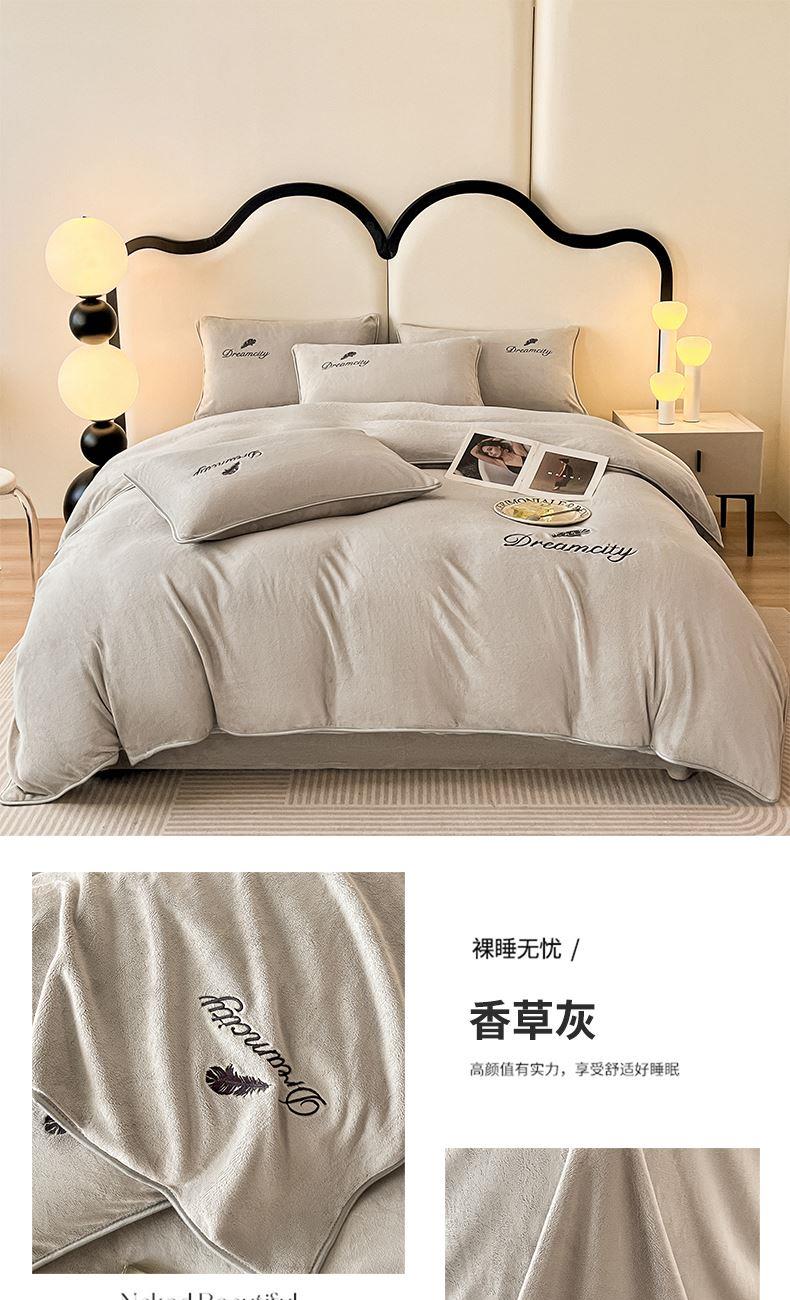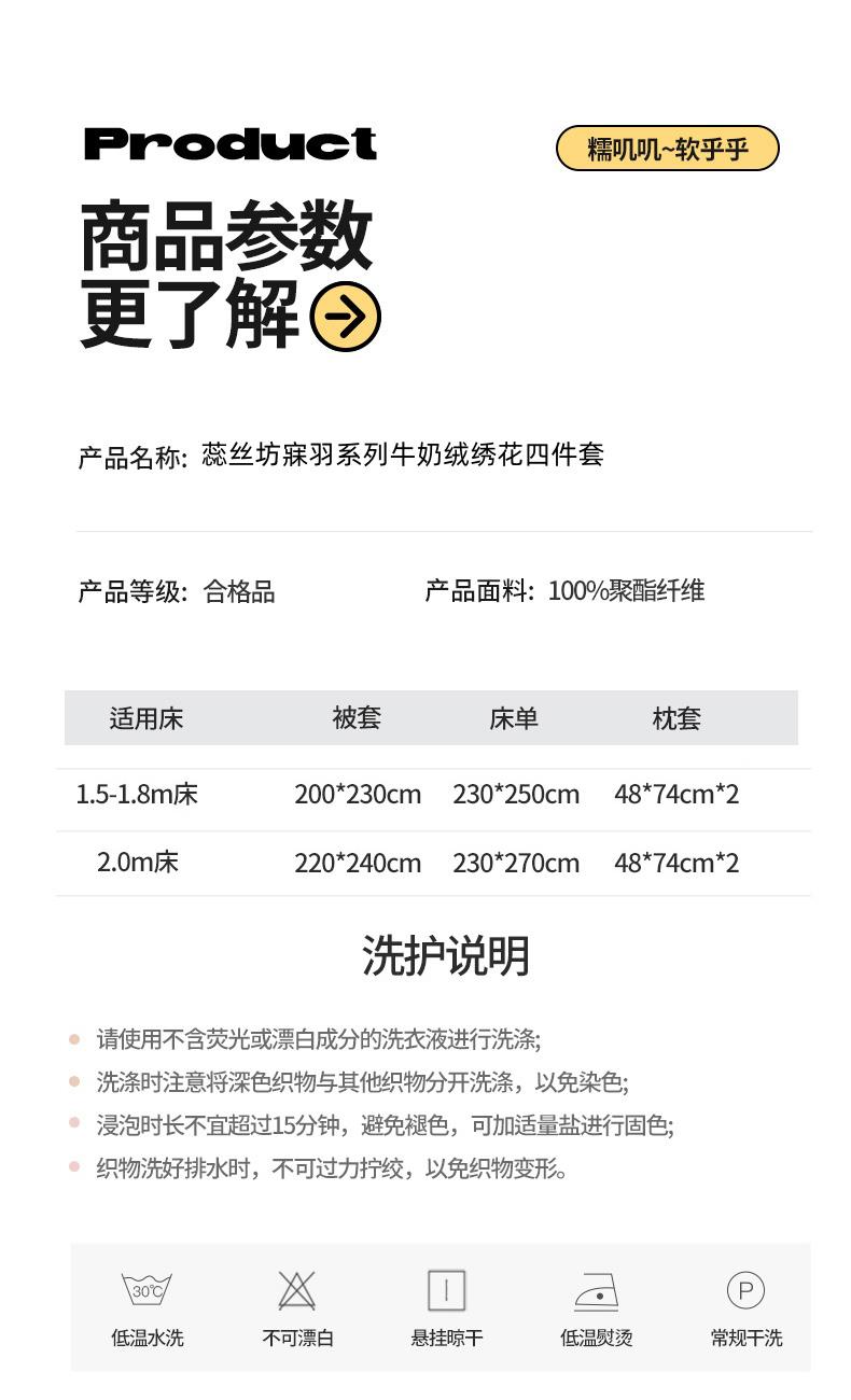 规格:1.5M-1.8M床用 被套200*230cm 床单230*250cm 枕套48*74cm*2 花色:可可粉,宾利蓝,月白绿,香草灰,香槟色,绅士灰,奶芋色 面料:牛奶绒/聚酯纤维 甄选高克重牛奶绒面料,绒毛厚实紧密,手感丰满,绒面细密平整,保暖透气,软柔质感,贴身亲肤,面料植入导静电丝,不会再有起床后静电的困扰。简约纯色,精美刺绣工艺点缀,床品优雅大气,享受舒适的睡眠,精致的床品;新一代健康印染工艺, 可机洗, 水洗。