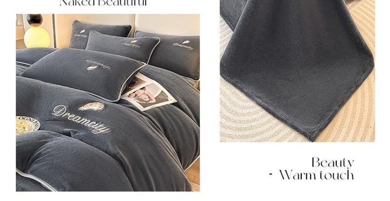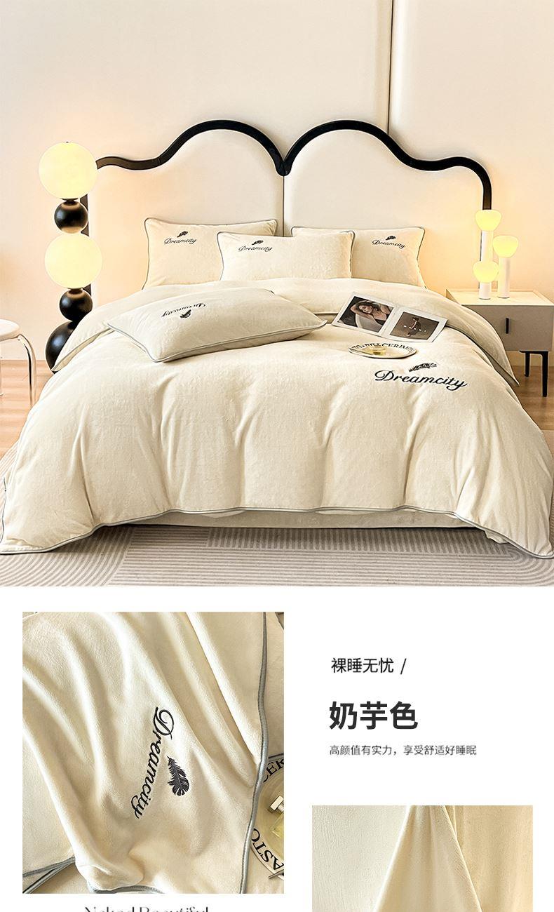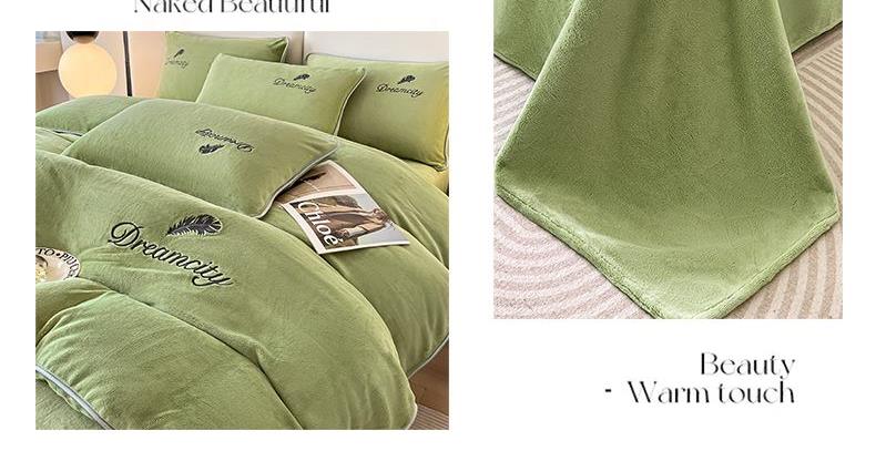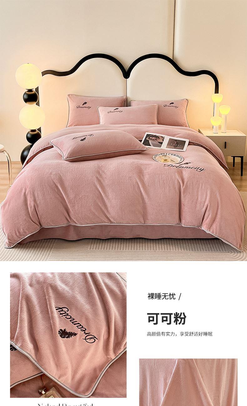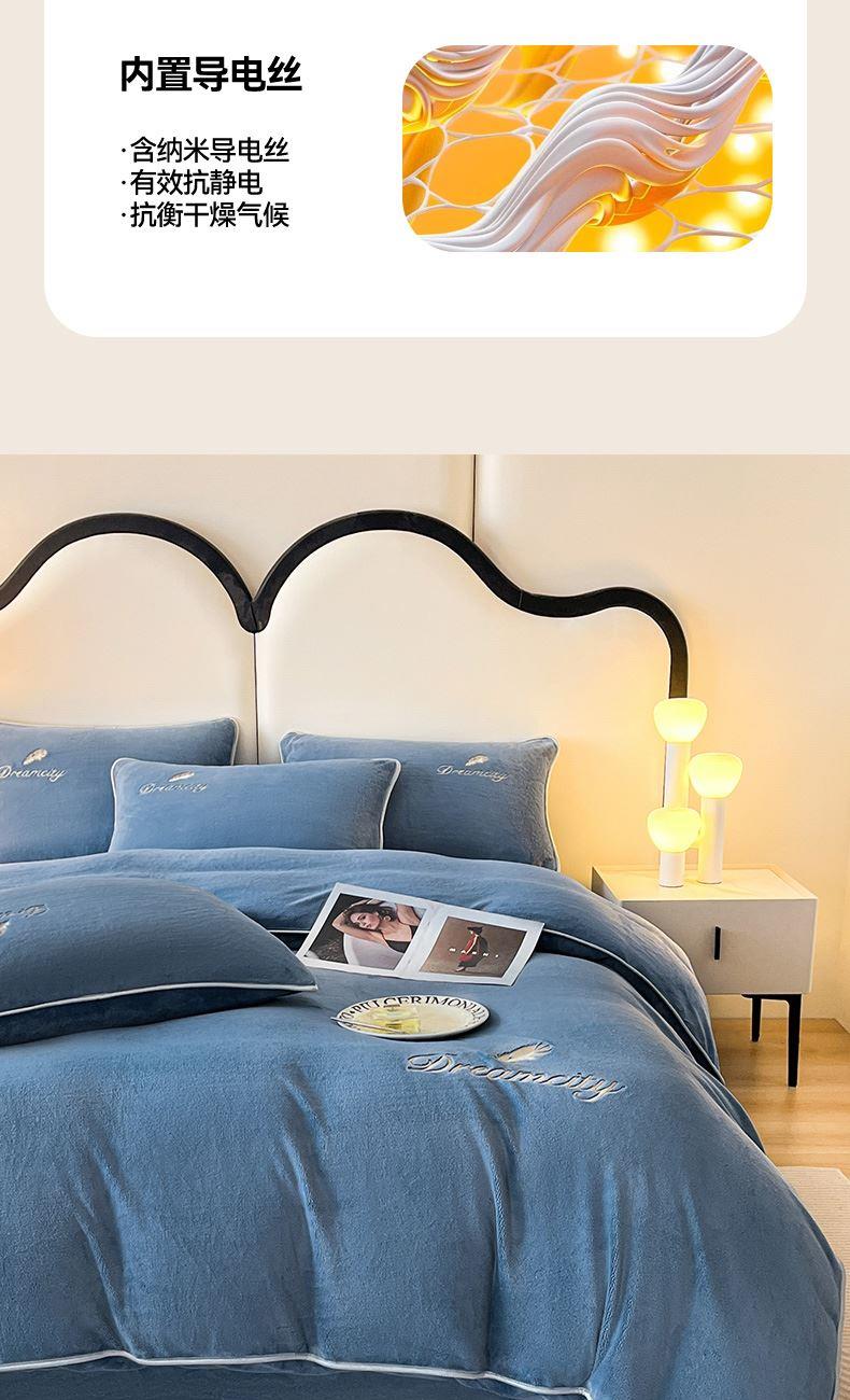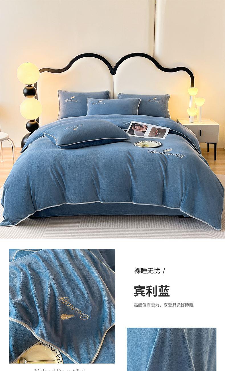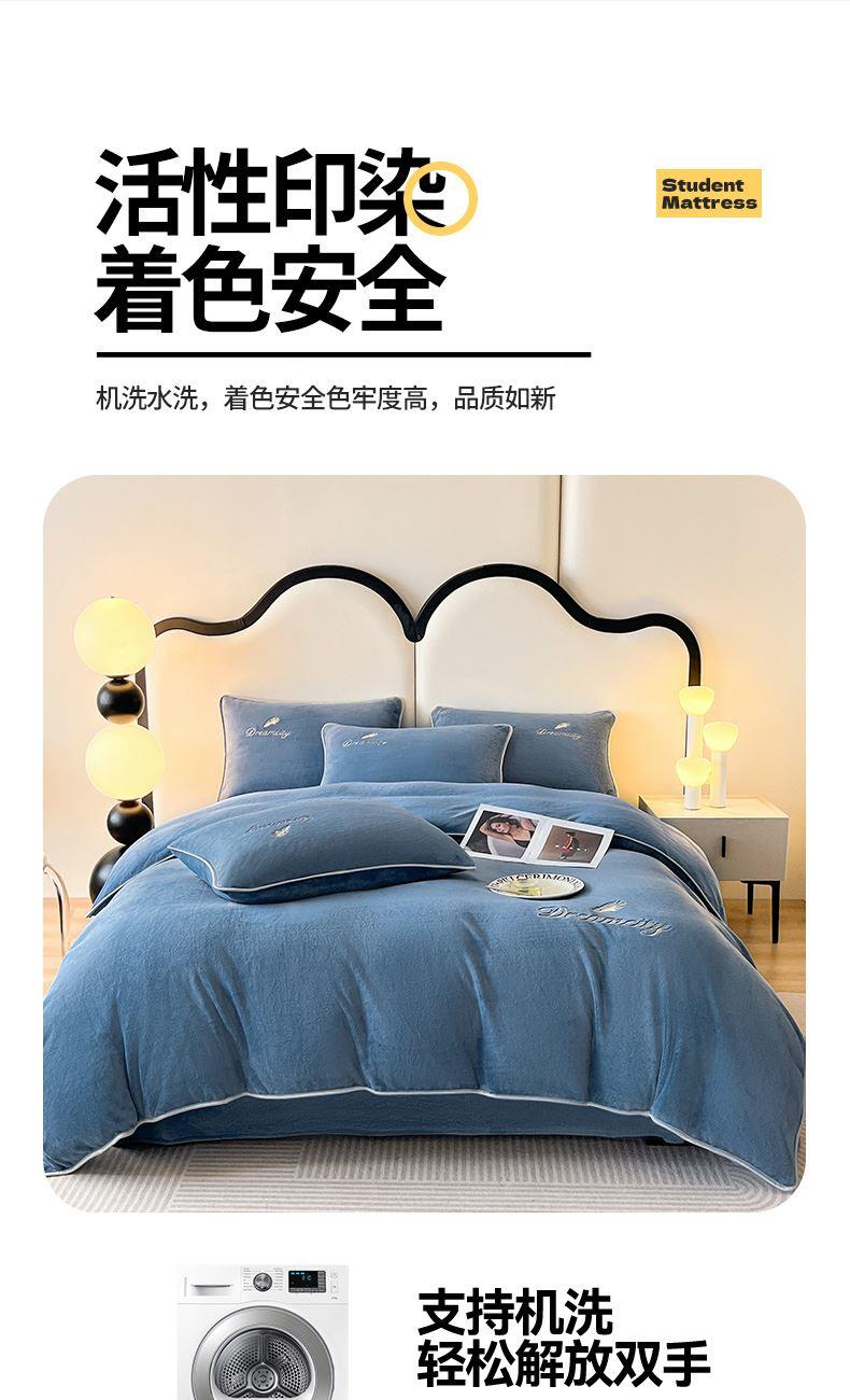 规格:1.5M-1.8M床用 被套200*230cm 床单230*250cm 枕套48*74cm*2 花色:可可粉,宾利蓝,月白绿,香草灰,香槟色,绅士灰,奶芋色 面料:牛奶绒/聚酯纤维 甄选高克重牛奶绒面料,绒毛厚实紧密,手感丰满,绒面细密平整,保暖透气,软柔质感,贴身亲肤,面料植入导静电丝,不会再有起床后静电的困扰。简约纯色,精美刺绣工艺点缀,床品优雅大气,享受舒适的睡眠,精致的床品;新一代健康印染工艺, 可机洗, 水洗。