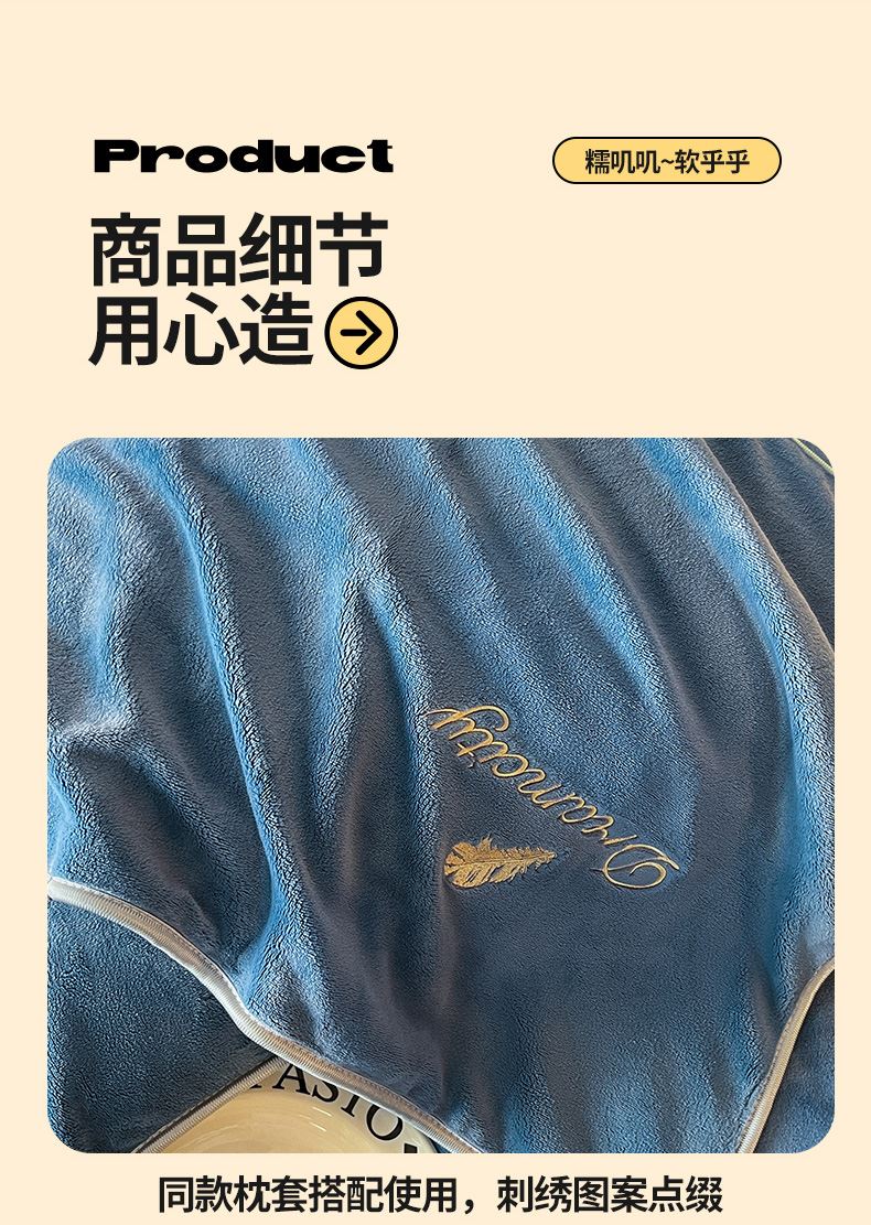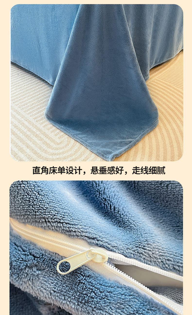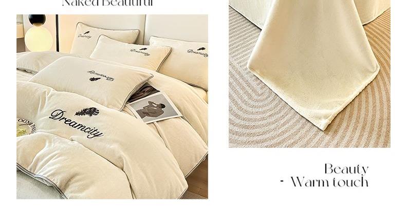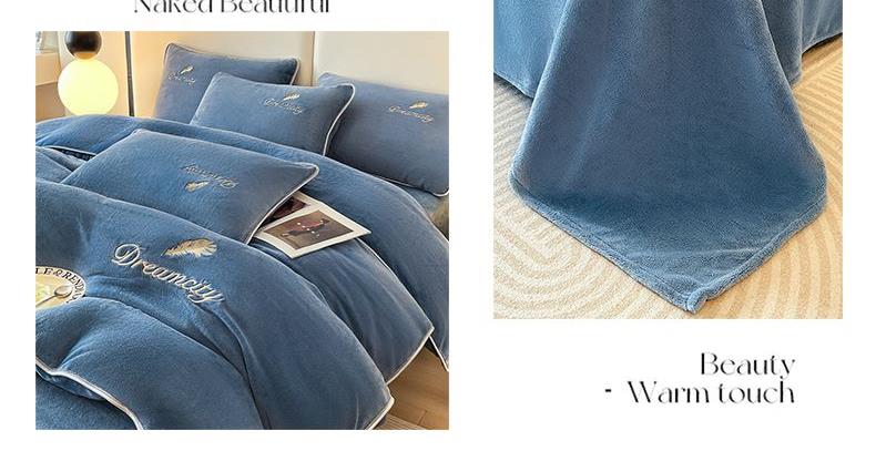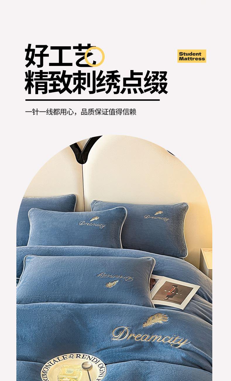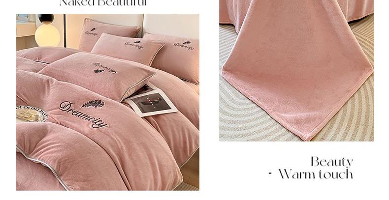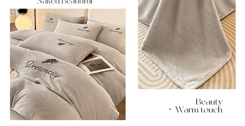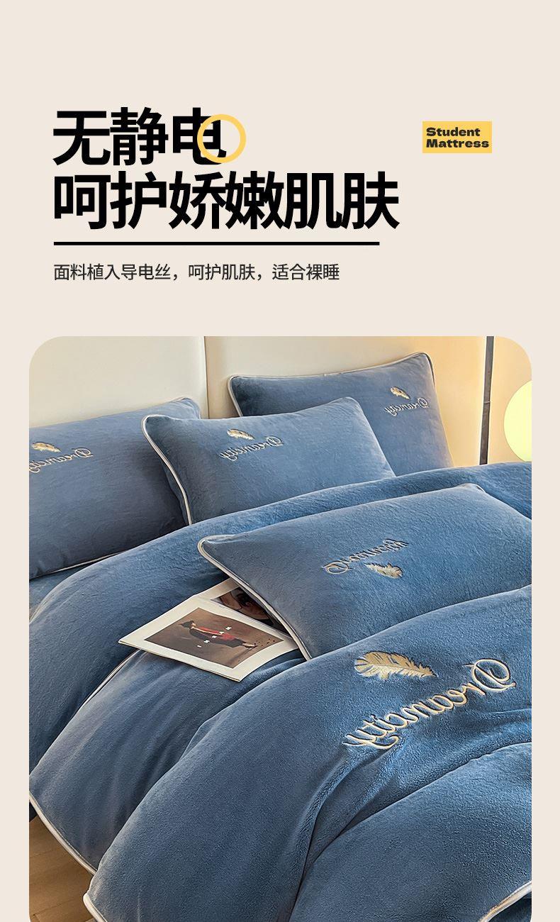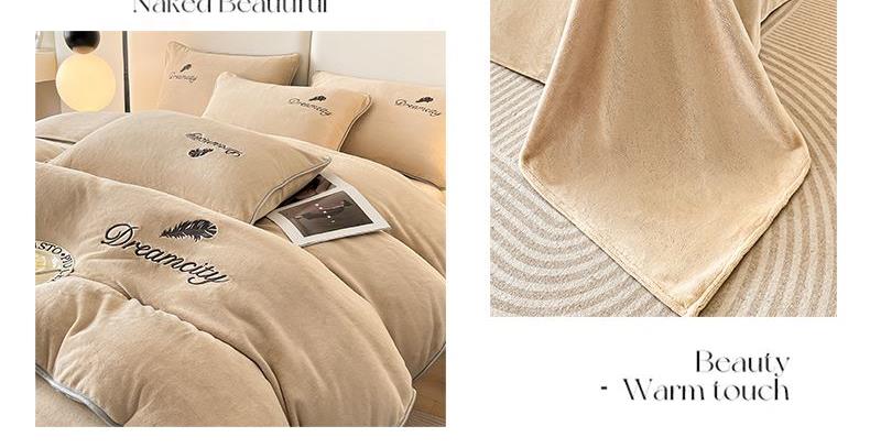 规格:1.5M-1.8M床用 被套200*230cm 床单230*250cm 枕套48*74cm*2 花色:可可粉,宾利蓝,月白绿,香草灰,香槟色,绅士灰,奶芋色 面料:牛奶绒/聚酯纤维 甄选高克重牛奶绒面料,绒毛厚实紧密,手感丰满,绒面细密平整,保暖透气,软柔质感,贴身亲肤,面料植入导静电丝,不会再有起床后静电的困扰。简约纯色,精美刺绣工艺点缀,床品优雅大气,享受舒适的睡眠,精致的床品;新一代健康印染工艺, 可机洗, 水洗。