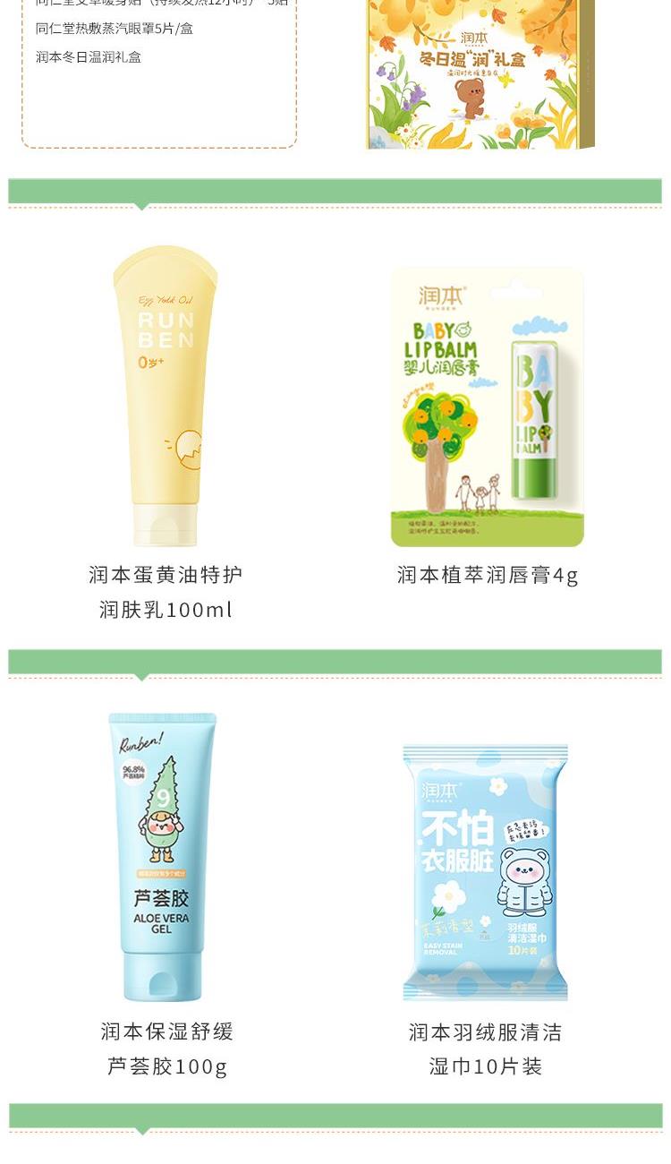 润本蛋黄油特护润肤乳100ml 润本植萃润唇膏4g 润本保湿舒缓芦荟胶100g 润本羽绒服清洁湿巾10片装 同仁堂艾草暖身贴(持续发热12小时)*5贴 同仁堂热敷蒸汽眼罩5片/盒 思珀莱冬日温润礼盒